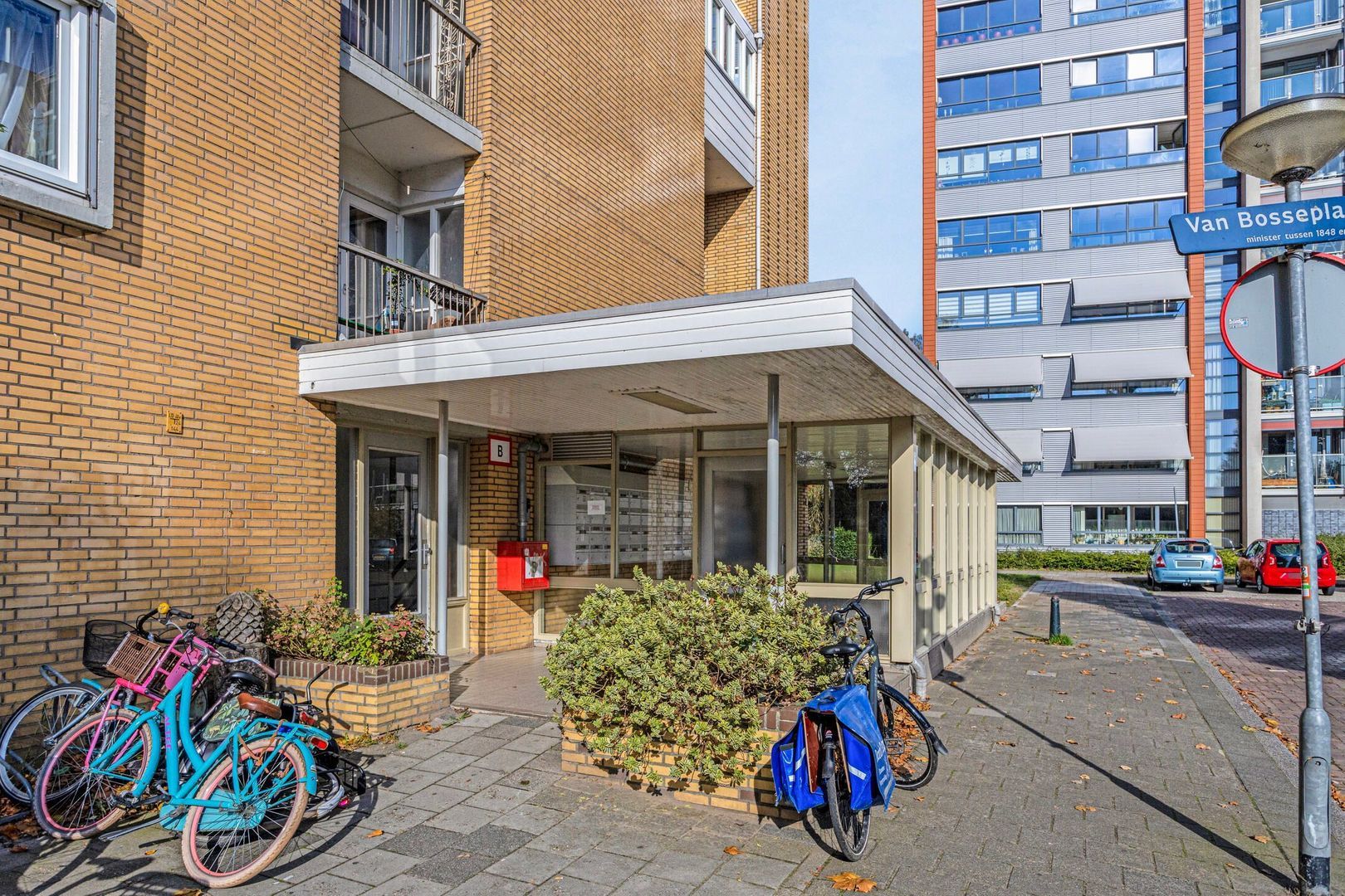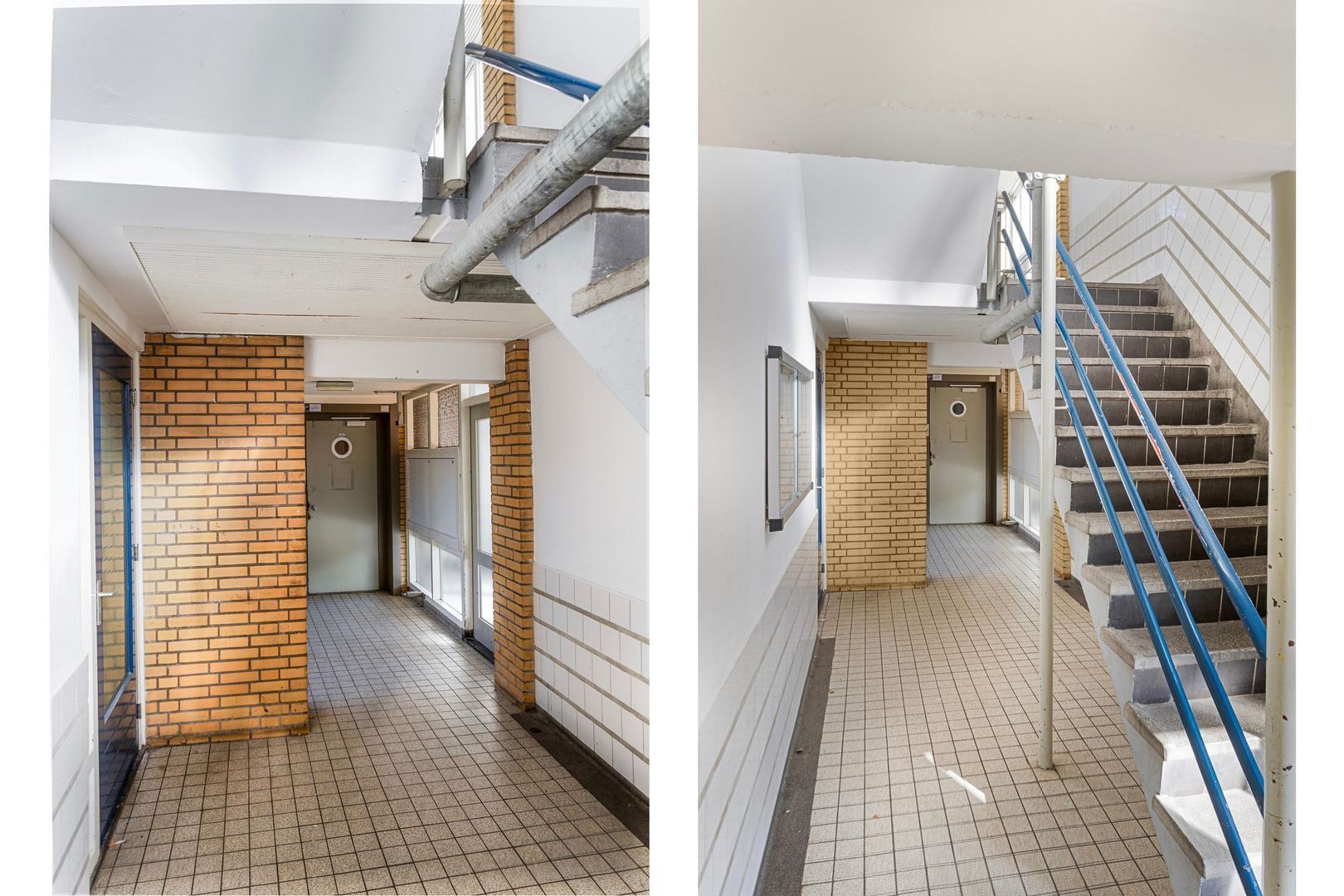 Afgesloten entree met bellentableau en brievenbussen. Entreehal met trappenhuis, liftinstallatie en toegang tot de bergingen.