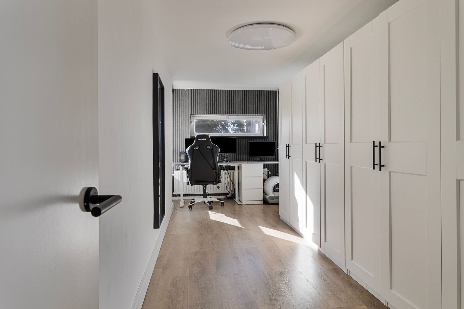 Zeer ruime woonkamer met een veel natuurlijk lichtinval. De woonkamer is deels voorzien van gladde wanden en deels voorzien van sierbehang, de vloer is afgewerkt met een fraaie houtlook laminaatvloer welke is doorgelegd over de gehele verdieping.