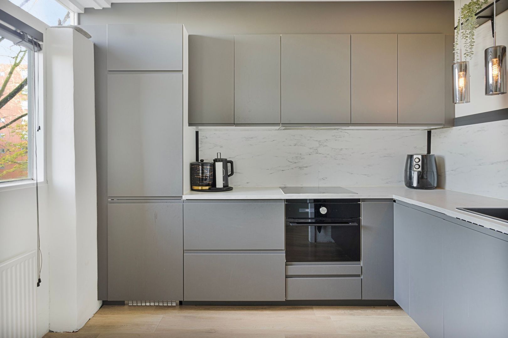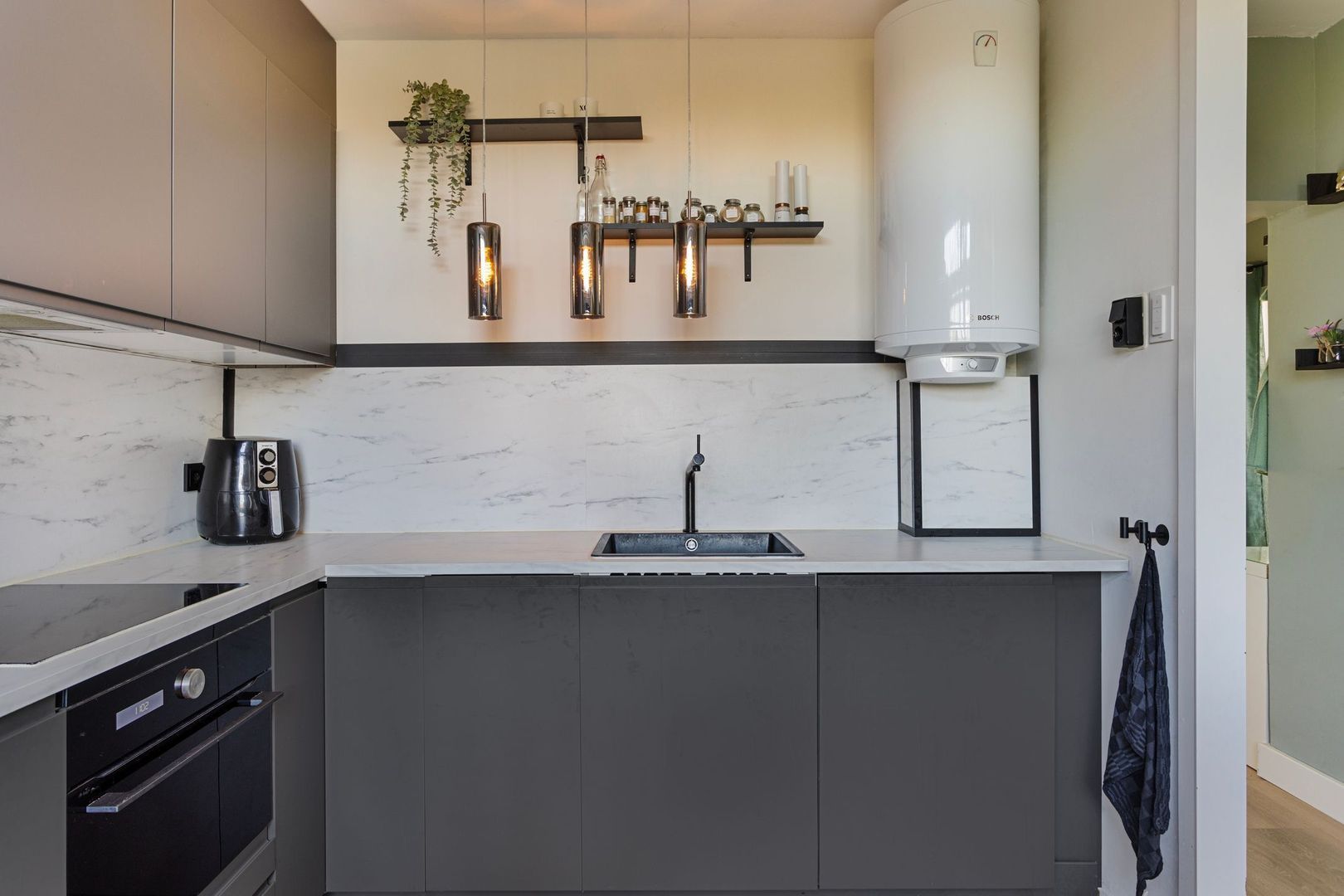 De keuken is in 2021 geplaatst en heeft een keukenblok in L-opstelling met antraciet fronten en een eikenfineer werkblad. De keuken is voorzien van de navolgende inbouwapparatuur; vaatwasser, 4-pits inductie kookplaat, combi-oven, afzuigkap en een koel-/vriescombinatie. Tevens vindt u in de keuken de opstelling van de 120 liter elektrische boiler.