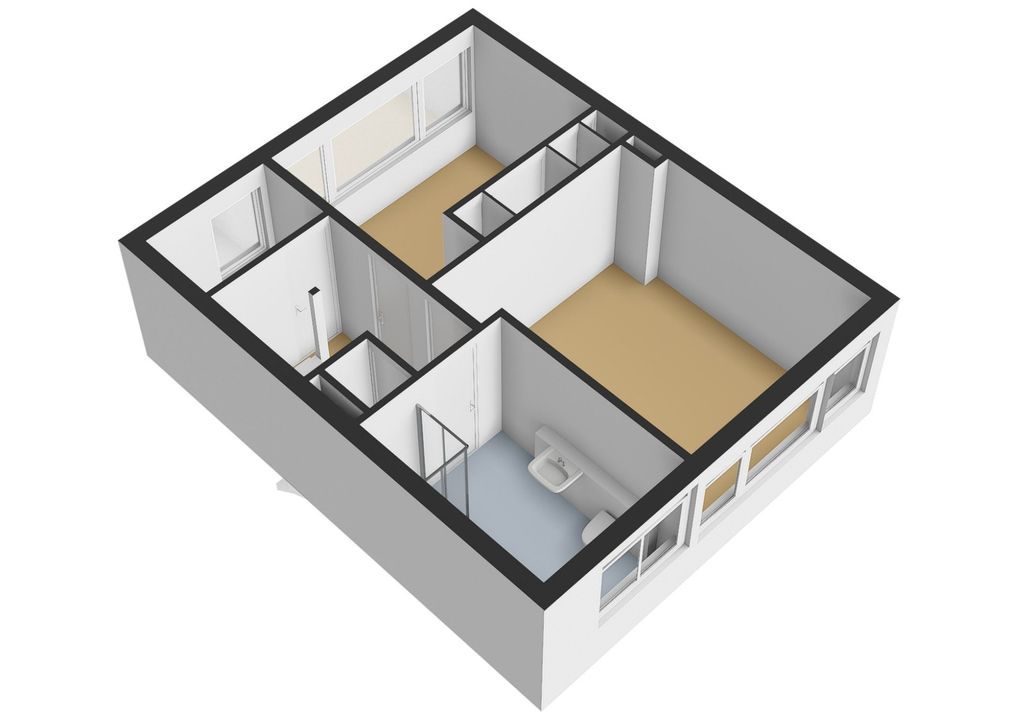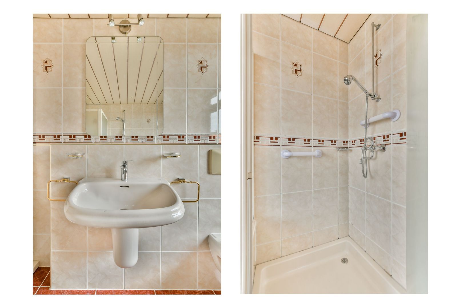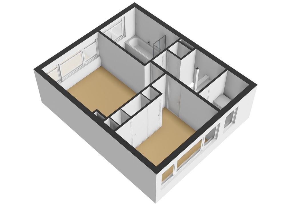 De voormalige derde slaapkamer is in de jaren negentig verbouwd tot een comfortabele badkamer, uitgevoerd met kwaliteitsmaterialen. Deze is voorzien van een betonvloer, kunststof ligbad, douchecabine, wastafelmeubel, betegeling tot aan het plafond en een raam met daglicht en ventilatie. Aan de voorzijde bevindt zich een natte ruimte met wasmachineaansluiting, volledig betegeld.