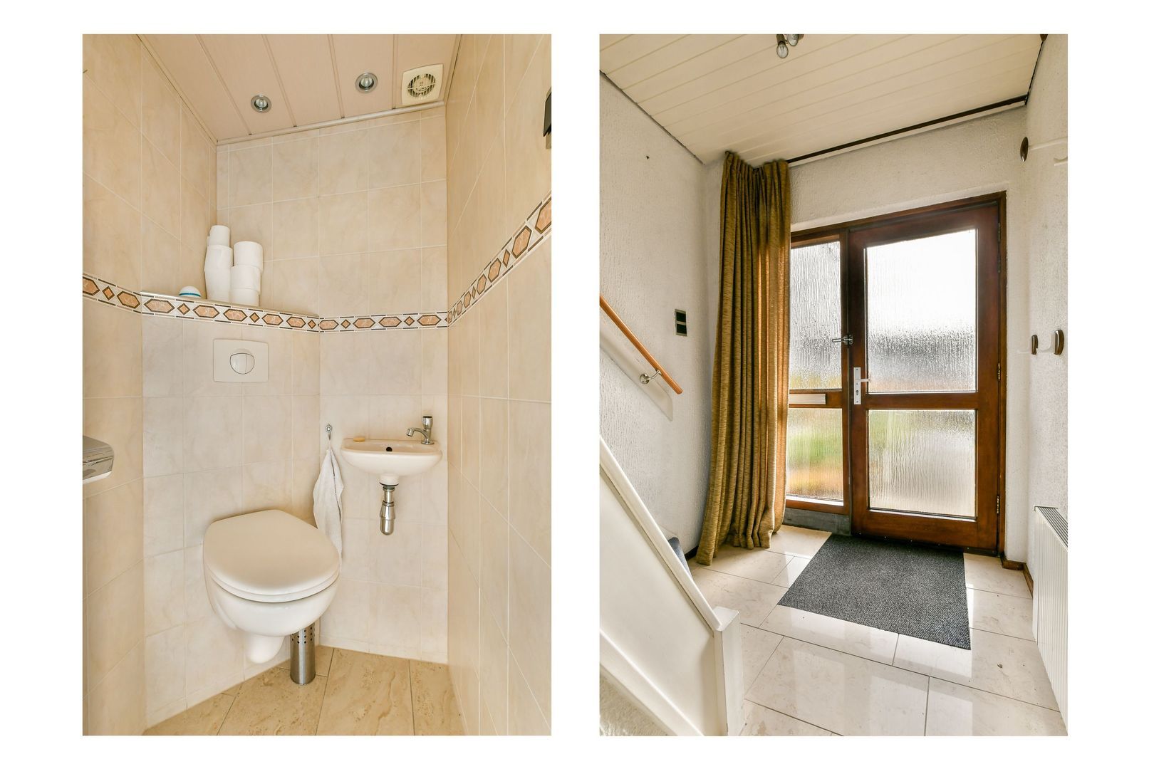 Entree met ruime hal, trapkast en toilet in hangende uitvoering met fonteintje. De vloer is afgewerkt met fraaie tegels in travertinlook. Het toilet is voorzien van systeemplafond met ingebouwde verlichting en mechanische ventilatie.