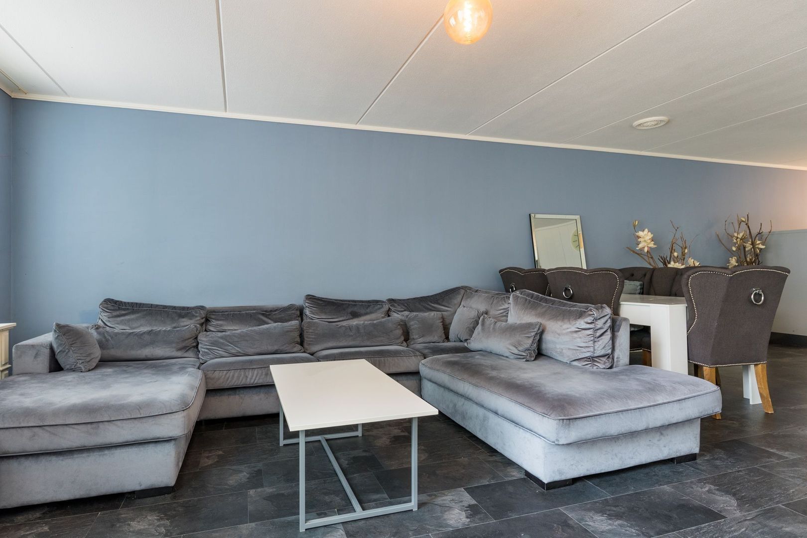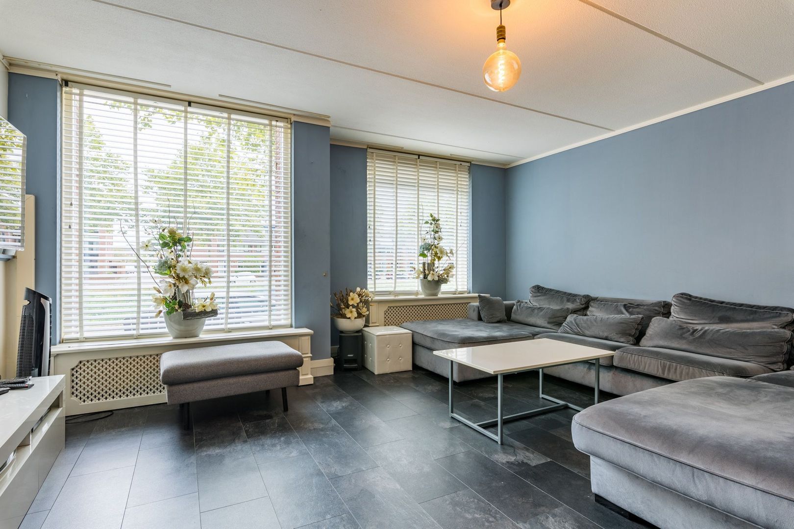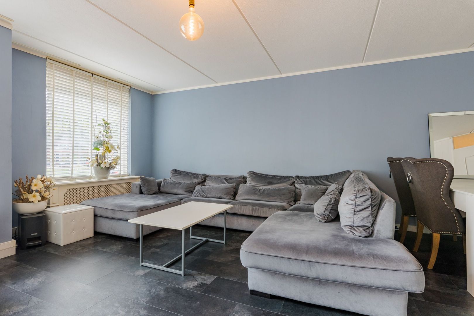 Ruime, speels ingedeelde woonkamer welke is voorzien van een laminaatvloer (onder de laminaatvloer ligt een Italiaanse marmer plavuizenvloer met vloerverwarming).