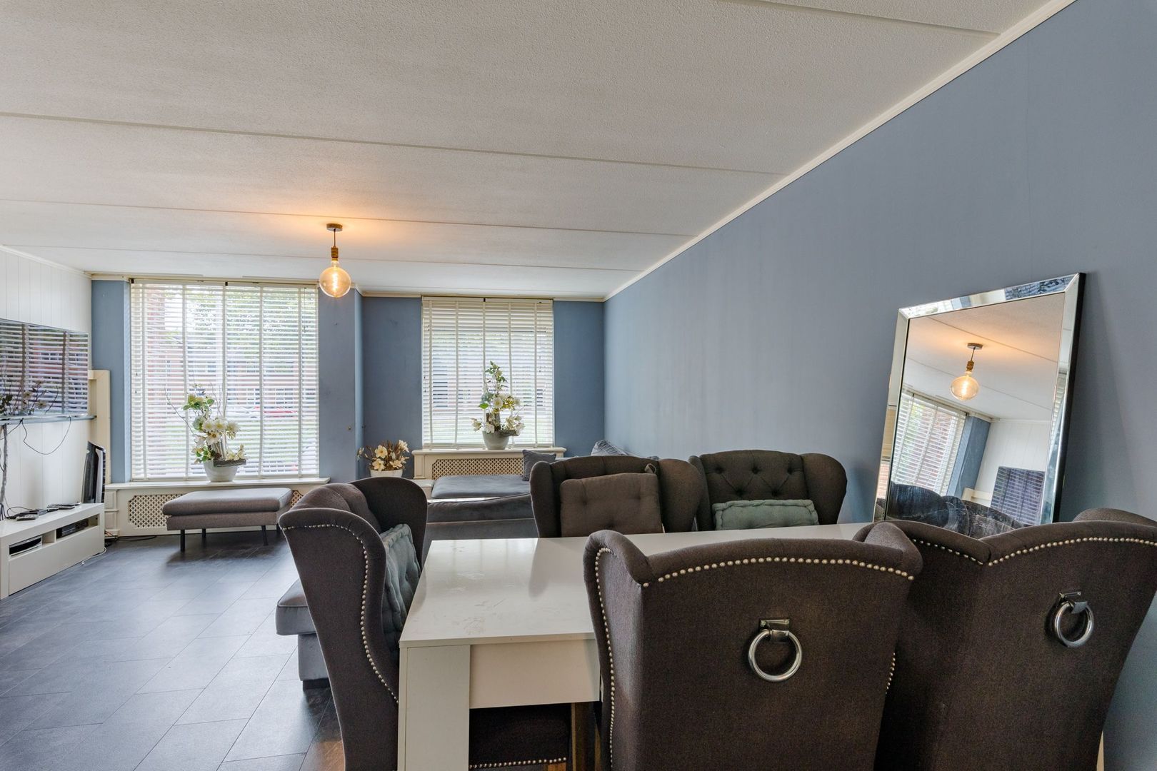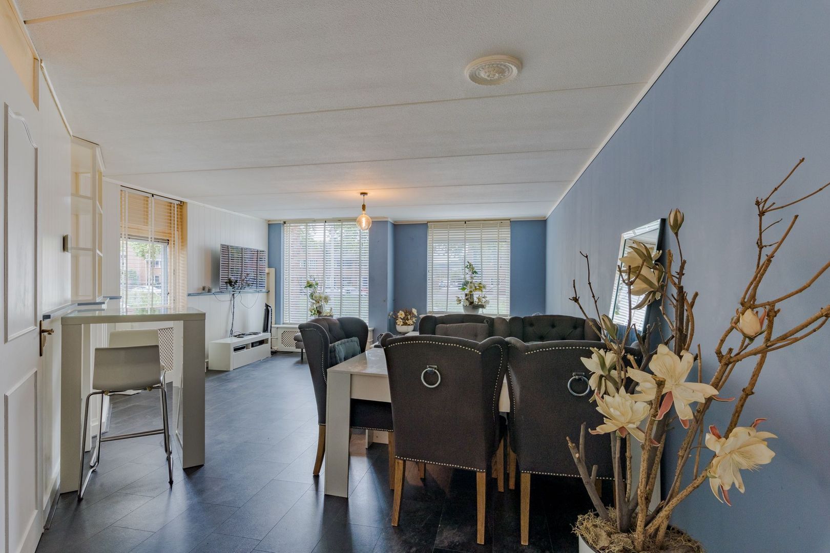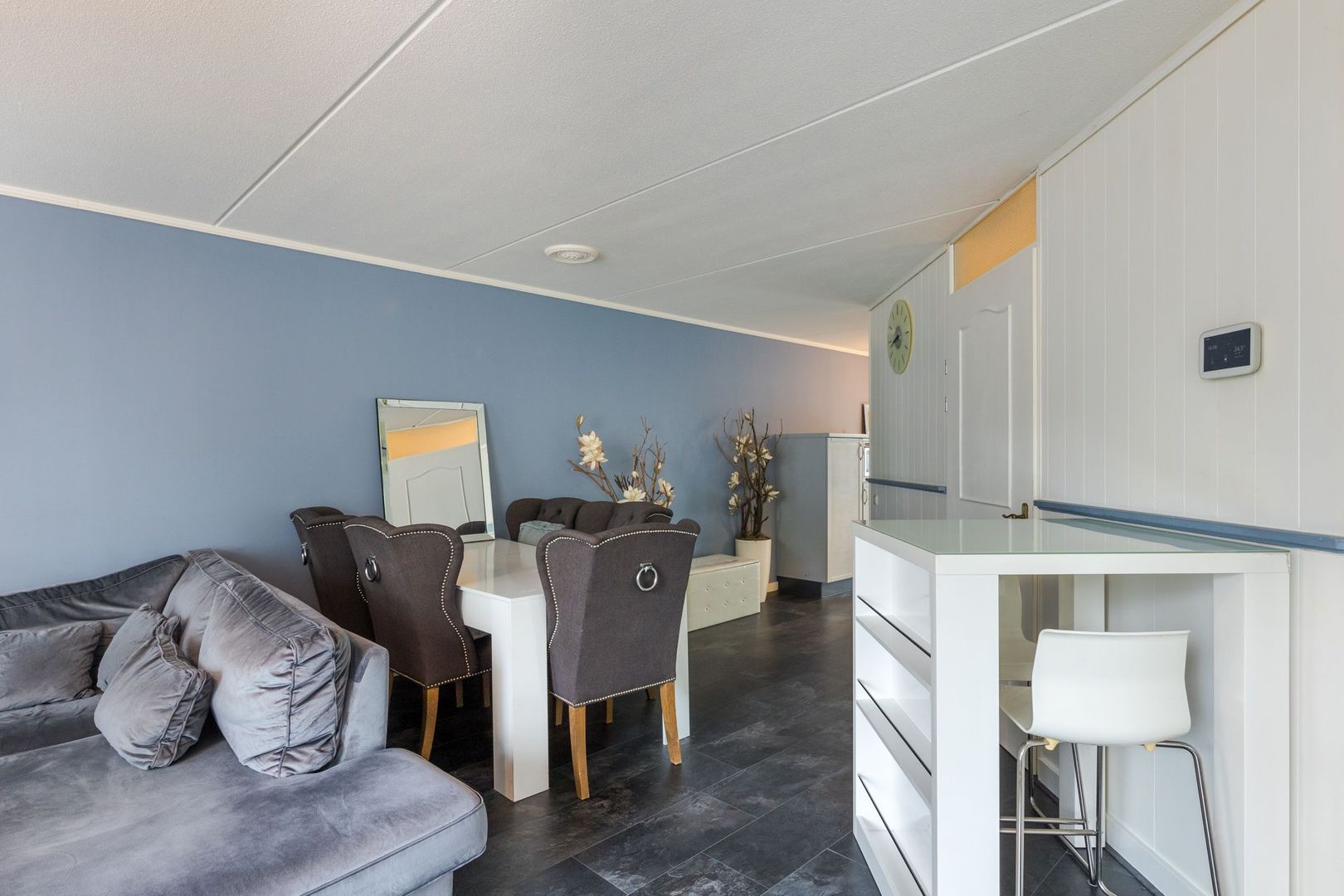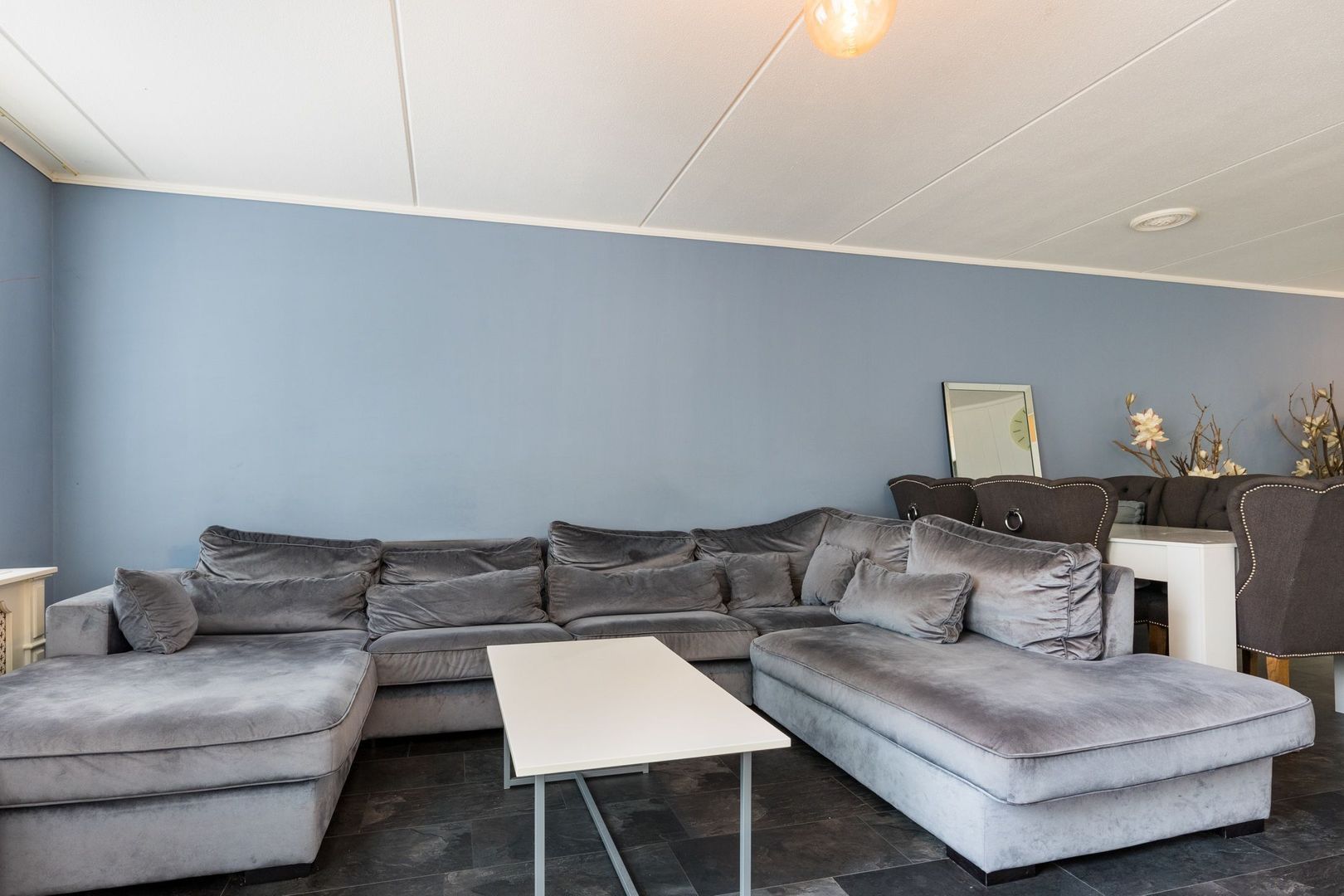 Ruime, speels ingedeelde woonkamer welke is voorzien van een laminaatvloer (onder de laminaatvloer ligt een Italiaanse marmer plavuizenvloer met vloerverwarming).