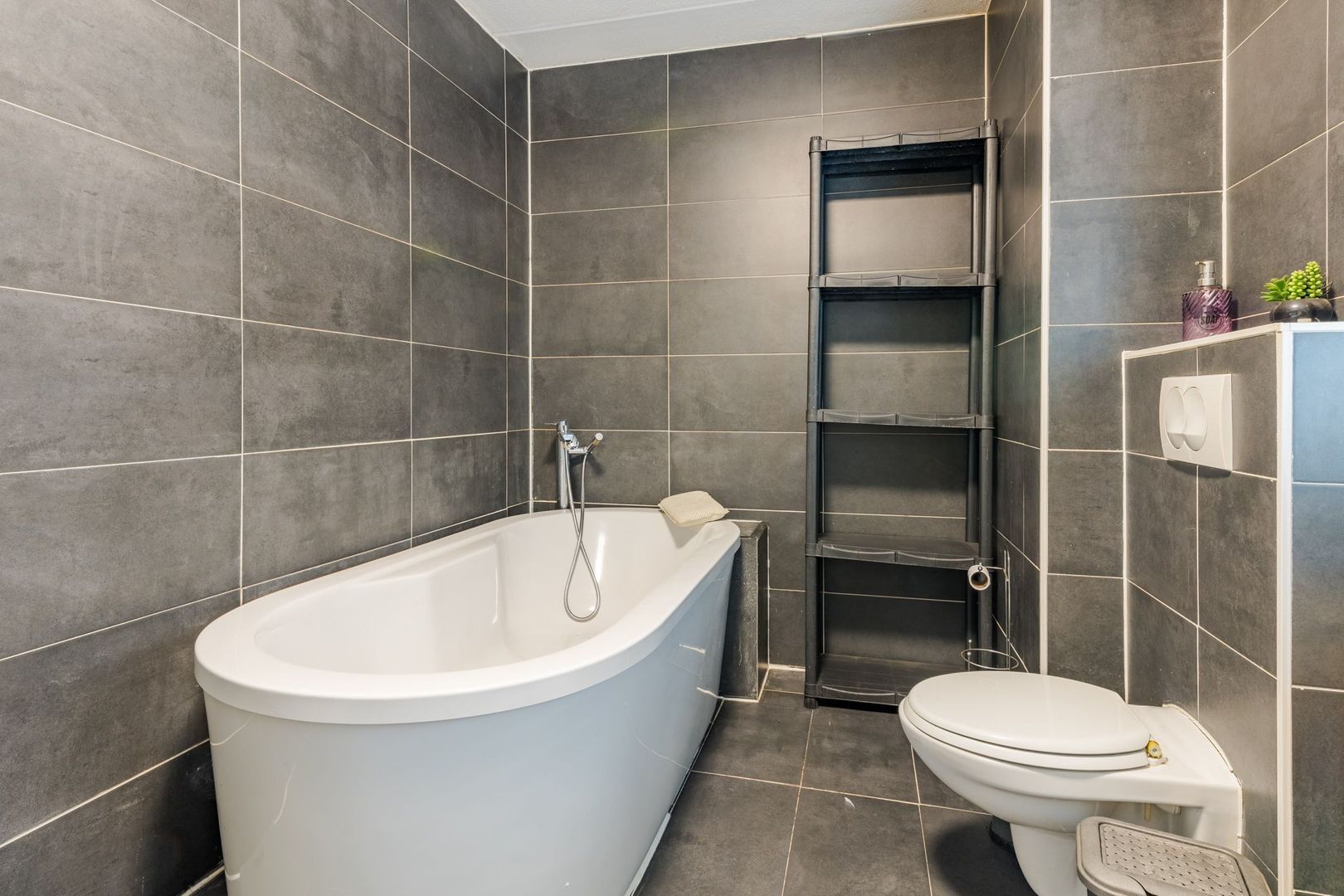 De badkamer van 8 m2 heeft een luxe afwerking met ligbad, zwevend toilet, luxe wastafel met meubel en douchehoek met glazen spatscherm. Er is gekozen voor grijze tegels met aan 1 wand marmerlook tegels.