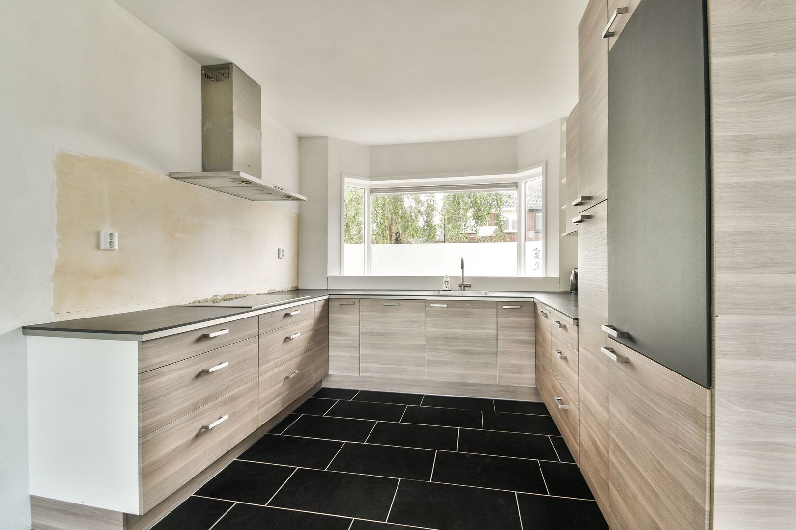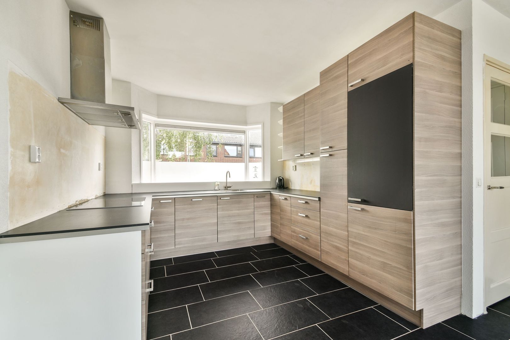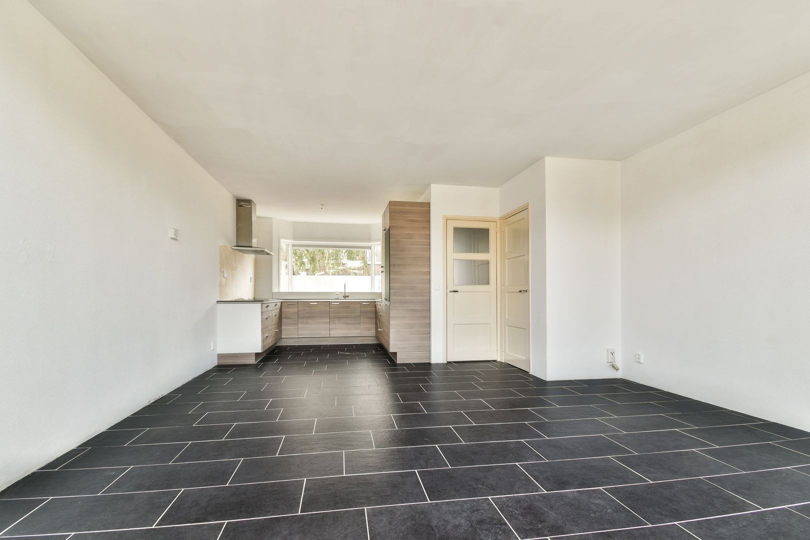 Ruime woonkamer met open keuken van totaal ca. 34 m2. De woonkamer is voorzien van een tegelvloer met vloerverwarming, gespachtelde wanden en een open keuken in U-opstelling met de navolgende apparatuur koel-/vriescombi, vaatwasser, inductie kookplaat en afzuigkap. Toilet is functioneel maar nooit afgemaakt.