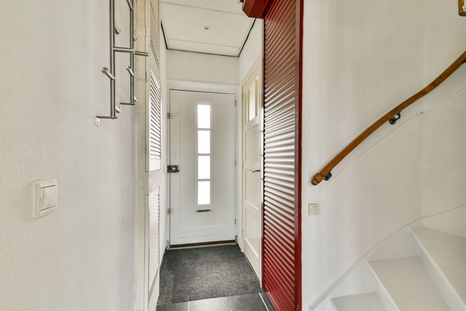 Ruime voortuin, entree, hal met toilet, kast met wasmachine en drogeraansluiting, trap naar de eerste verdieping en toegang tot de woonkamer.