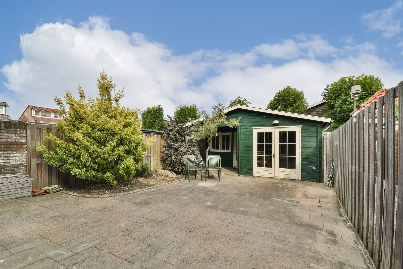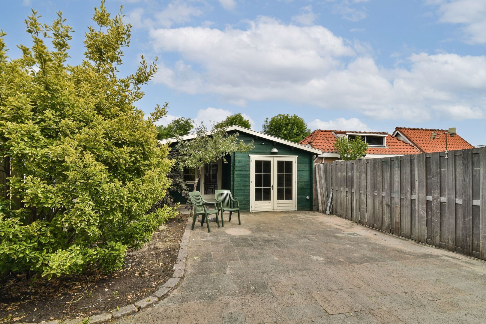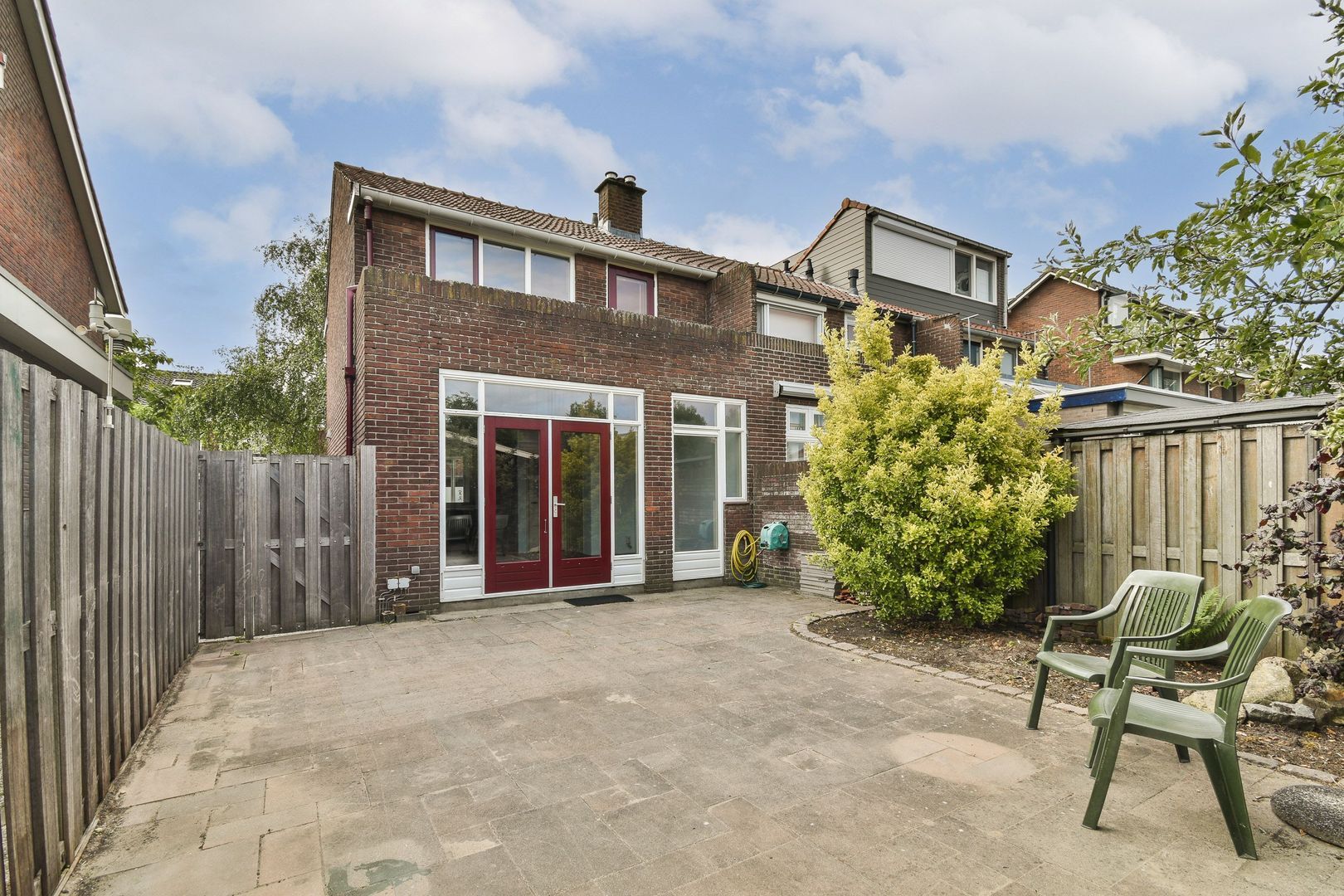 Via de openslaande deuren bereikt u de heerlijke achtertuin. De tuin heeft een mooie mix van berg-/klusruimte, betegeling en groen.