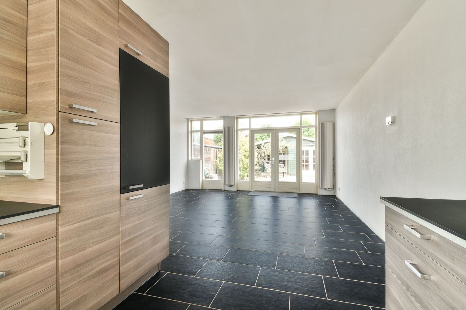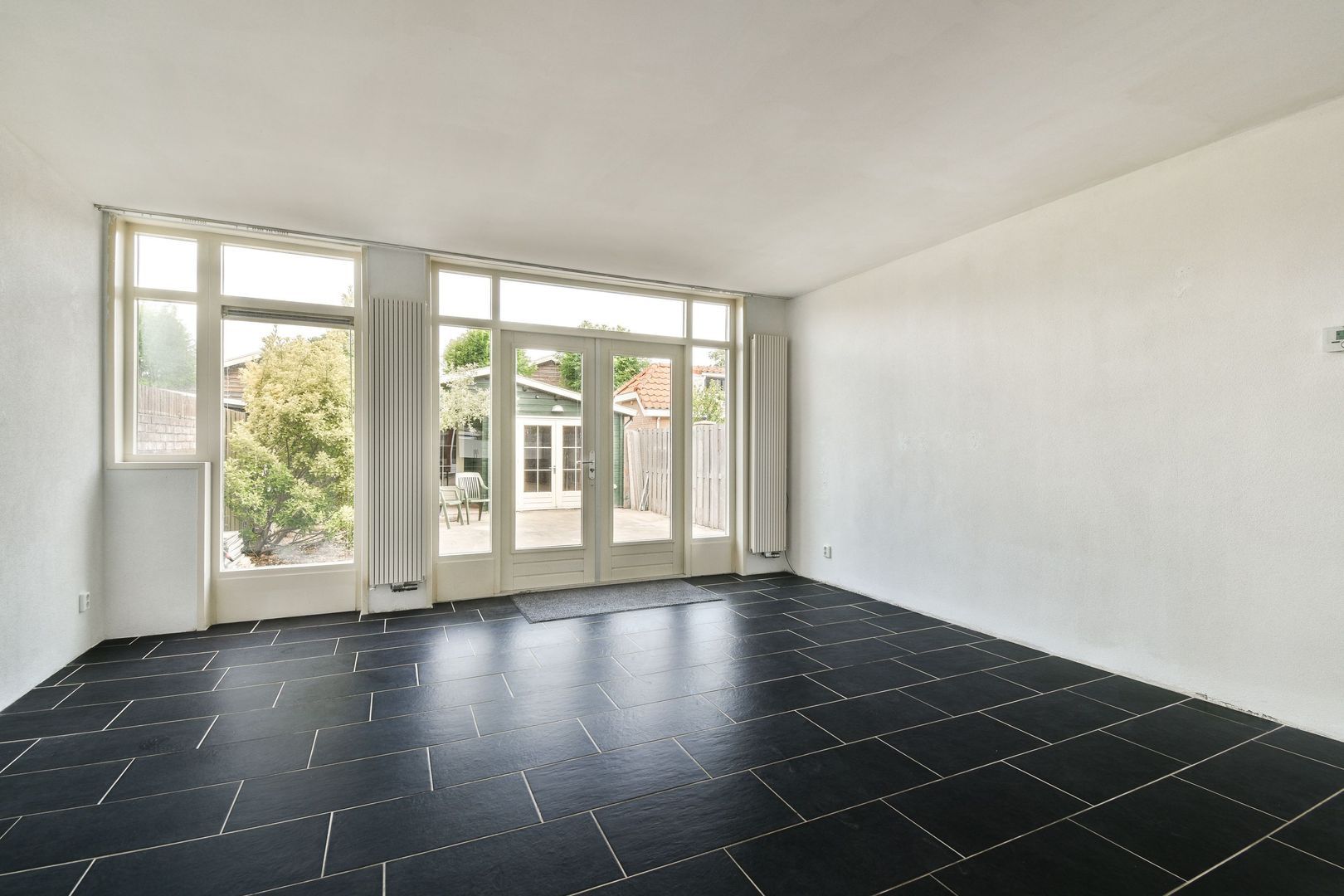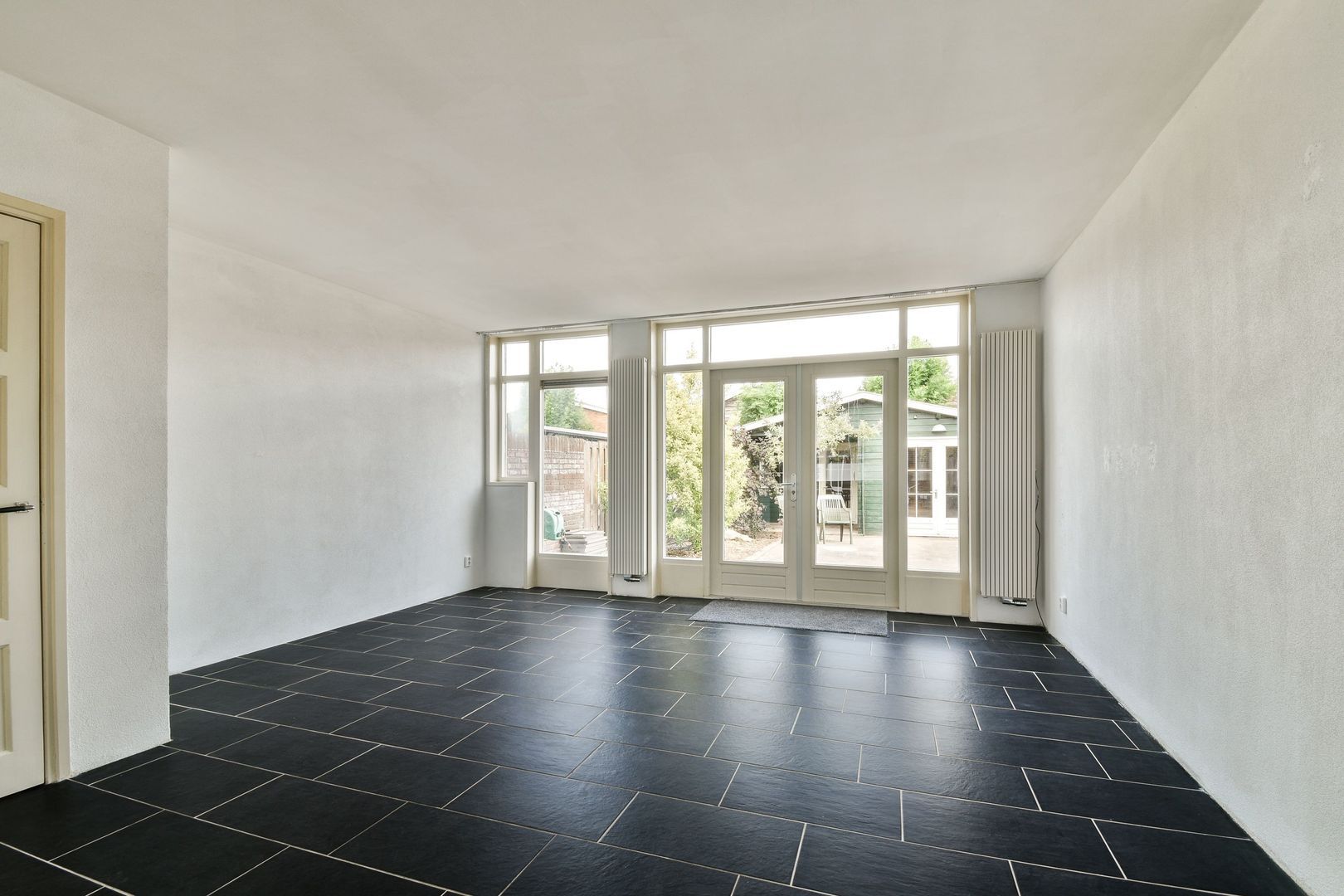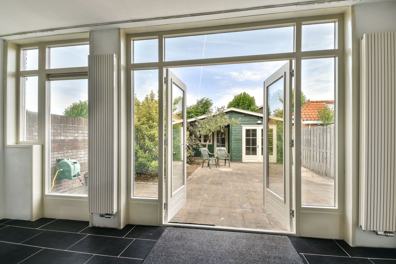 Via de openslaande deuren bereikt u de heerlijke achtertuin. De tuin heeft een mooie mix van berg-/klusruimte, betegeling en groen.