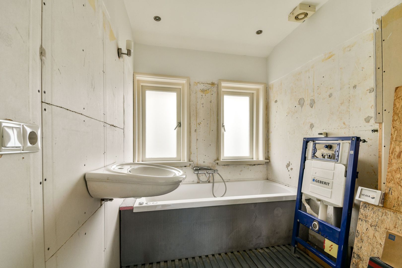 De badkamer bevindt zich aan de voorzijde en is nooit afgemaakt. Er is een ligbad aanwezig en voorbereidingen voor een wastafel. Ook is er een voorbereiding voor een 2e toilet.