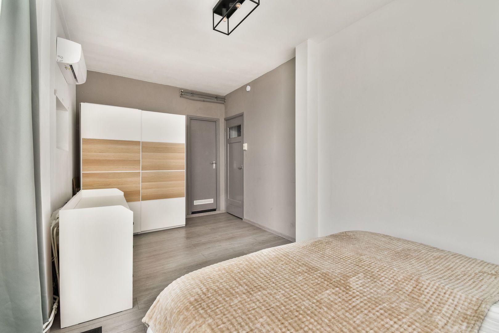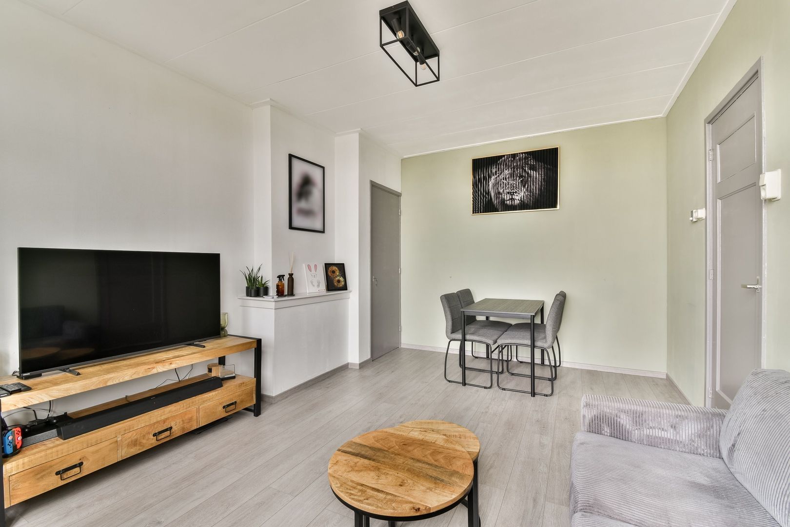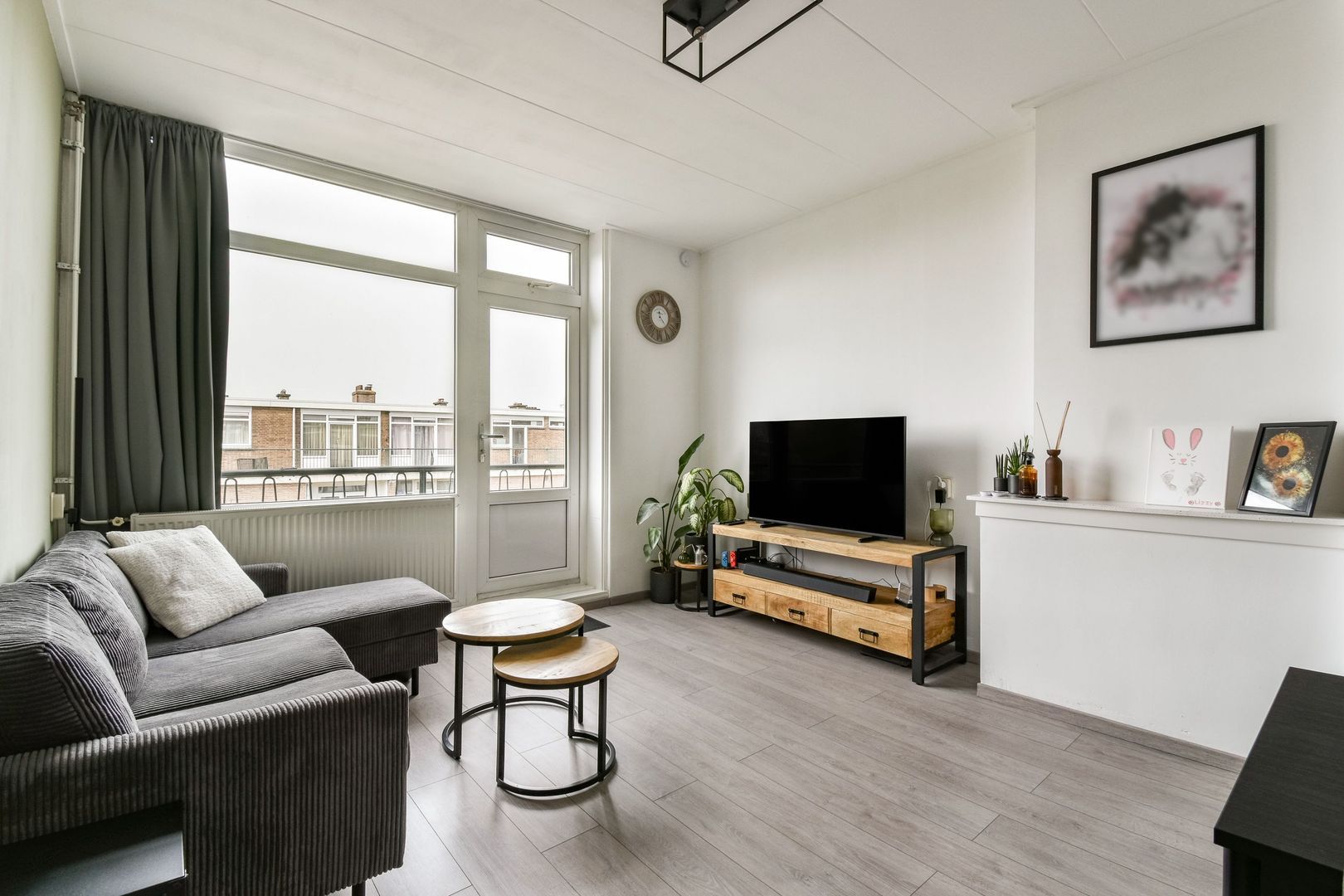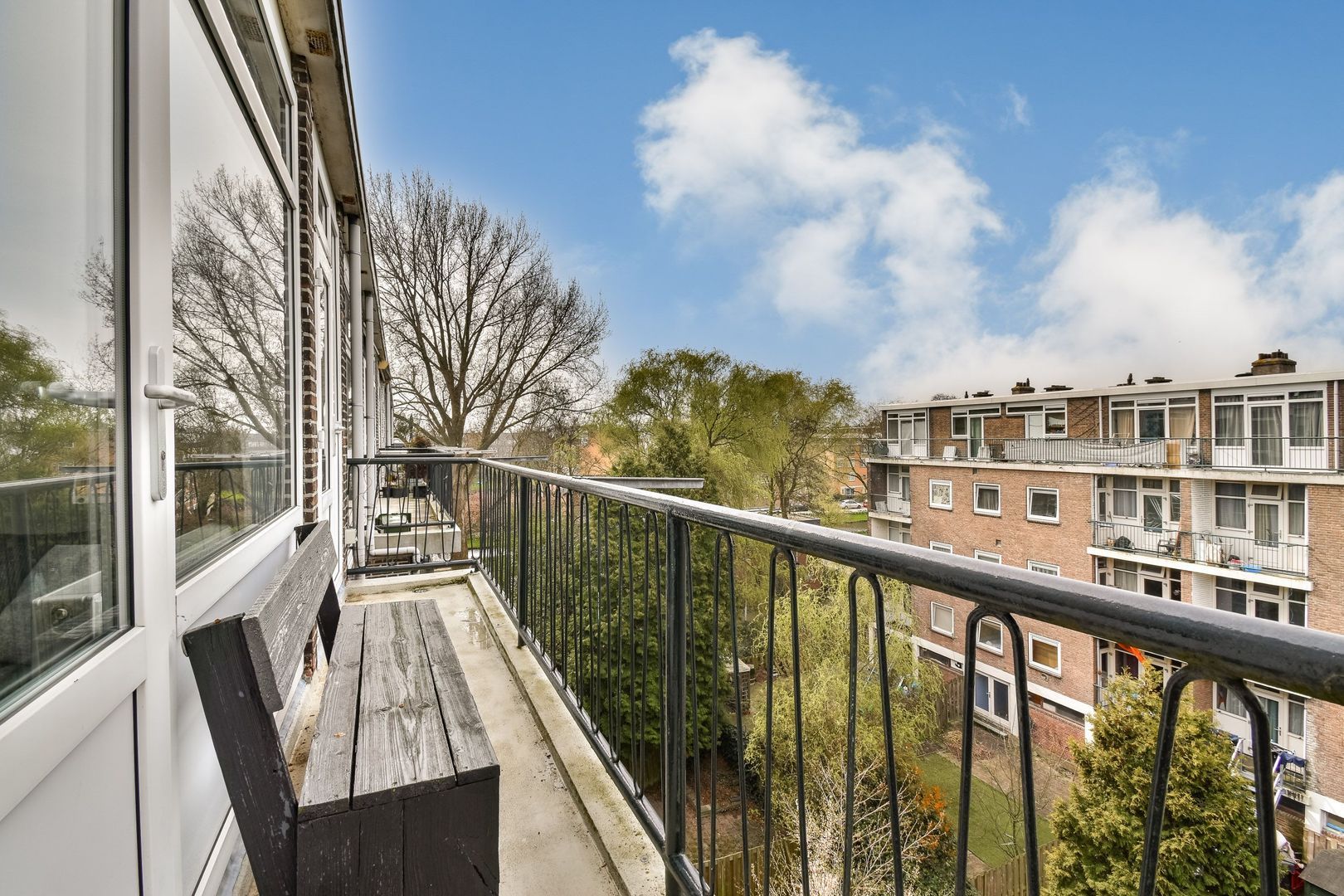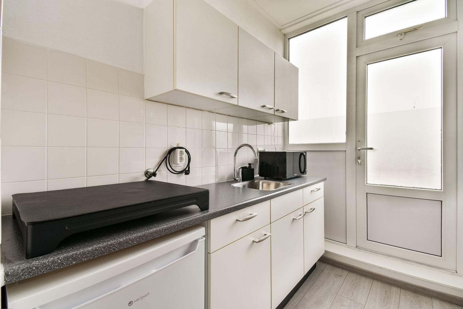 Aan de achterzijde bevindt zich de witte keuken met losse apparatuur en toegang tot het balkon.