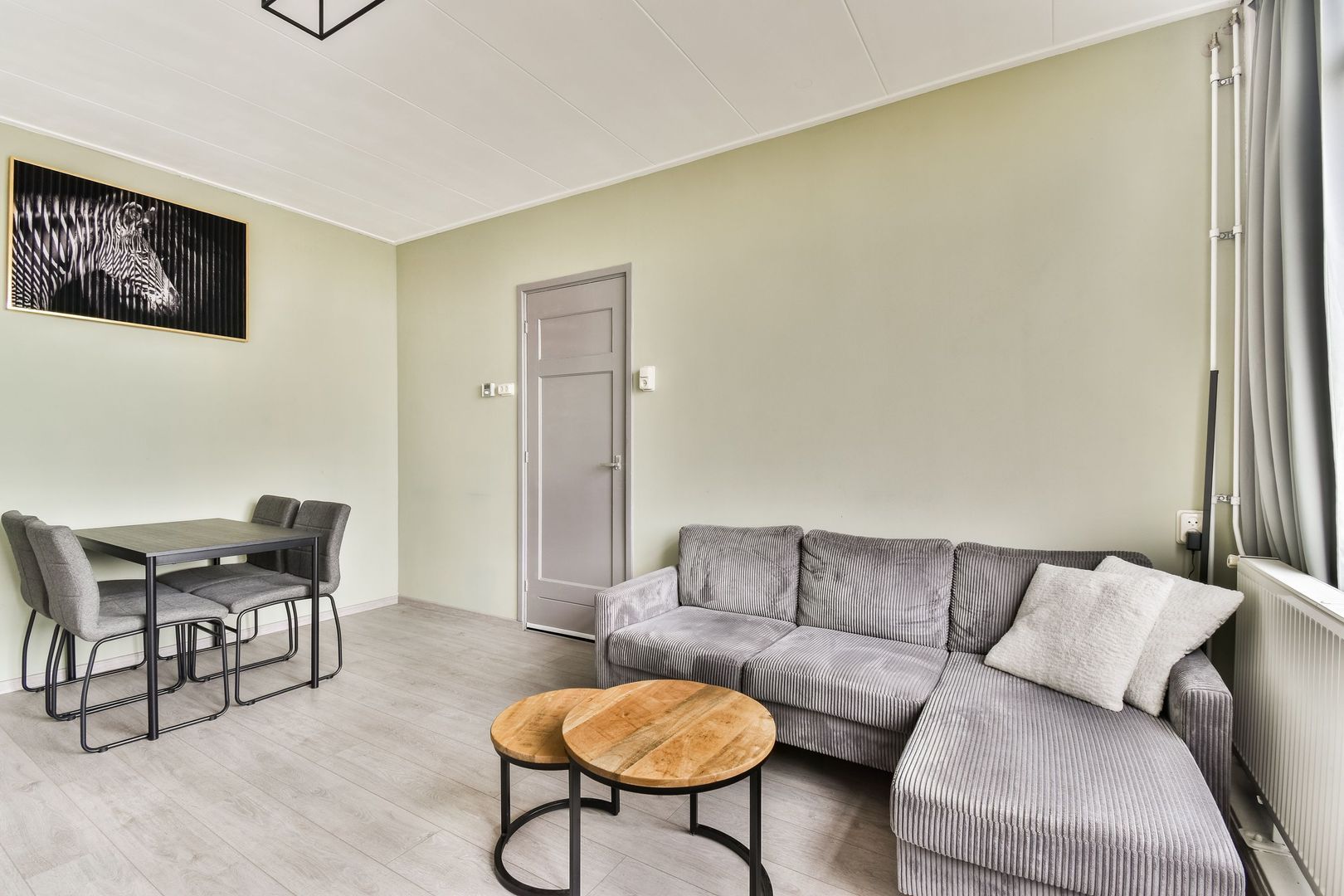 De woonkamer van 16 m2 heeft een prettige lichtinval, een hoog plafond en beschikt over een opbergkast.