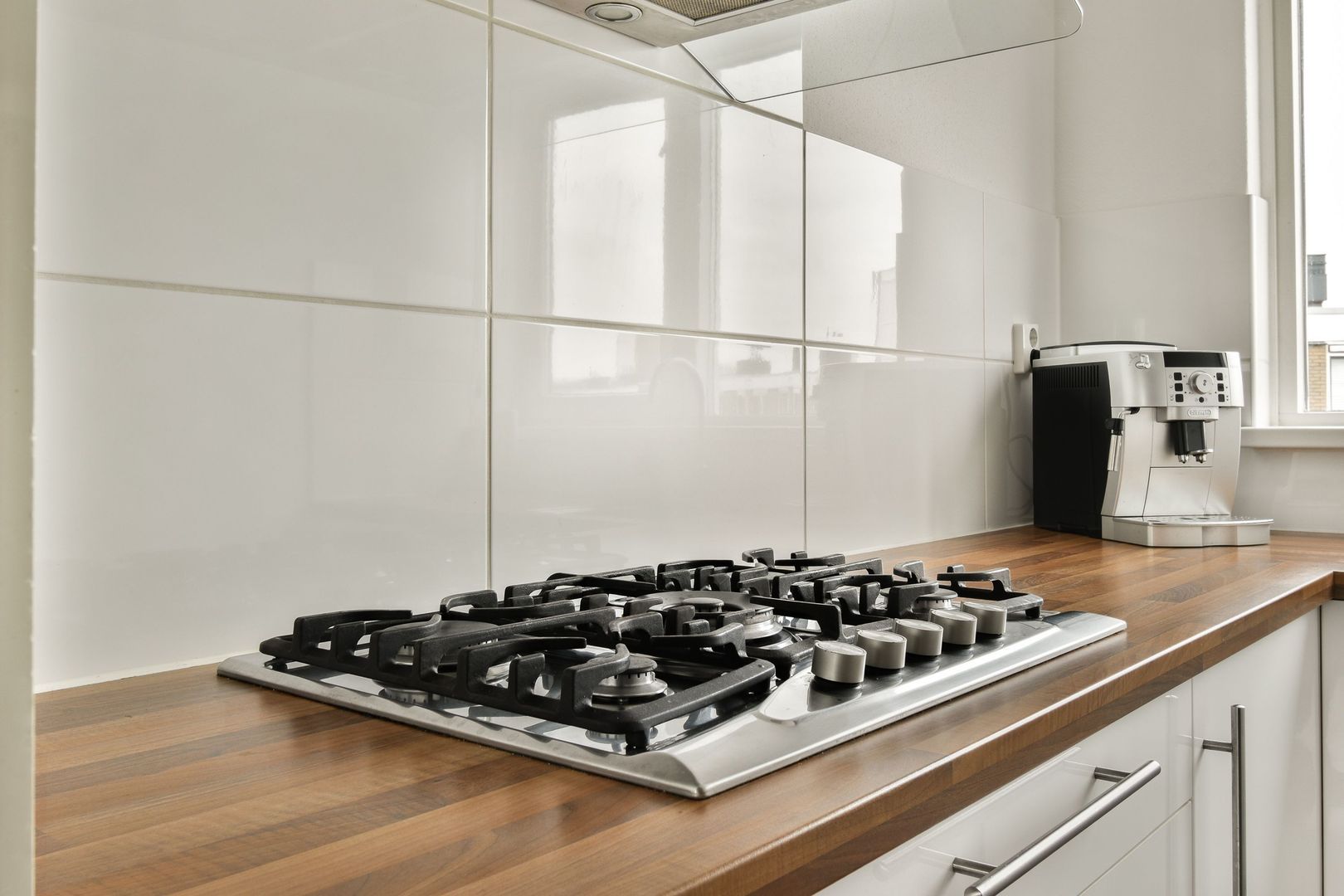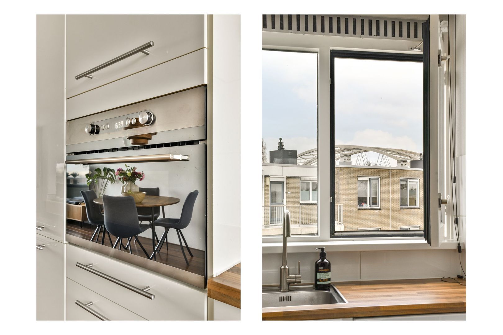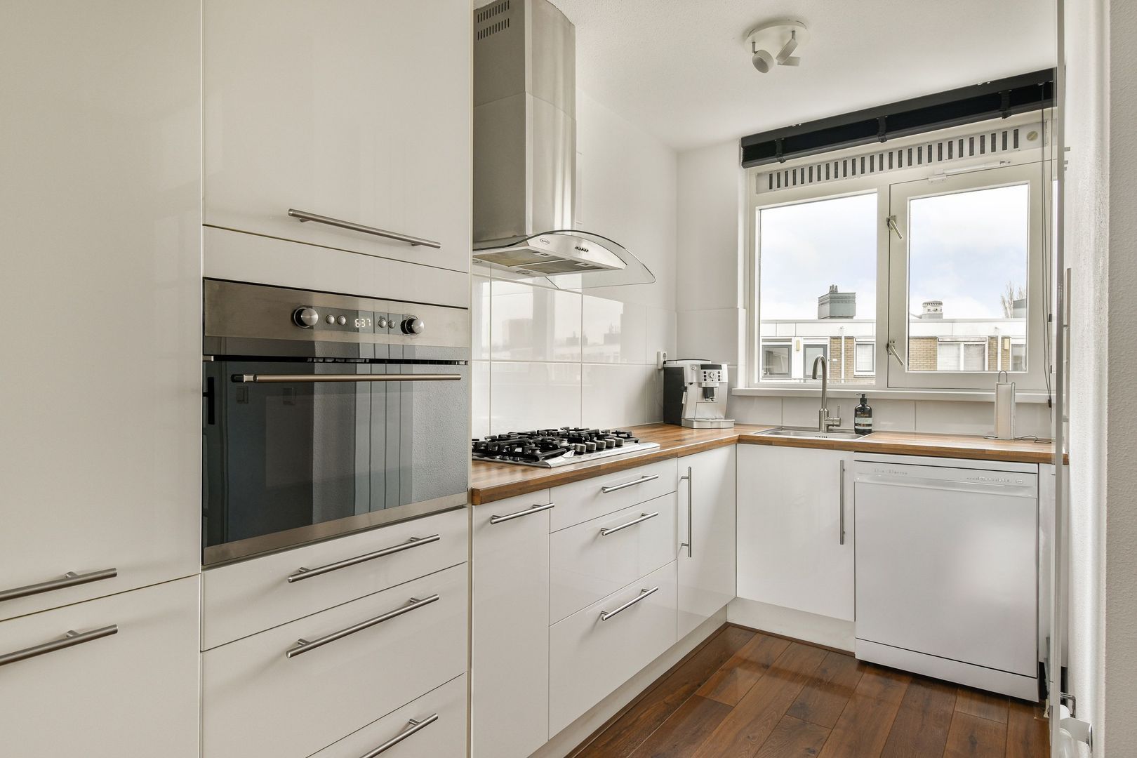 De Ikea-keuken in praktische L-opstelling heeft hoogglans witte fronten, een houtlook aanrechtblad en een fris wit betegelde achterwand. De keuken is compleet uitgerust met 5-pits gaskookplaat, afzuigkap, combi-oven, koel-/vriescombinatie en vaatwasser.