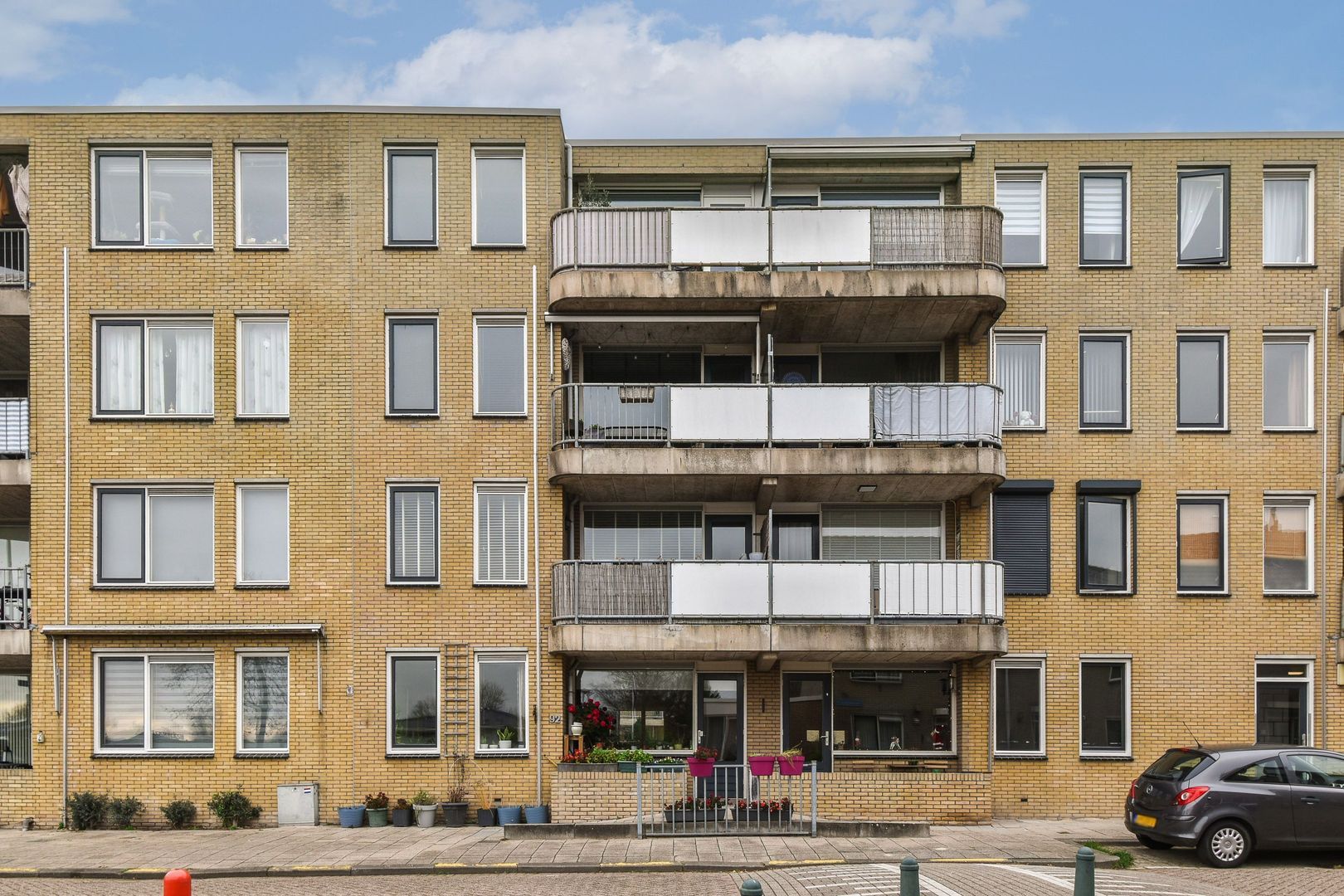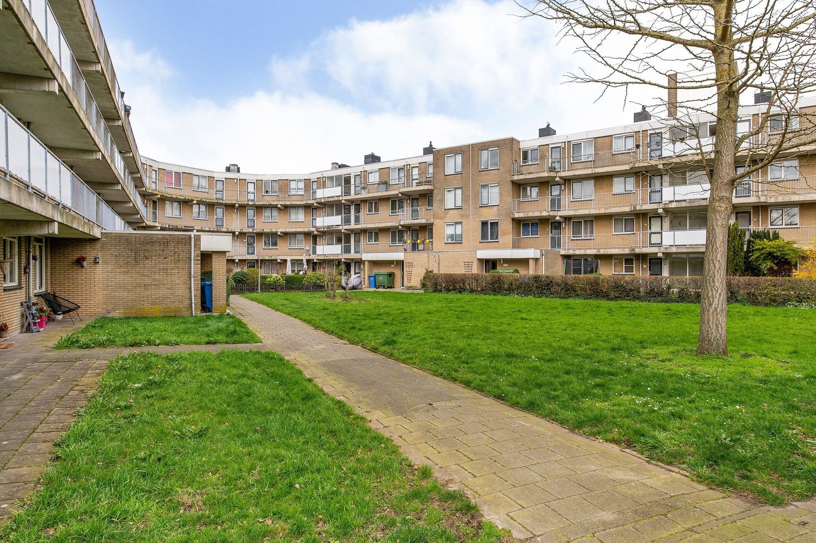 Afgesloten portiek met bellentableau en brievenbussen. Een nette entreehal biedt toegang tot de bergingen, het trappenhuis en de lift.