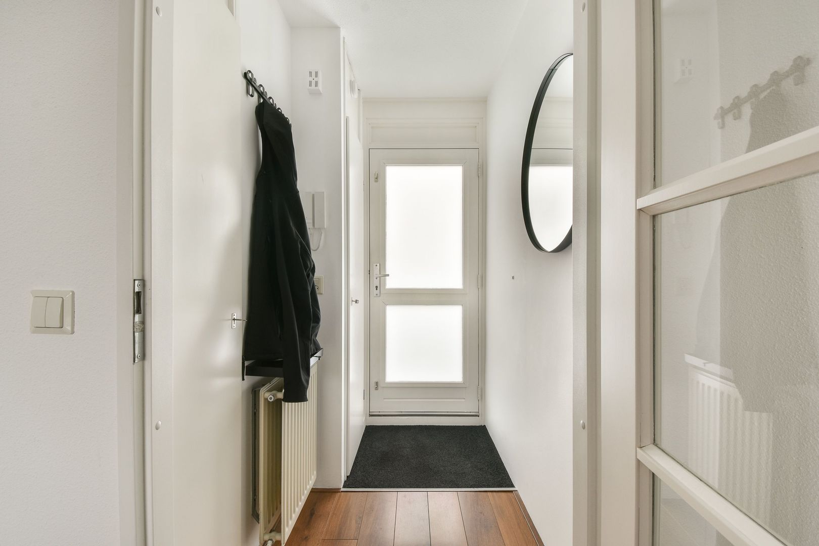 Entree via de galerij. Hal met meterkast, cv-kast en toegang tot de woonkamer.