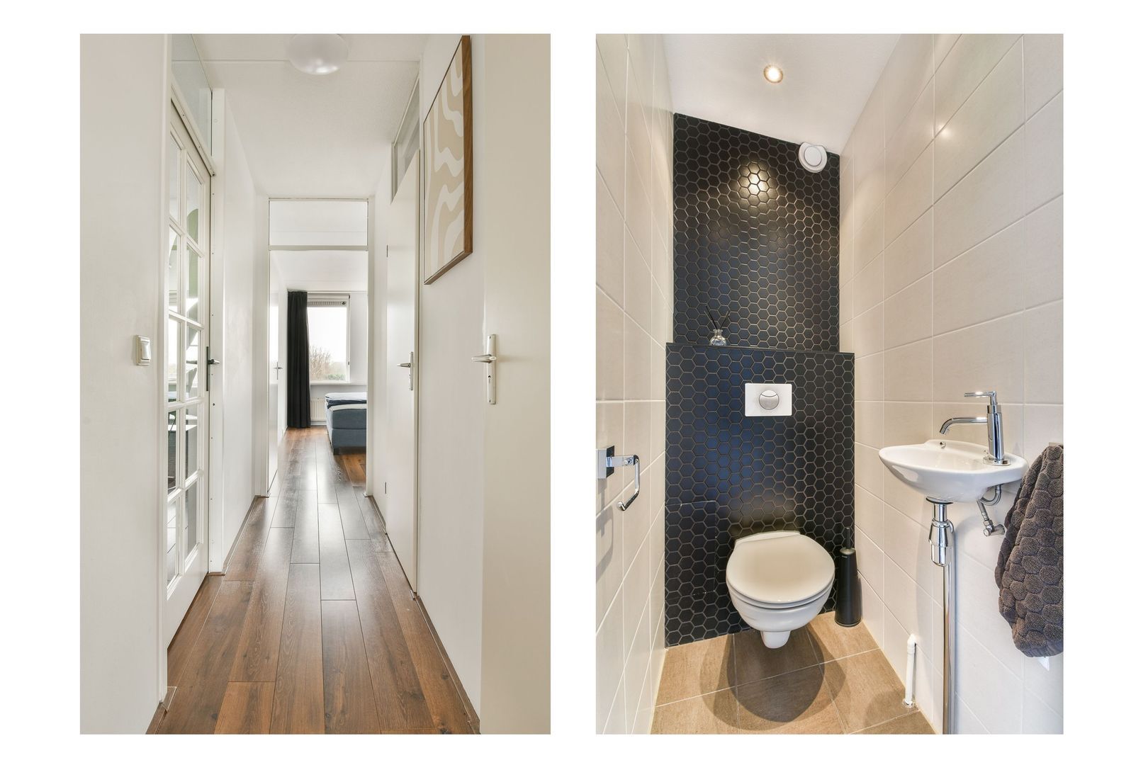 Aangrenzend ligt de gang met toegang tot de slaapkamers, het toilet en de badkamer.