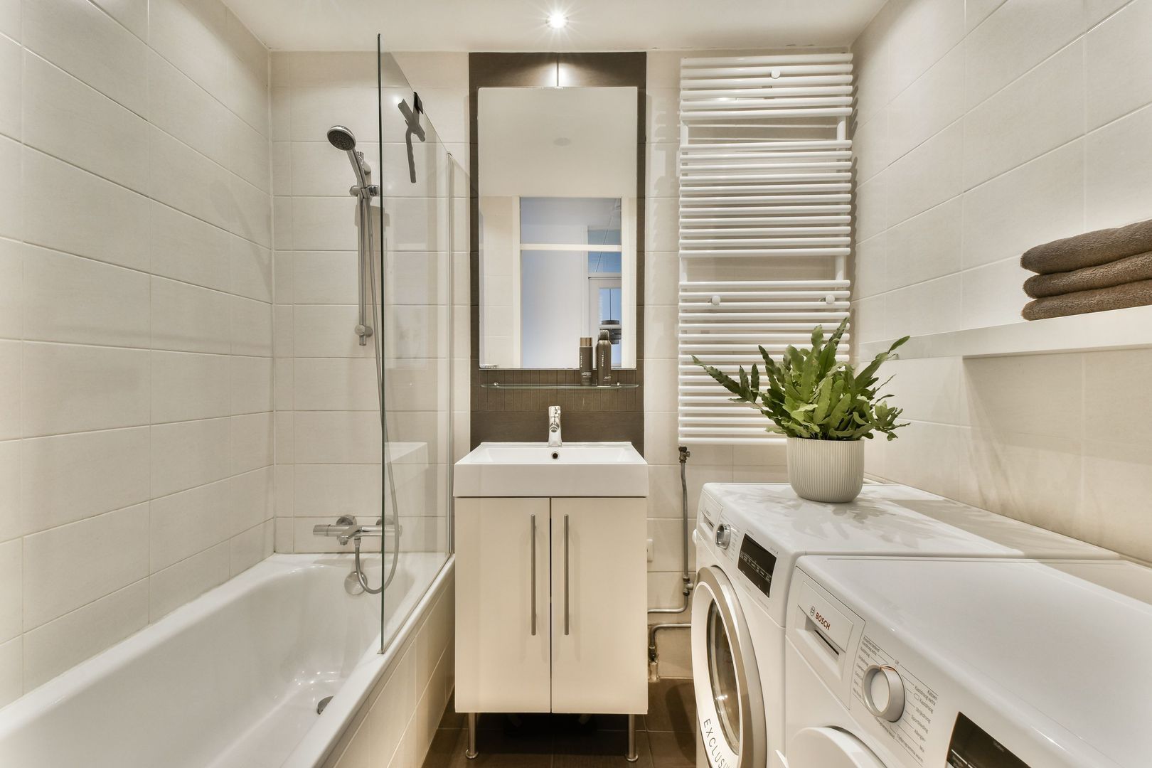 De toiletruimte is modern betegeld en is voorzien van zwevend toilet, fonteintje en ingebouwde plafondverlichting. De badkamer is eveneens modern afgewerkt en beschikt over een ligbad met douche, glazen spatscherm, handdoekradiator, een wastafel met meubel en de wasmachineaansluiting.
