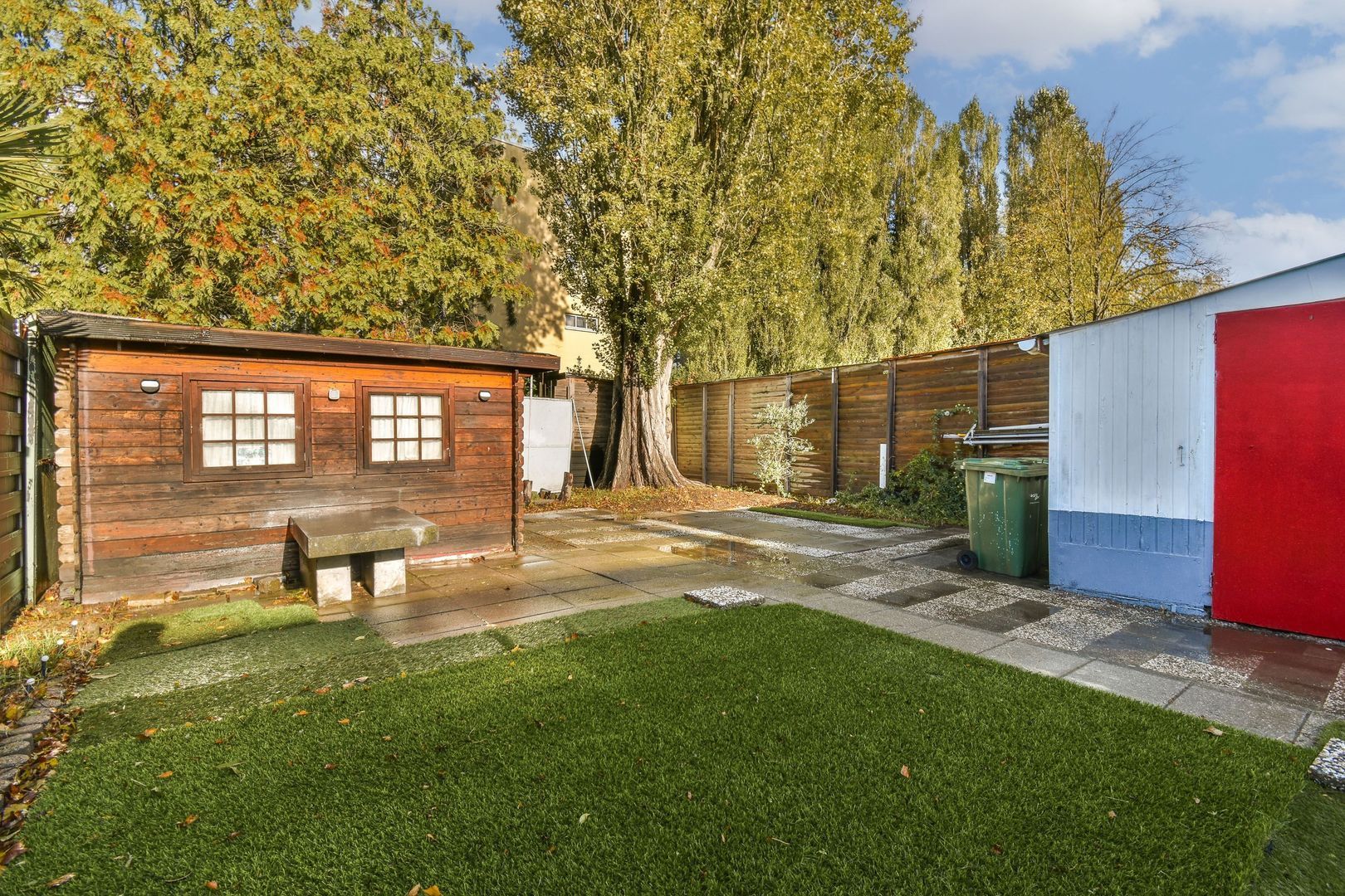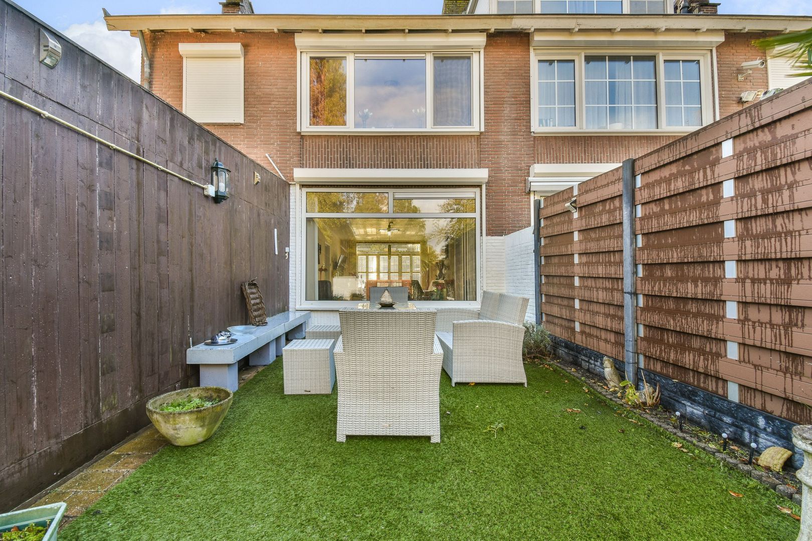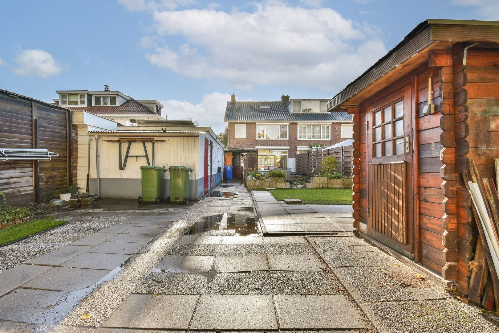 De woning heeft een zeer royale achtertuin van 10,5 m breed en 25 m diep met grote terrassen, grotendeels bestraat, houten berging van ca 5 m2.De achtertuin ligt op het zuidwesten en heeft veel privacy. De voortuin van 8 m diep is verzorgd aangelegd ook met groen, ook is er oprit voor de garage geschikt voor meerdere auto’s en ook ideaal als je je eigen auto wil opladen.