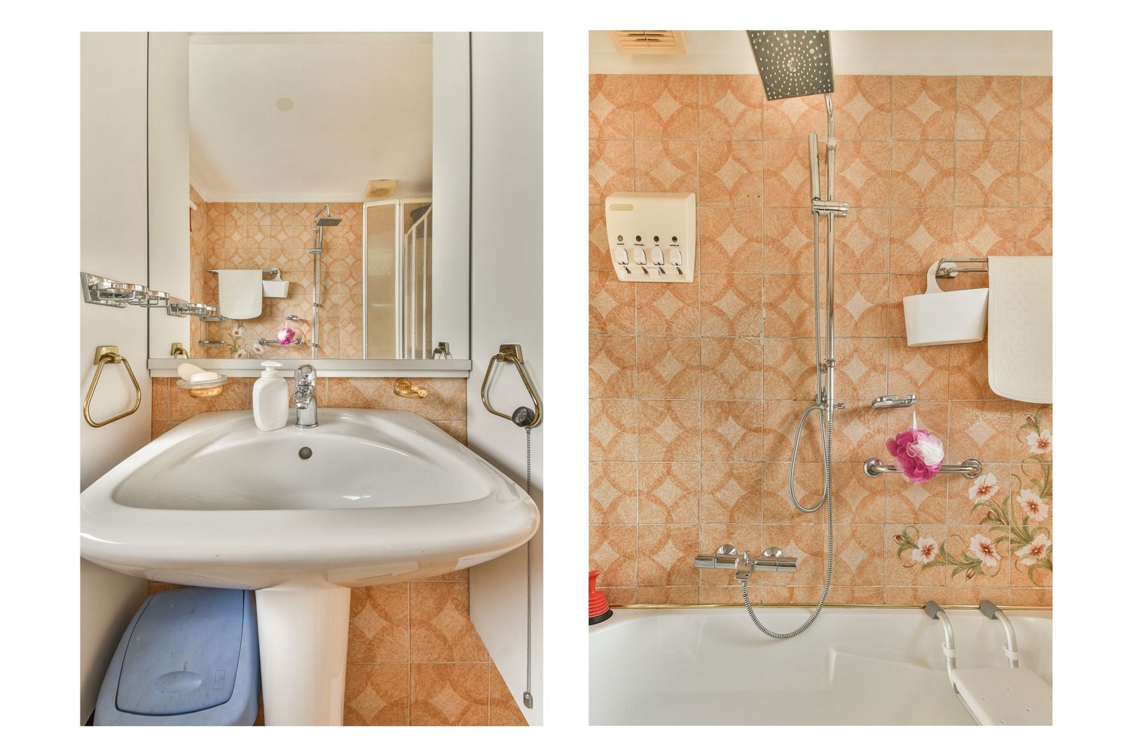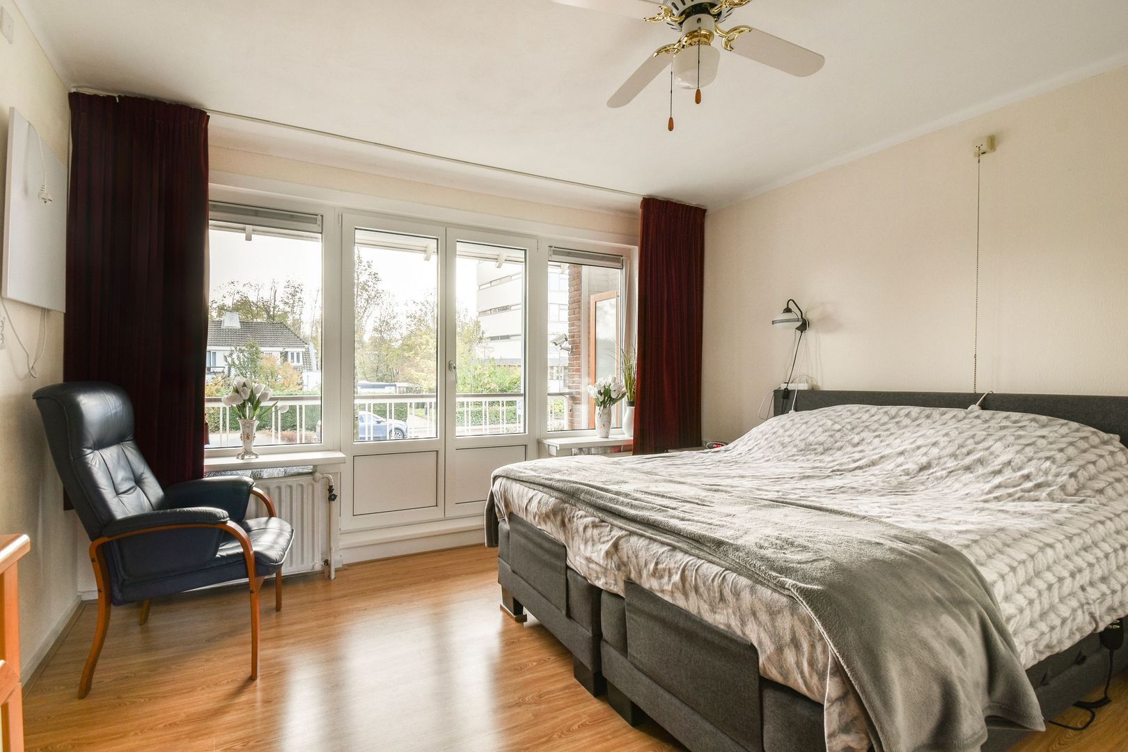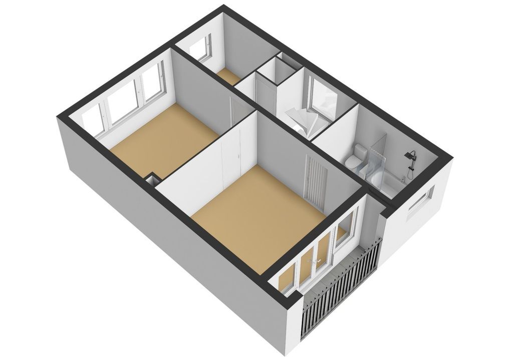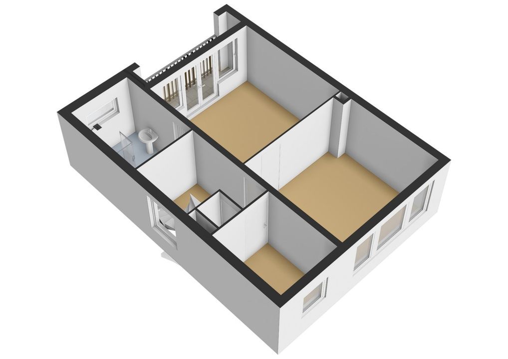 Overloop met trap naar de 2e verdieping en een vaste kast, 1e slaapkamer (voorheen 2 kamers) ca. 29 m2 met aan de voorzijde openslaande deuren naar het balkon, deze kamer is eenvoudige weer in 2 ruime slaapkamers te splitsen. 2e slaapkamer aan de achterzijde van de woning van ca. 5 m2 .Vanuit de grootste slaapkamer is de geheel betegelde badkamer bereikbaar, ca. 6 m2 welke is voorzien van een ligbad/douche, toilet, een wastafel en een design radiator. De gehele etage is voorzien van een laminaatvloer.