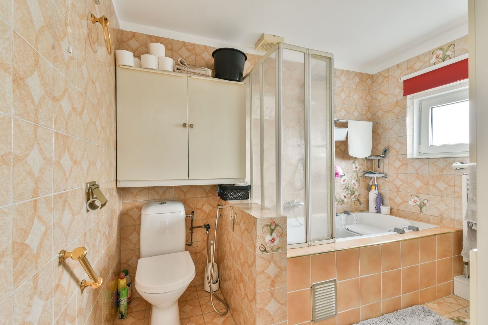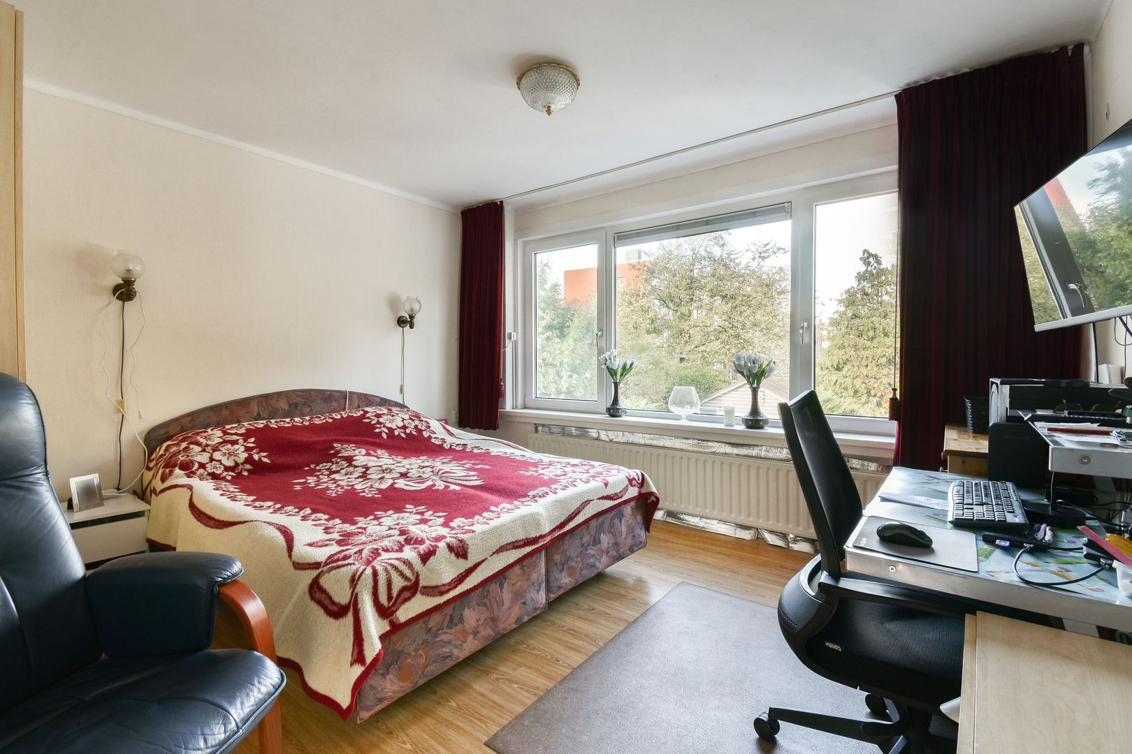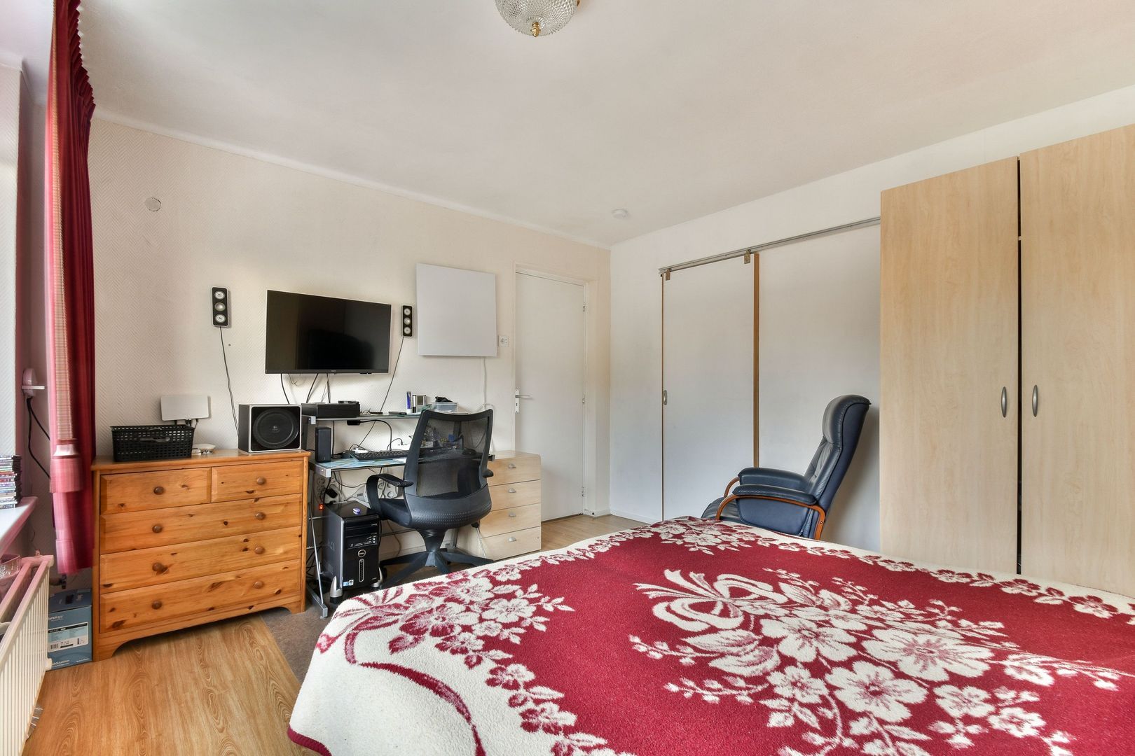 Overloop met trap naar de 2e verdieping en een vaste kast, 1e slaapkamer (voorheen 2 kamers) ca. 29 m2 met aan de voorzijde openslaande deuren naar het balkon, deze kamer is eenvoudige weer in 2 ruime slaapkamers te splitsen. 2e slaapkamer aan de achterzijde van de woning van ca. 5 m2 .Vanuit de grootste slaapkamer is de geheel betegelde badkamer bereikbaar, ca. 6 m2 welke is voorzien van een ligbad/douche, toilet, een wastafel en een design radiator. De gehele etage is voorzien van een laminaatvloer.