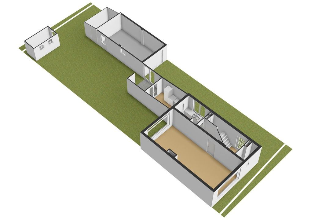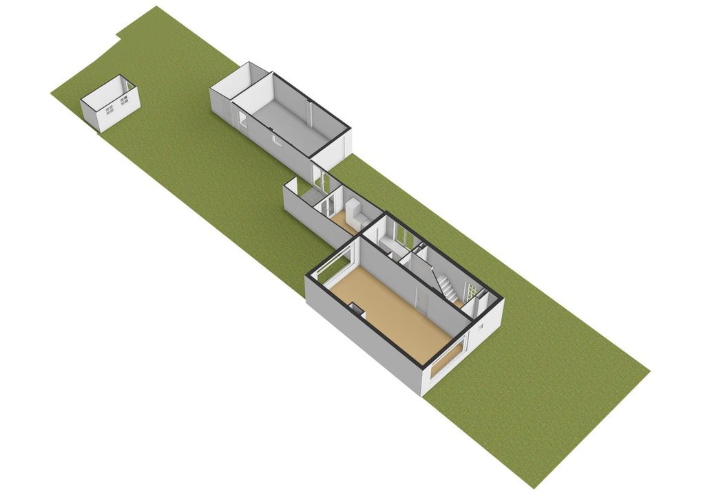 Entree, ruime hal met trap opgang naar de 1e verdieping, meterkast (5 groepen), geheel betegeld toilet met wastafel op zuil, trap/bergkast, royale woonkamer ( type doorzon) ca. 32 m2 voorzien van een schouw met haard (niet in gebruik), stucwerkplafond en granolwanden. Keuken met daarin een kunststof keukenblok met diverse apparatuur, o.a. vaatwasmachine, keramische kookplaat, vlakscherm, koellade, buffetkast, apothekerskast, aansluitend de aangebouwde bijkeuken met aansluiting wasmachine, handige bergruimte en deur naar de achtertuin. De gehele begane grond is voorzien van een laminaatvloer.