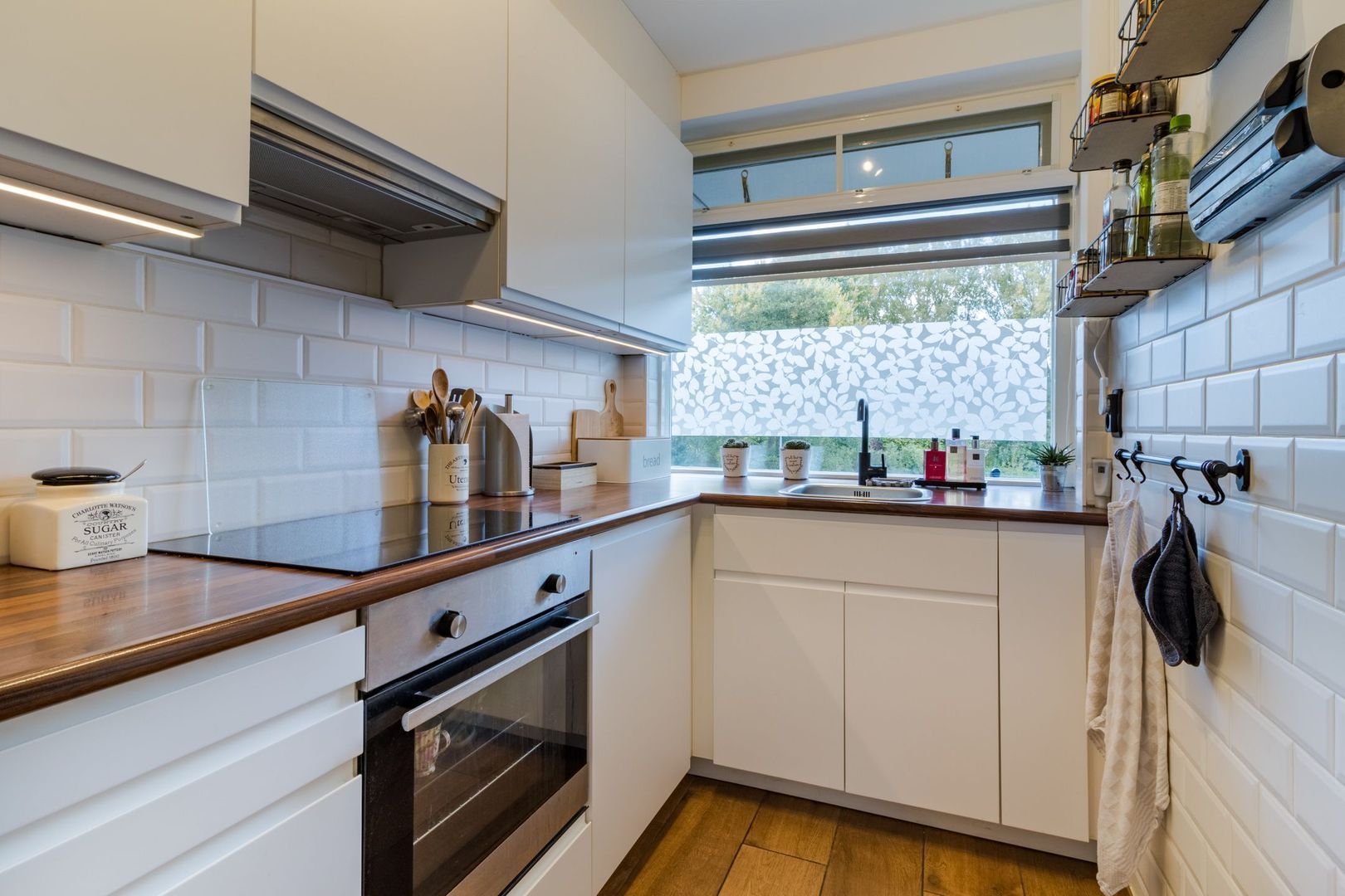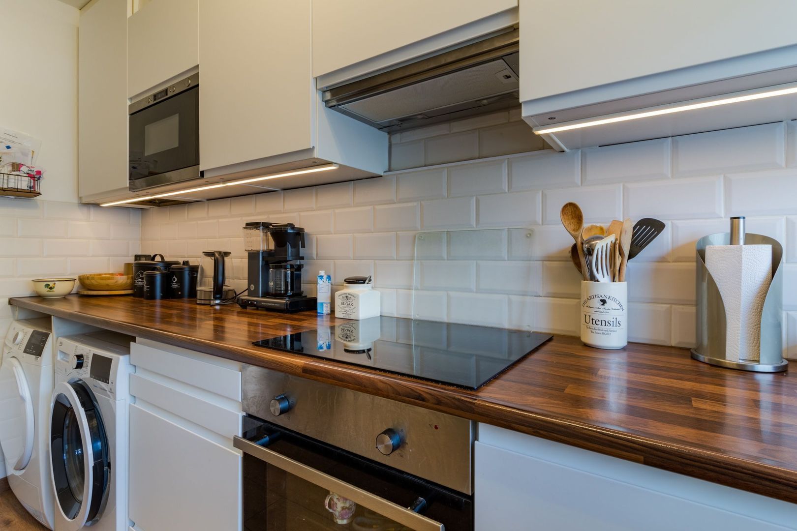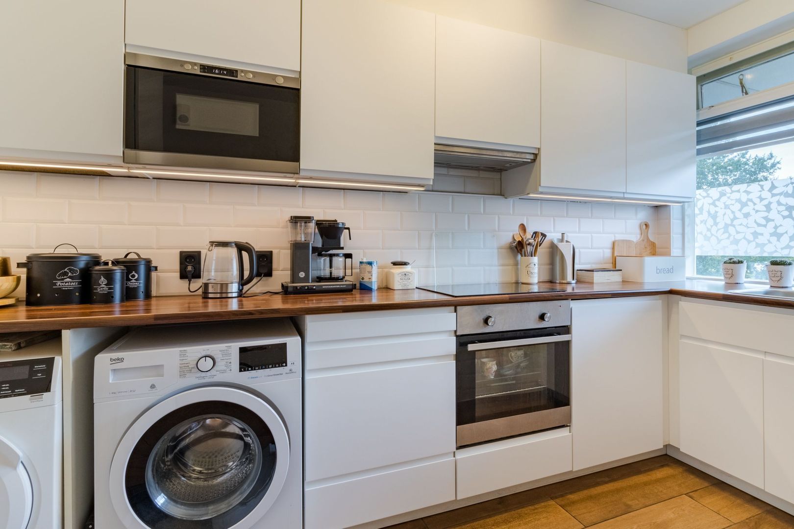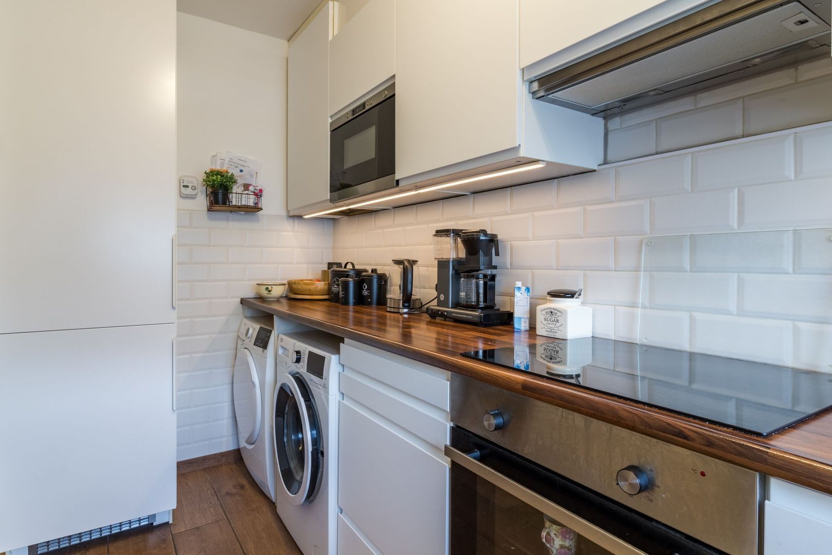 De keuken bevindt zich aan de galerijzijde en is voorzien van de navolgende apparatuur; koel-/vriescombi, oven, magnetron, inductiekookplaat, afzuigkap, badgeiser en wasmachineaansluiting.