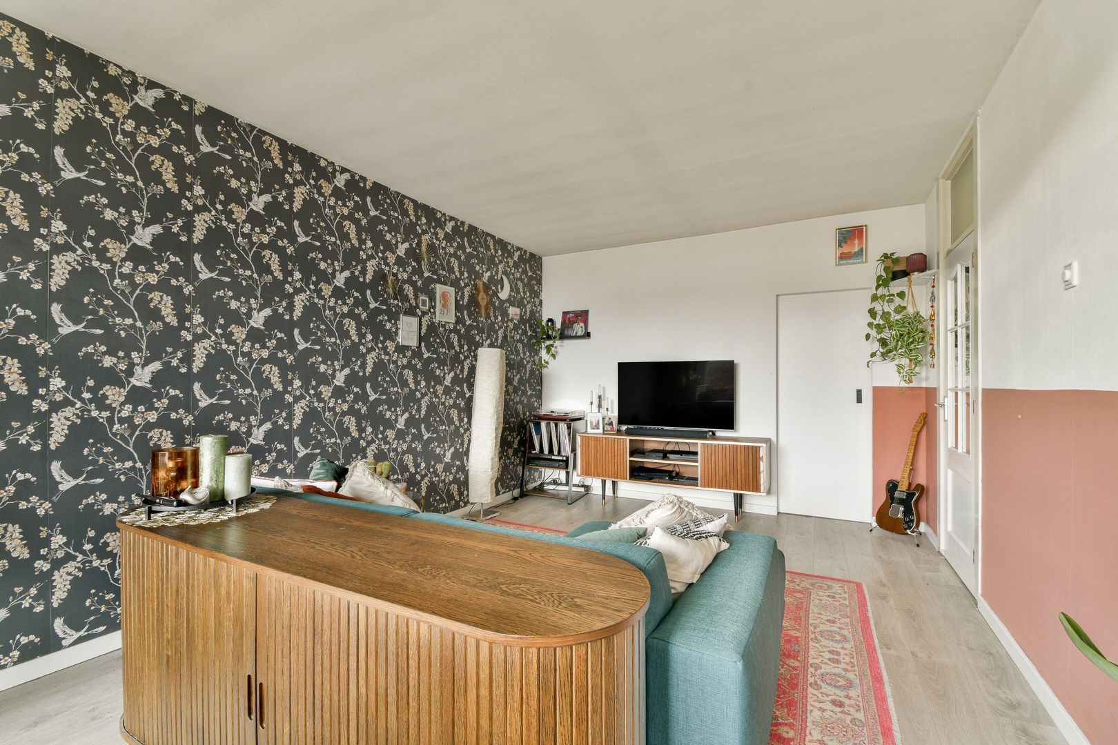 De woonkamer is ca. 25 m2 groot en heeft een zeer nette afwerking met een mooie laminaatvloer, deels gestuukte wanden en deels behangen wanden.