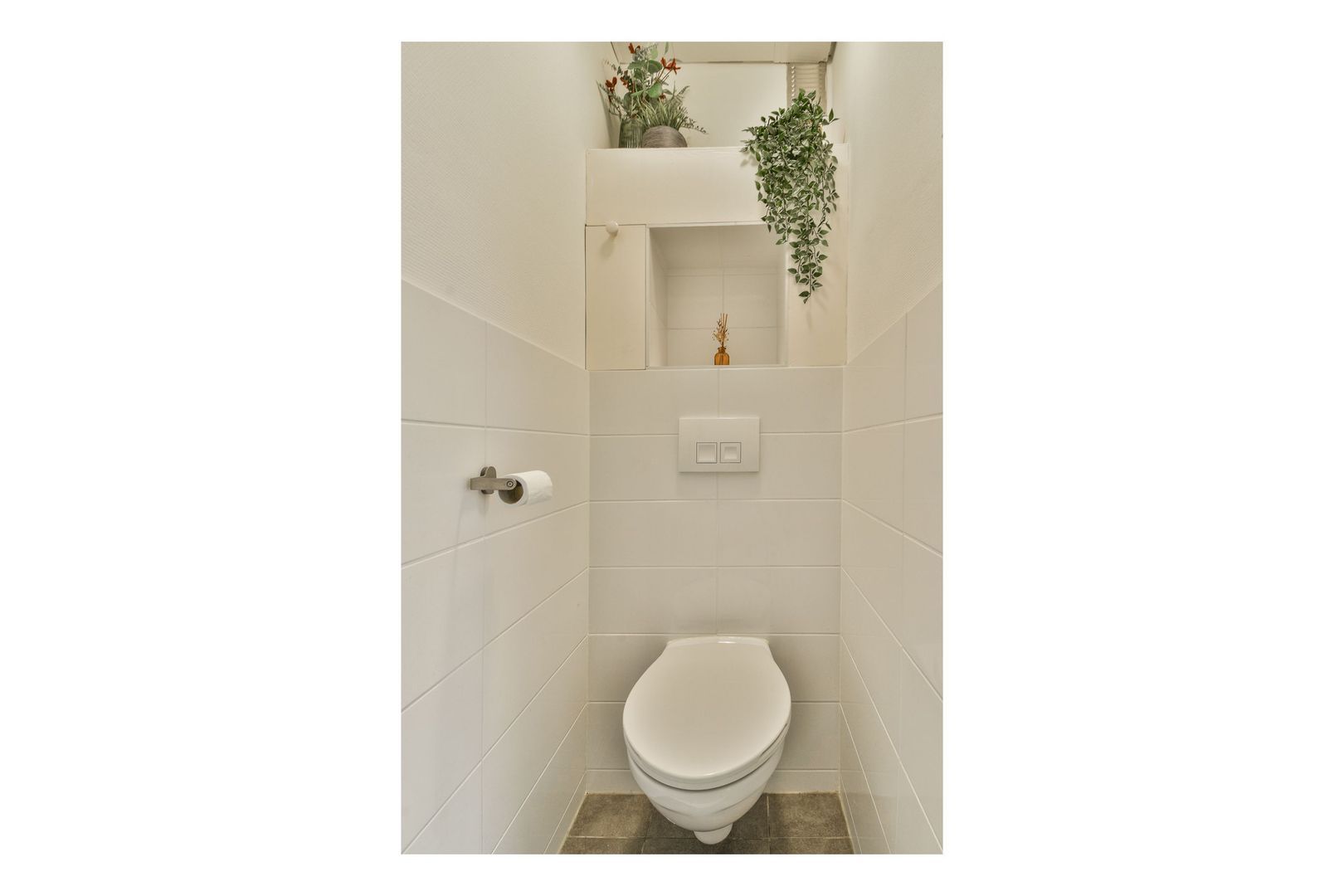 Entree, ruime hal met een vaste kast, voldoende ruimte voor een garderobe en toegang tot vrijwel alle vertrekken van de woning. Gedeeltelijk met moderne witte wandtegels en antraciet vloertegels betegeld toilet en voorzien van een zwevend wandcloset.