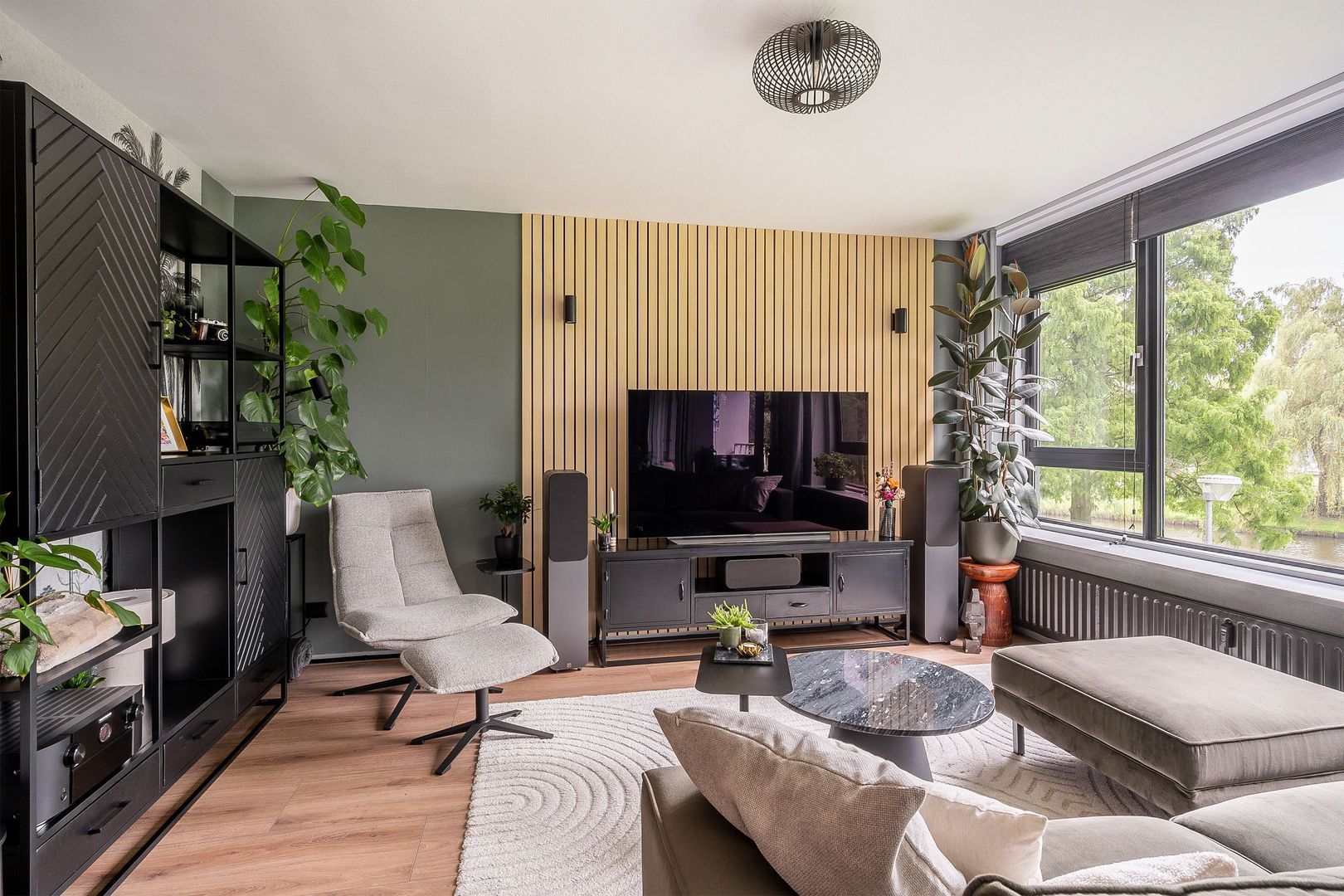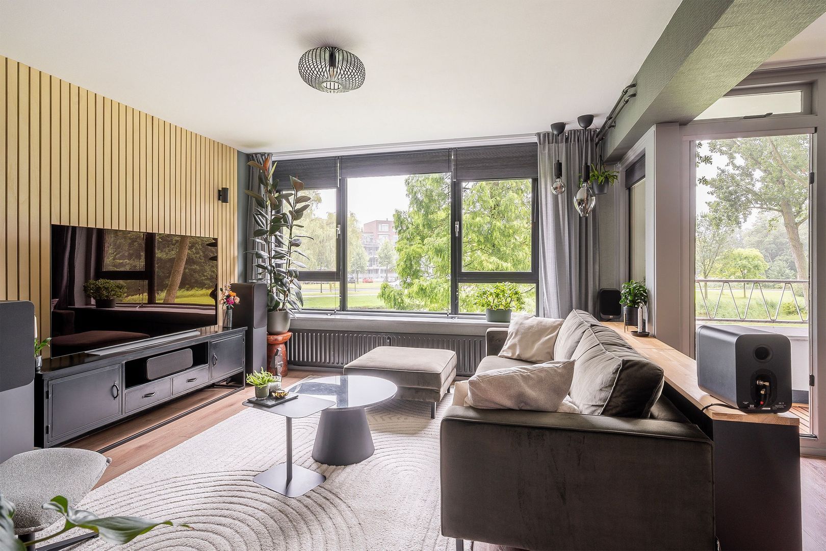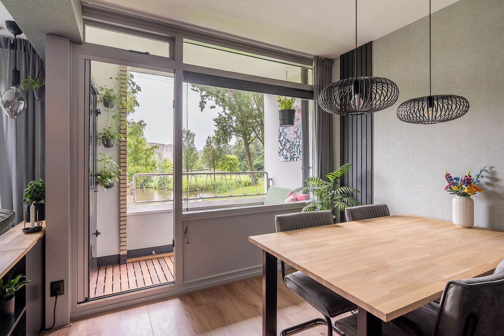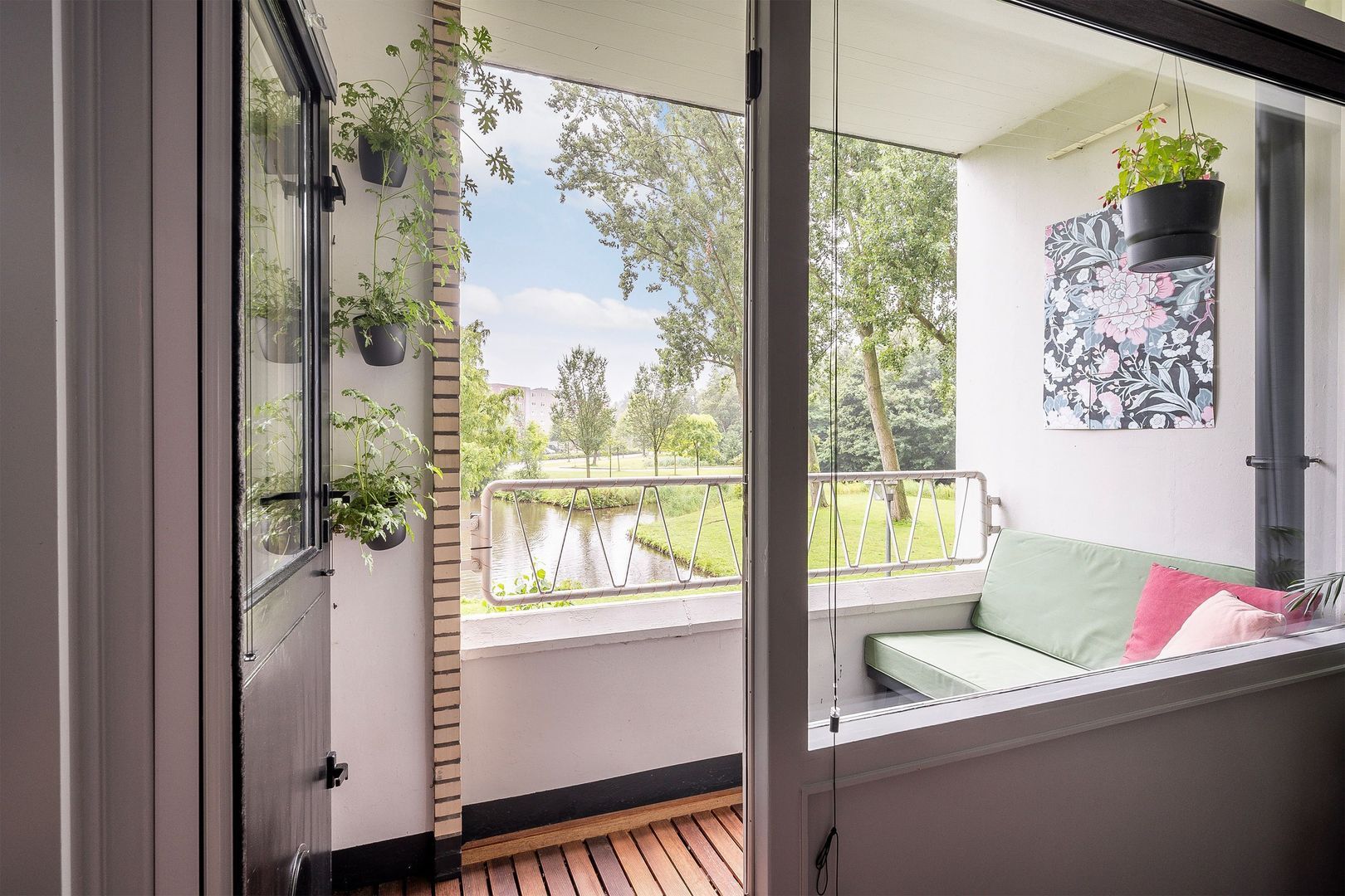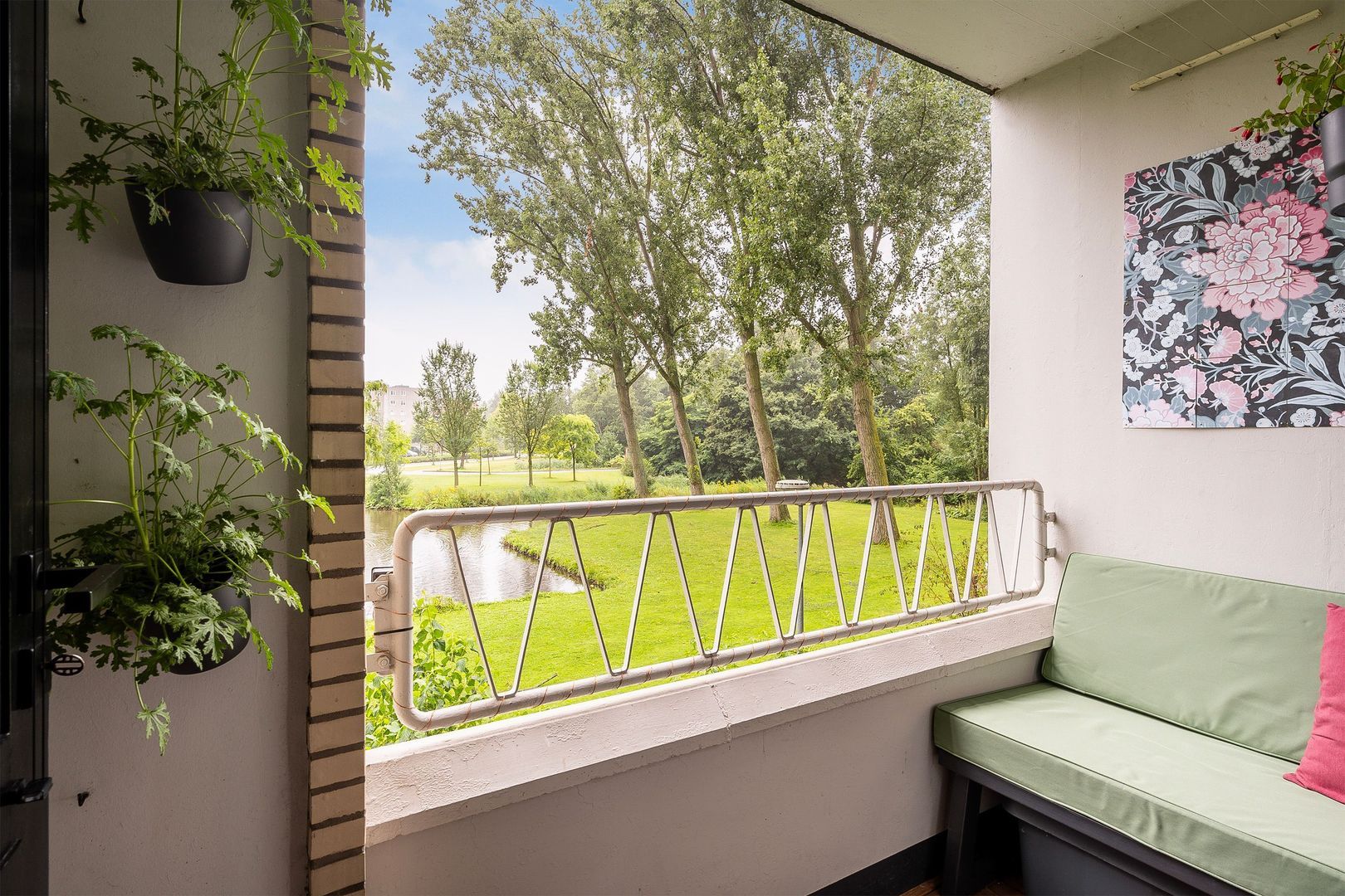 Besloten balkon van 3 m2 op het zuidoosten, met hardhouten vlonders en vrij uitzicht op het groen en waterpartij.