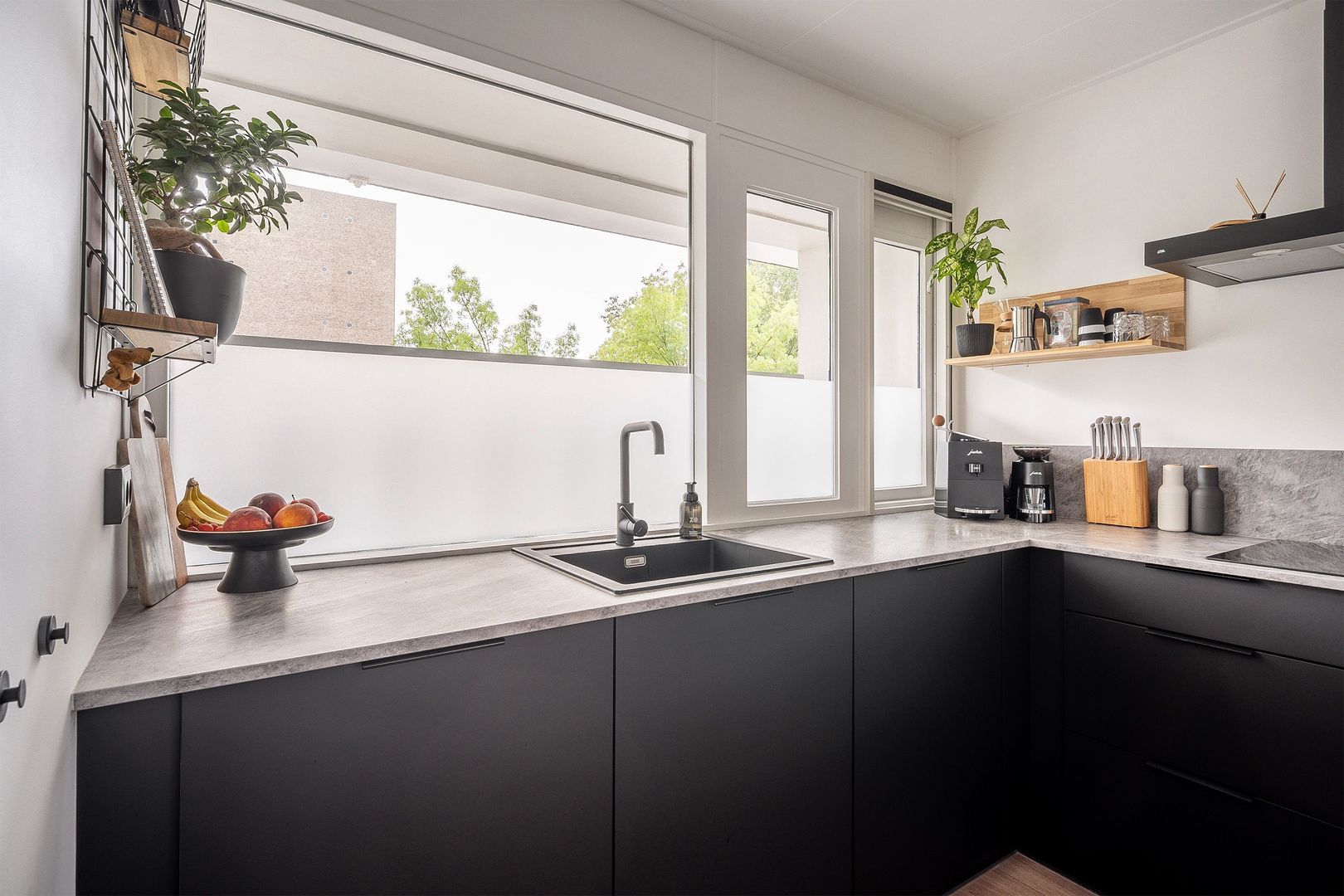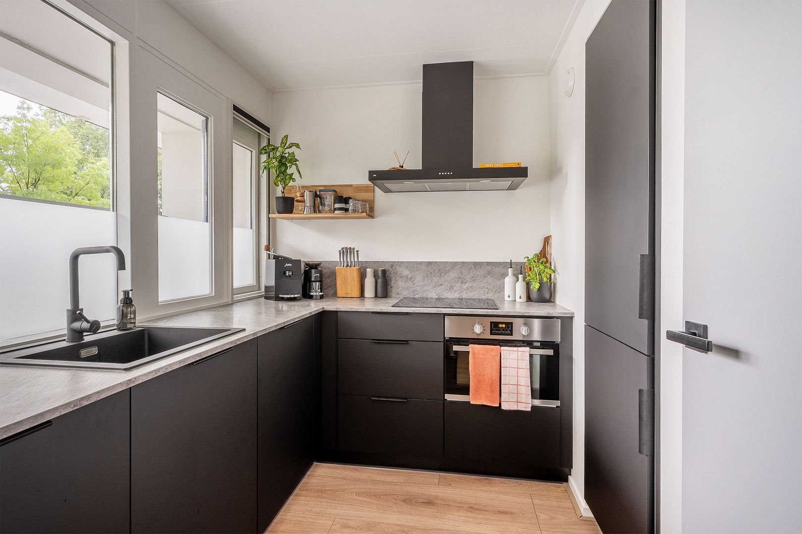 Ruime moderne keuken van 6 m2 met handige hoekopstelling en ingebouwde koelkast, laminaatvloer, natuursteenlook aanrechtblad met achterwand en de volgende inbouwapparatuur: inductiekookplaat, combi-oven, koelvrieskast en afzuigkap.