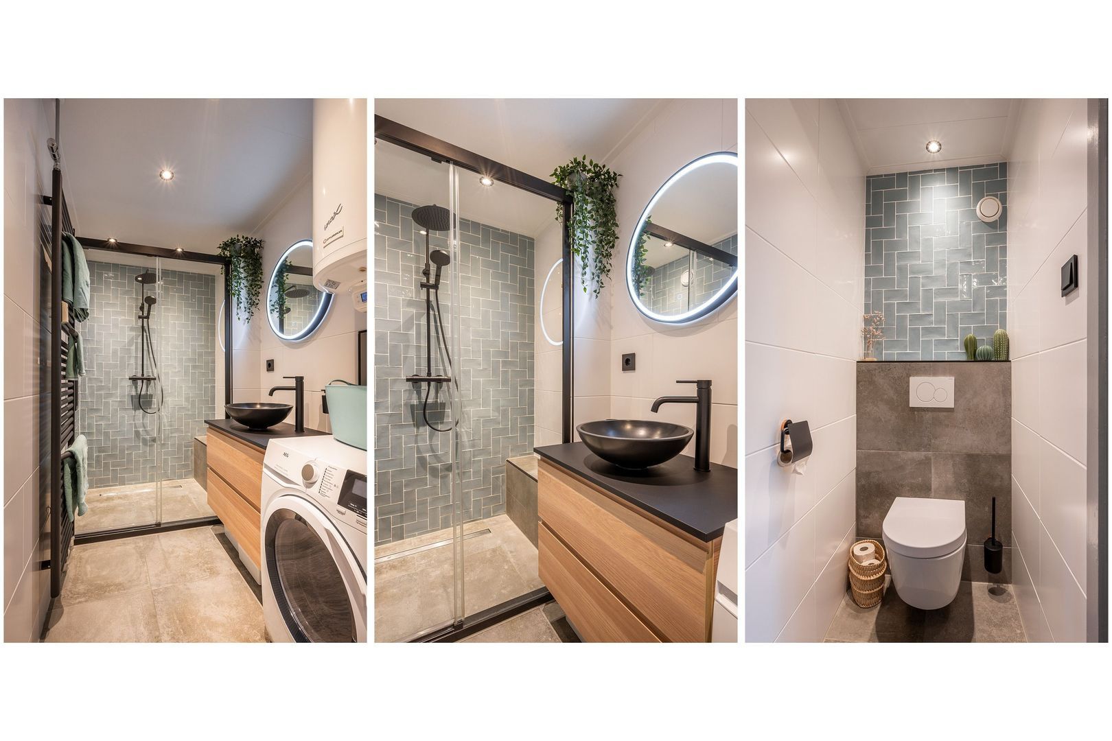 Luxe, geheel betegelde badkamer met inloopdouche voorzien van watergoot, wastafelmeubel, plafond met ingebouwde verlichting, handdoekradiator en apart toilet, leuk betegeld en met vrij hangend closet.