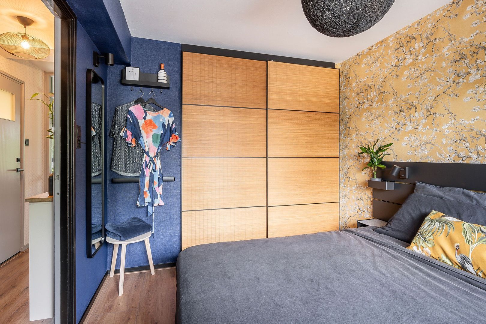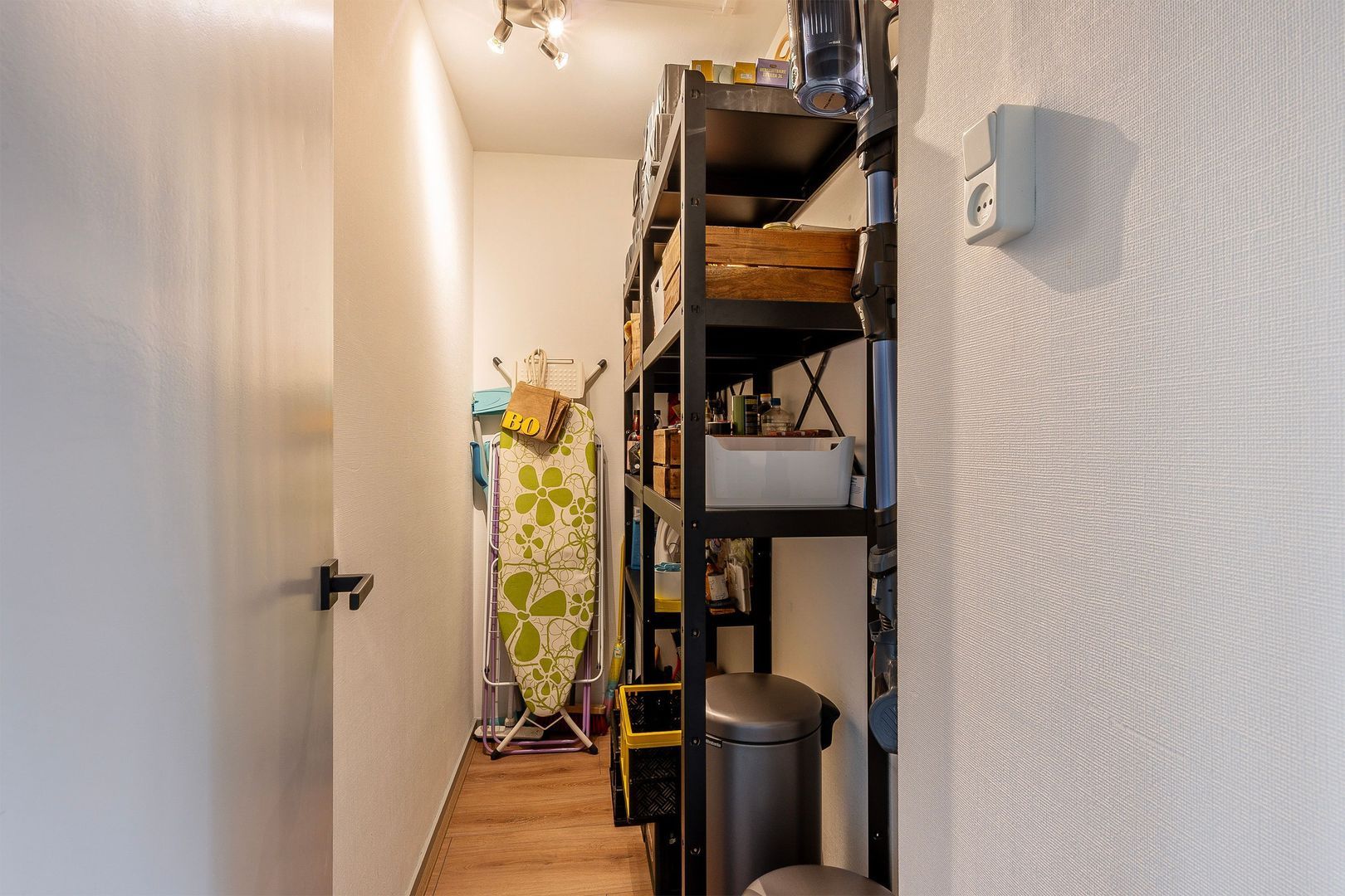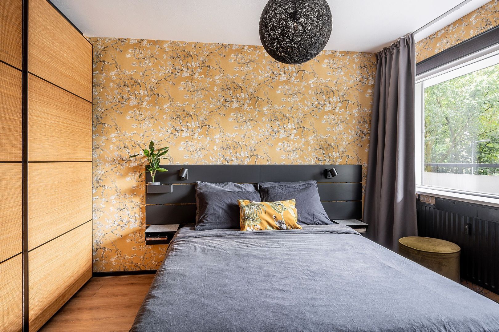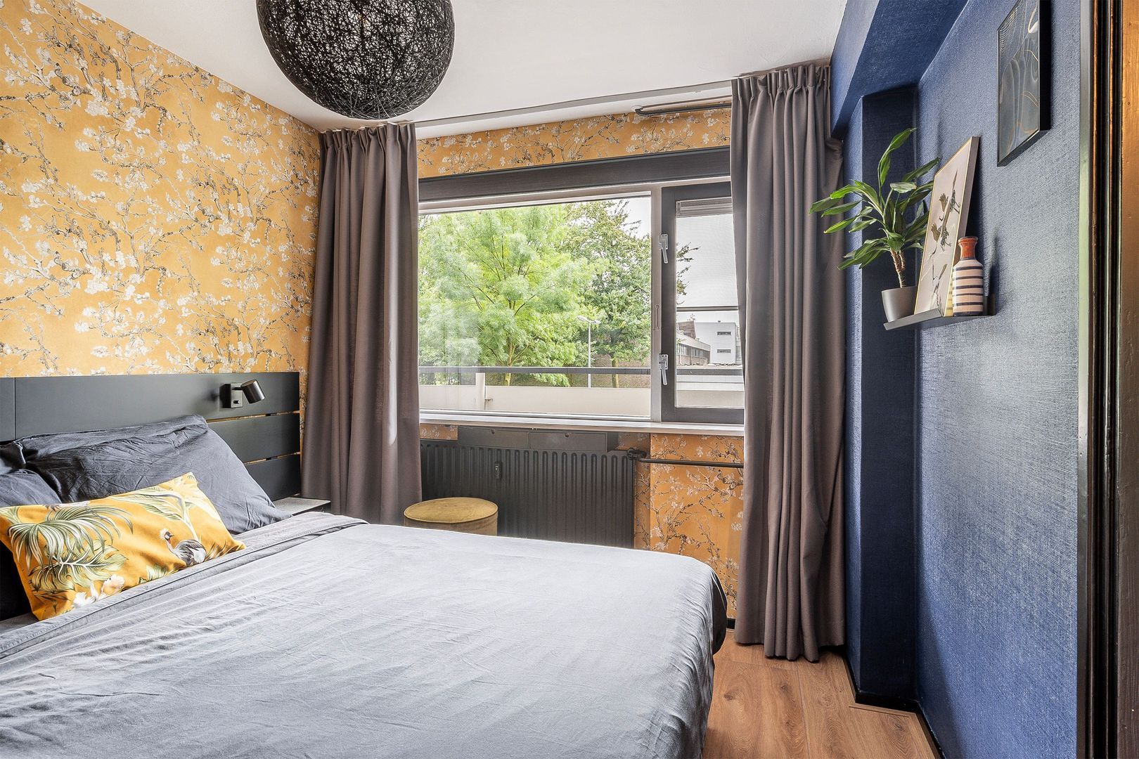 Slaapkamer van ruim 10 m2 aan galerijzijde met stoere ingebouwde schuifkastenwand en voorzien van laminaatvloer.