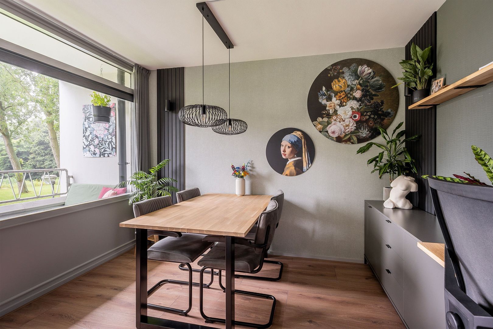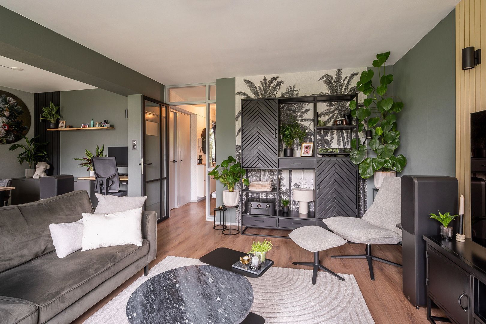 Entree, tochtportaal, gang en meterkast. Ruime woonkamer van ca. 30 m2 bestaande uit een living, een aansluitend eetkamergedeelte, moderne systeemwand, laminaatvloer met brede eikenlook plank, en een deur naar het balkon.