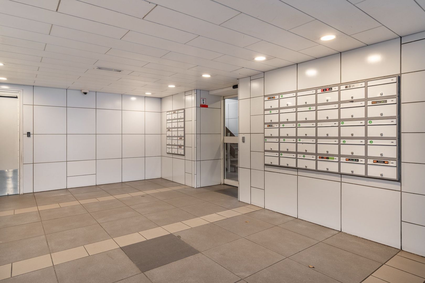 Entreehal met bellentableau (videofoon installatie). Afgesloten deuren naar hal met dubbele liften en toegang richting de bergingen.