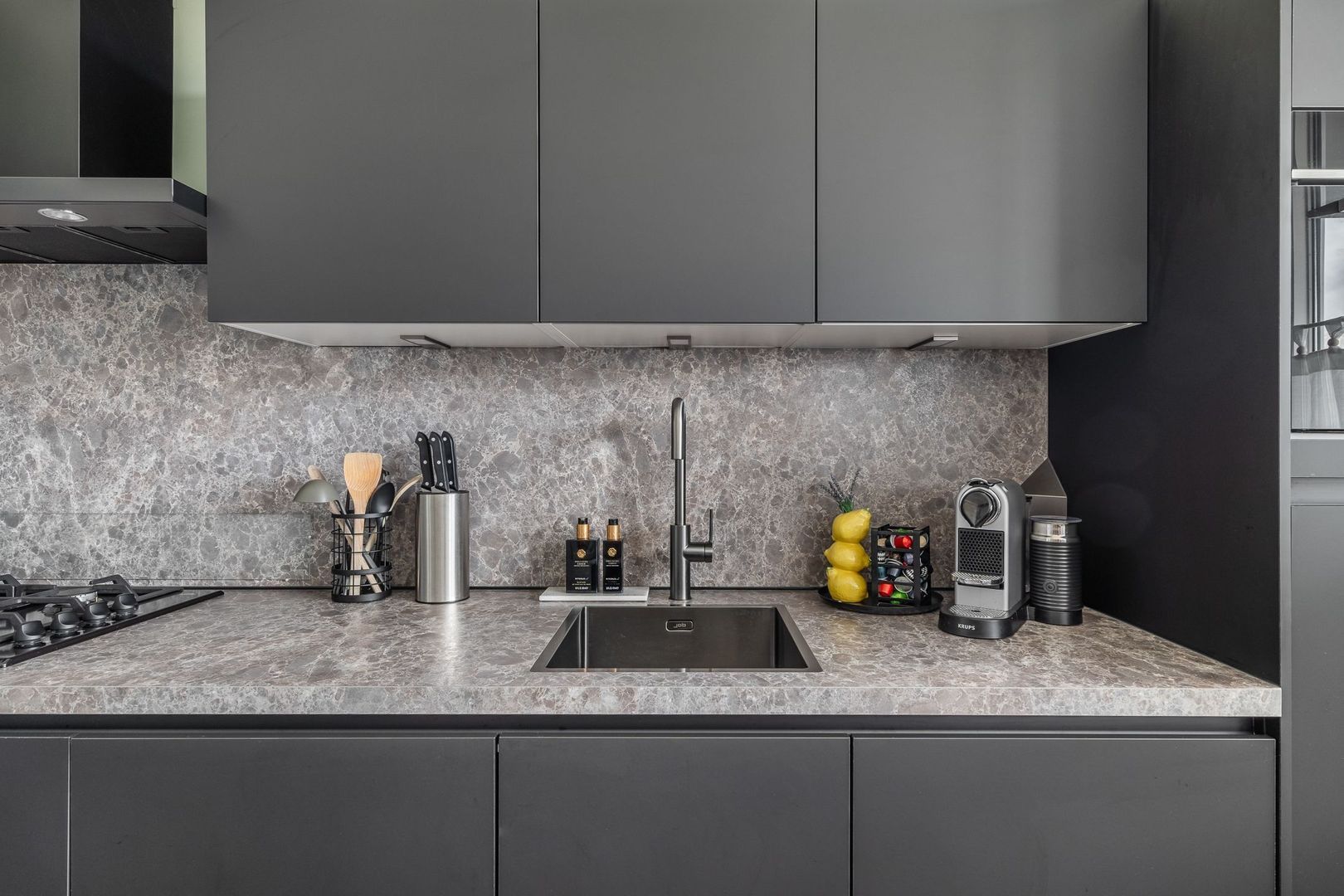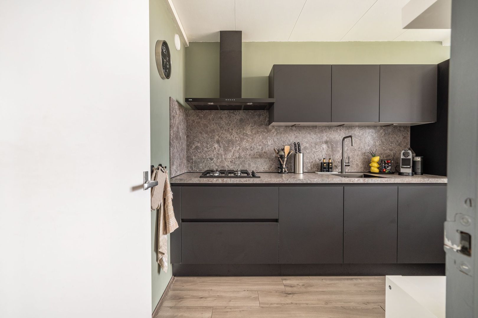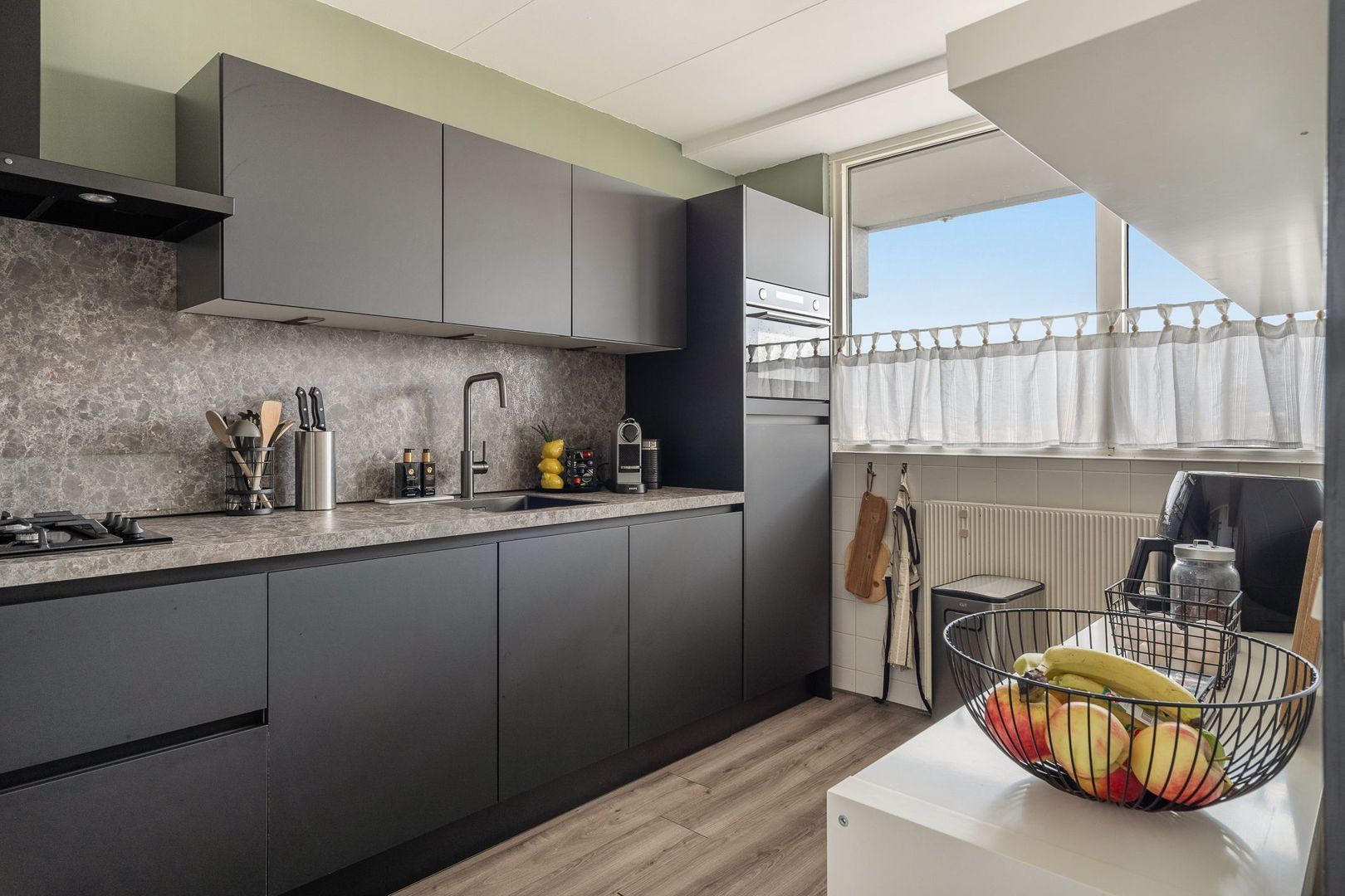 Ruime woonkamer van ruim 26 m2 met vaste kast en vanuit de woonkamer toegang tot de zijkamer van ongeveer 9 m2. Deze kamer is flexibel te gebruiken, bijvoorbeeld als uitbreiding van de woonkamer, werkkamer of als aparte slaapkamer. Vanuit de zijkamer op het westen gelegen balkon te bereiken van ca. 10 m2 inclusief zeemgedeelte. Aan galerijzijde ligt de keuken van ruim 8 m2 met een modern antraciet wandkeukenblok uit april 2024. Het keukenblok is voorzien van een 4 pits gaskookplaat, afzuigkap, spoelbak, combi oven/magnetron, vaatwasser, koelkast, close-in-boiler, diverse kasten en laden en inbouwspots. Het aanrechtblad en de achterwand zijn in dezelfde “look” uitgevoerd.