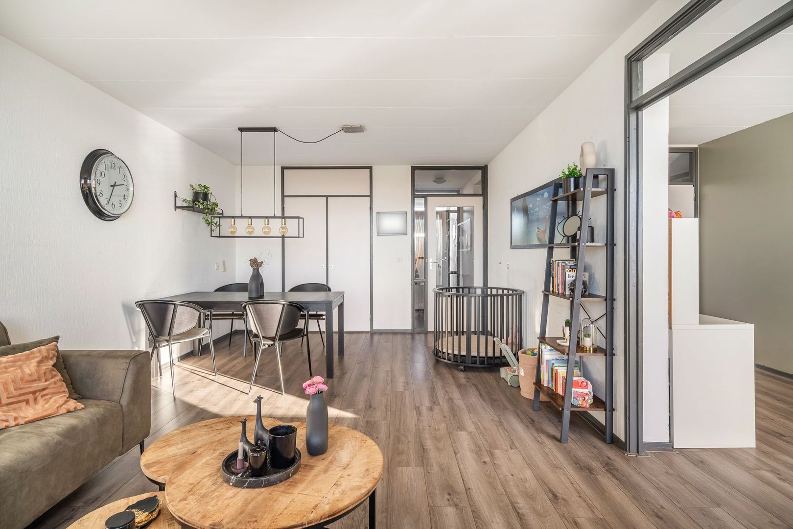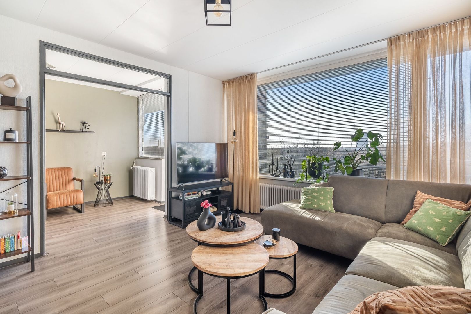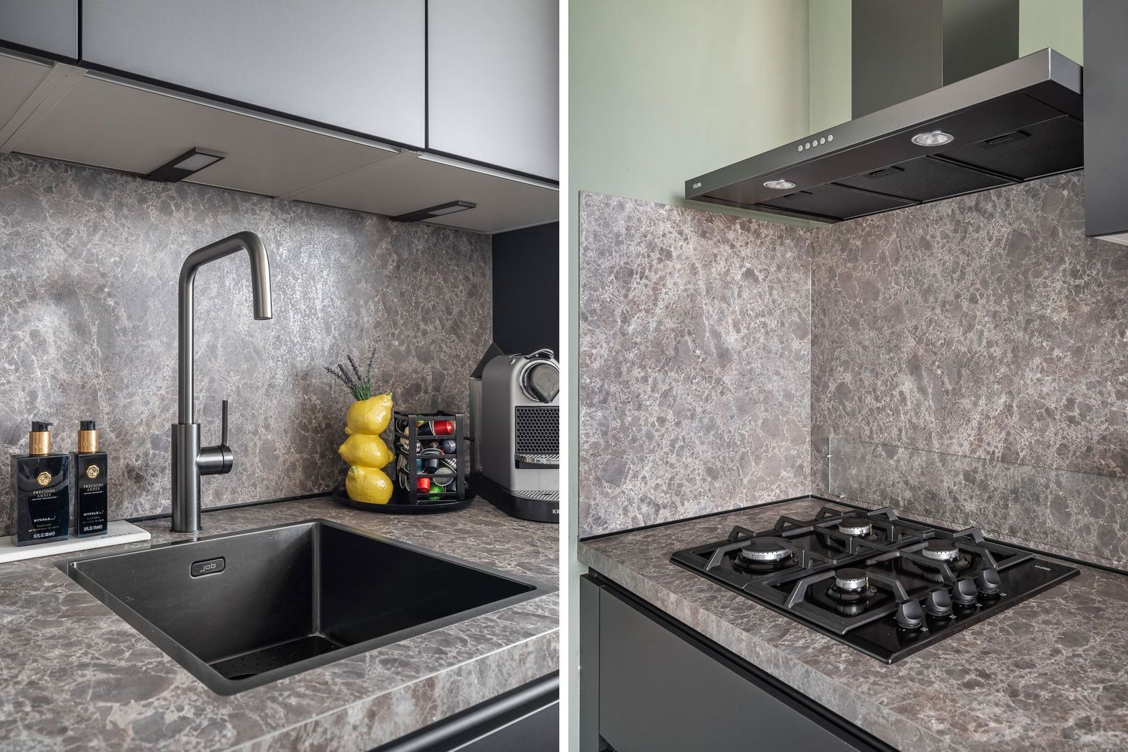 Ruime woonkamer van ruim 26 m2 met vaste kast en vanuit de woonkamer toegang tot de zijkamer van ongeveer 9 m2. Deze kamer is flexibel te gebruiken, bijvoorbeeld als uitbreiding van de woonkamer, werkkamer of als aparte slaapkamer. Vanuit de zijkamer op het westen gelegen balkon te bereiken van ca. 10 m2 inclusief zeemgedeelte. Aan galerijzijde ligt de keuken van ruim 8 m2 met een modern antraciet wandkeukenblok uit april 2024. Het keukenblok is voorzien van een 4 pits gaskookplaat, afzuigkap, spoelbak, combi oven/magnetron, vaatwasser, koelkast, close-in-boiler, diverse kasten en laden en inbouwspots. Het aanrechtblad en de achterwand zijn in dezelfde “look” uitgevoerd.