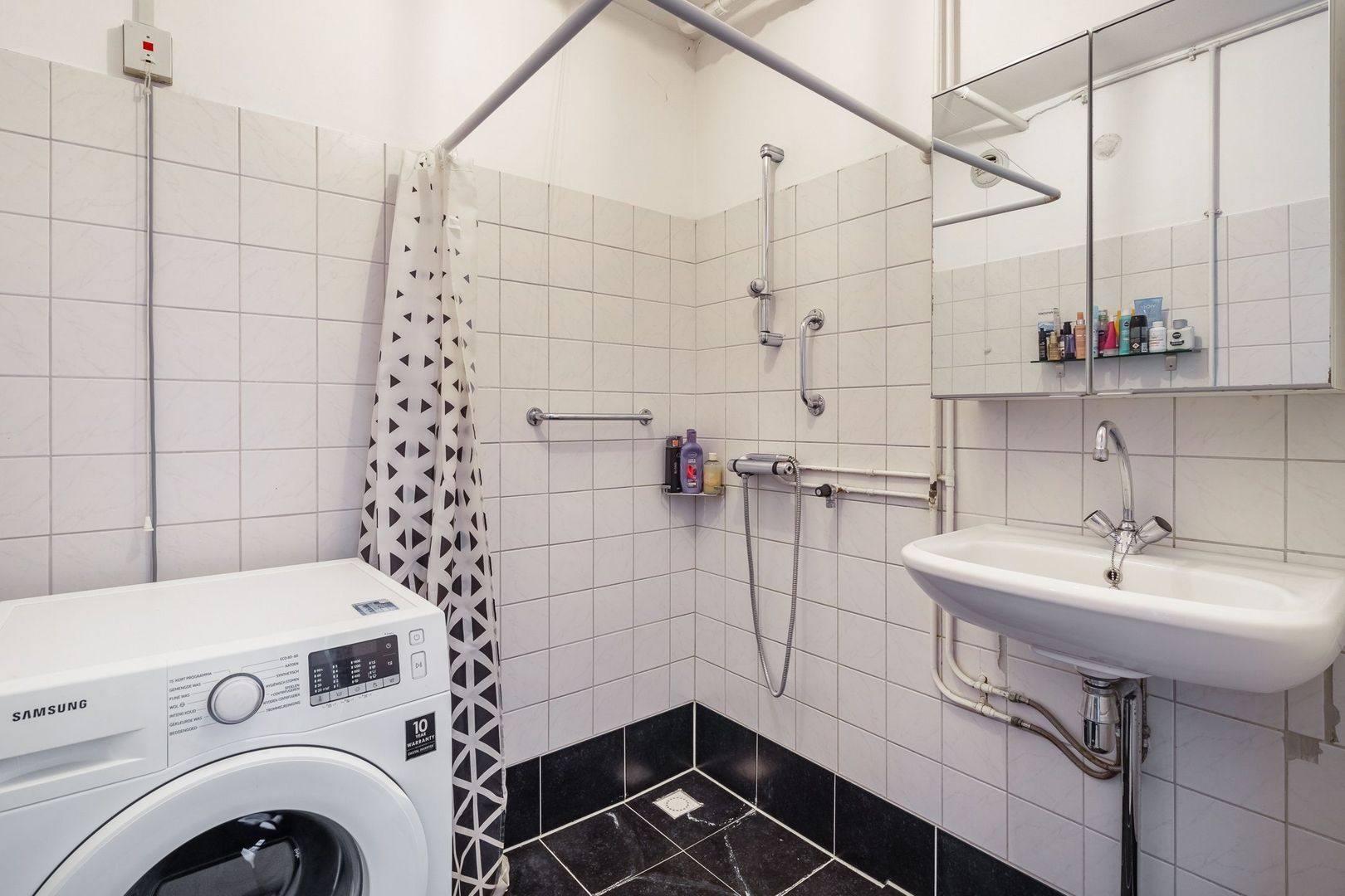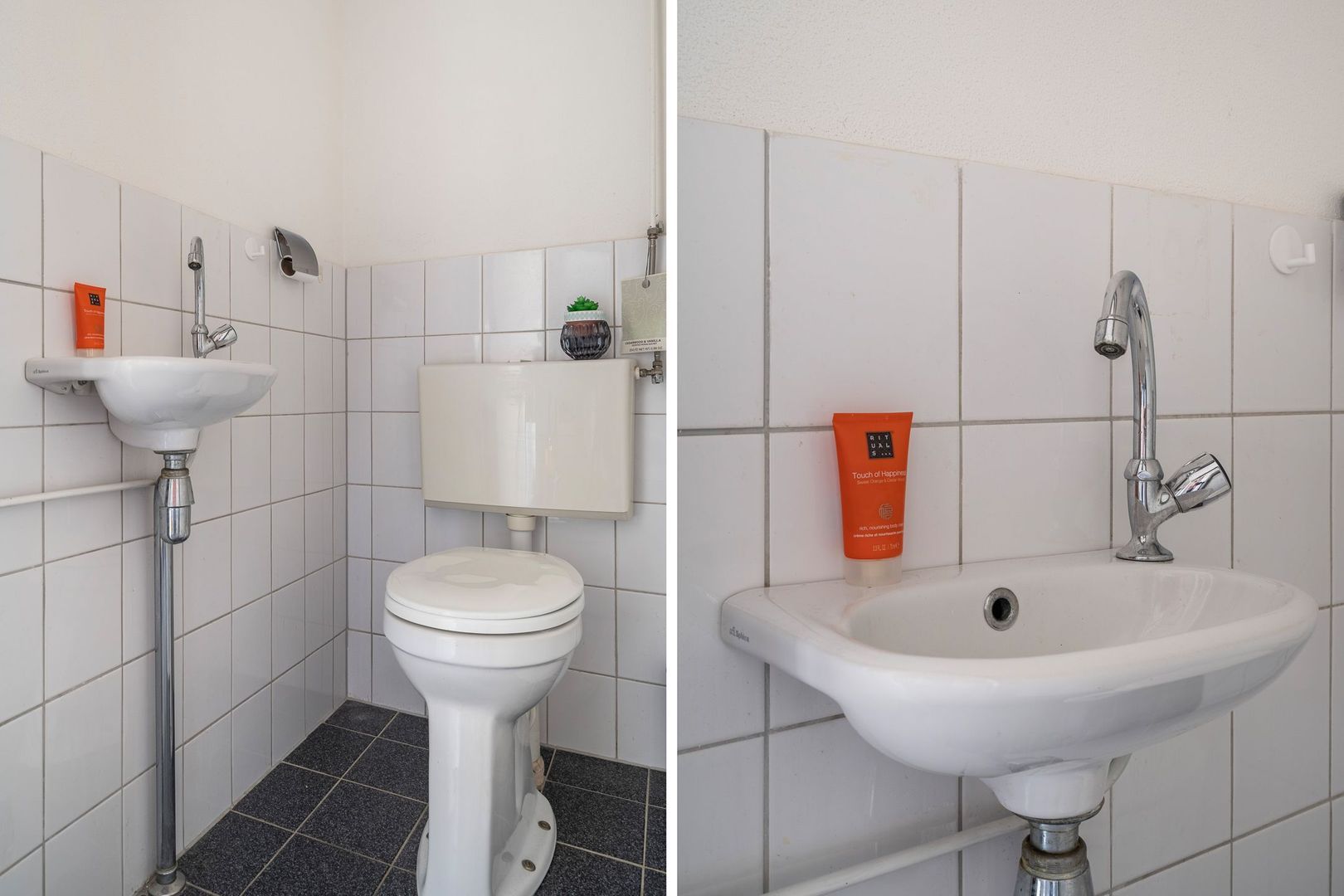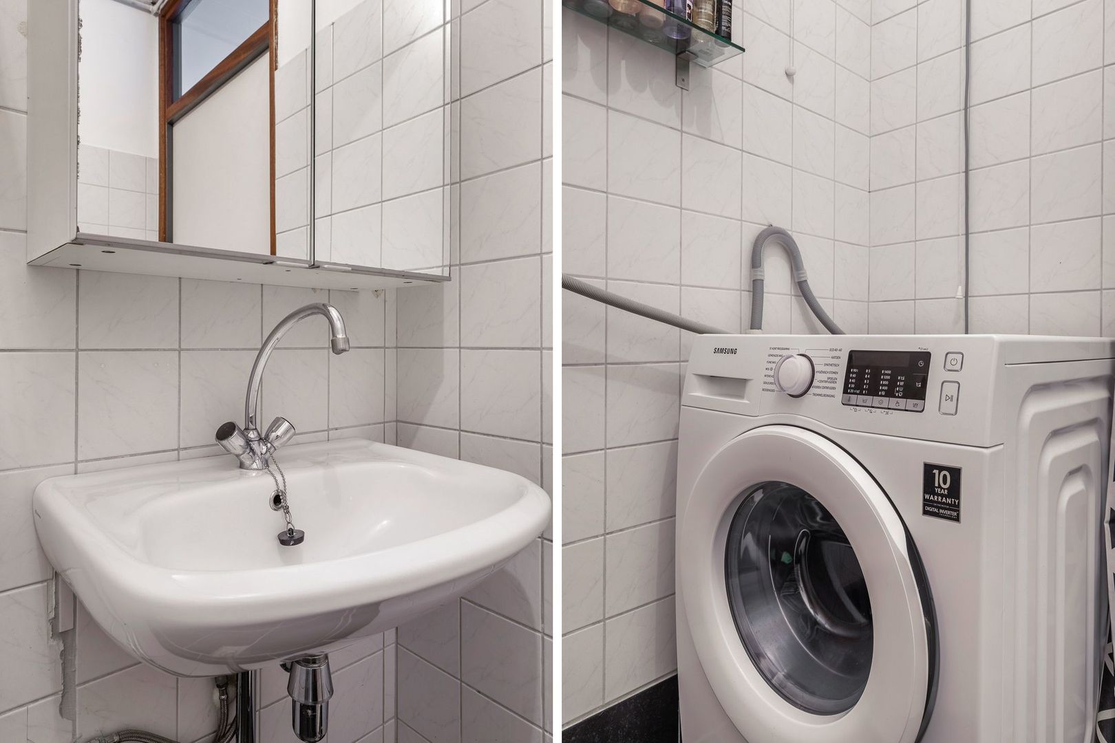 De badkamer is grotendeels betegeld en voorzien van een douchehoek, wastafel en de wasmachine aansluiting. Het naast de badkamer gelegen aparte toilet is eveneens gedeeltelijk betegeld en voorzien van een fonteintje. In een ruime inpandige bergkast hangt een moderne elektrische boiler van maar liefst 120 liter.