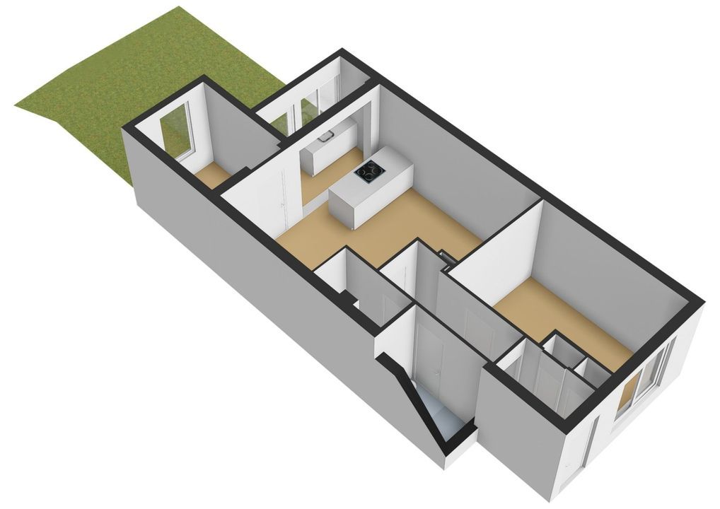 De begane grond van deze woning bestaat uit een woonkamer, keuken, en twee slaapkamers. De woonkamer is een fantastisch vertrek waar je kunt genieten van gezellige avonden met vrienden of familie. De keuken is modern uitgerust voorzien van inbouwappartuur en hardstenen aanrechtblad en kookeiland, en biedt voldoende ruimte voor het bereiden van heerlijke maaltijden.