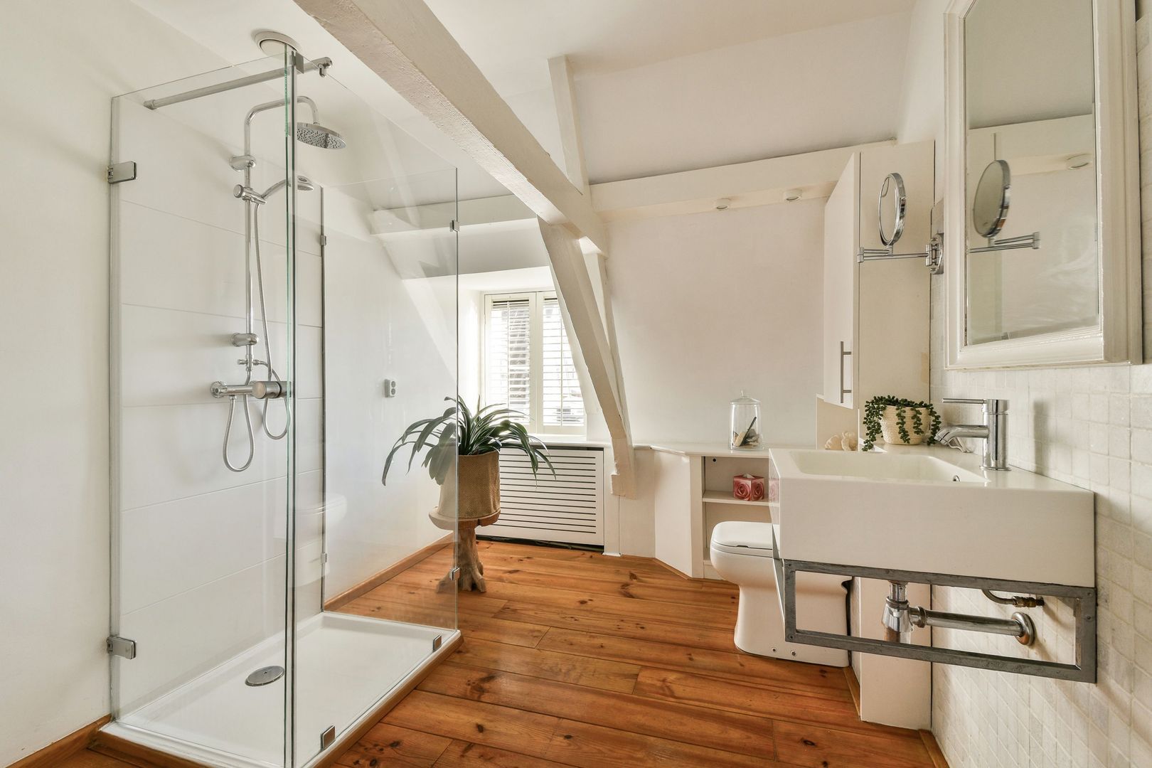 Vanuit deze slaapkamer is er toegang tot de sfeervolle, ruime en lichte badkamer met houten vloer, lichte charmante betegeling, halfvrijstaande douche met glaswanden, thermostaatkraan, regen- en handdouche, wastafel, toilet en veel kast- en bergruimte. Grote inbouwkasten met aansluiting voor wasmachine en droger, plus zijraam en dakraam. De badkamer is toegankelijk vanuit zowel de grote slaapkamer als de tussenkamer.