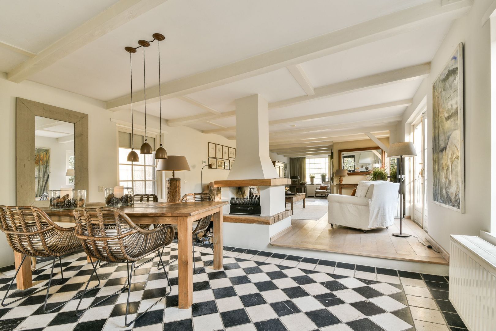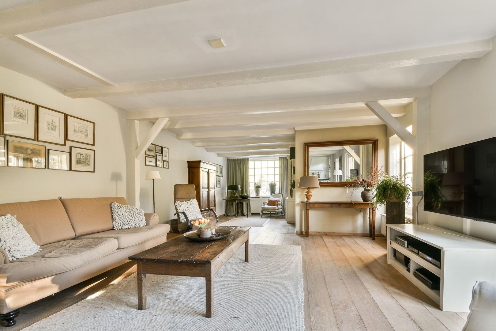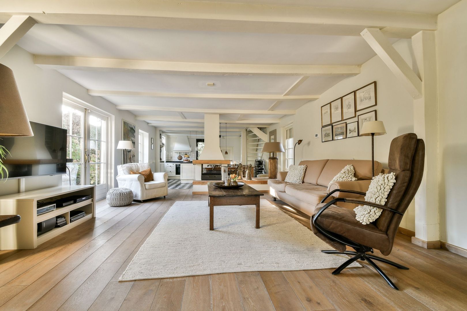 Zeer royale woonkamer van 74 m², bestaande uit meerdere in elkaar overlopende delen, met mooie eikenhouten vloerdelen, zichtbare balkenstructuur, vrijstaande schouw met tweezijdige open haard en dubbele openslaande deuren naar de tuin.
