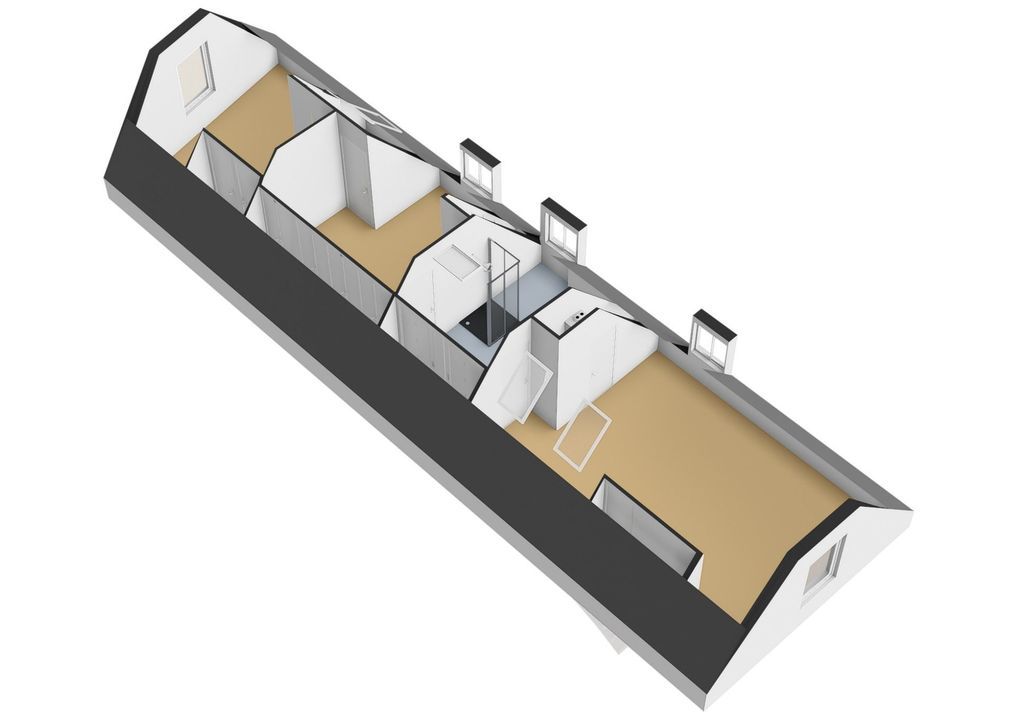Vanuit de badkamer is een vlizotrap naar de kleine bergvliering van 7 m² vloeroppervlak met een nokhoogte van 1,36 m.
