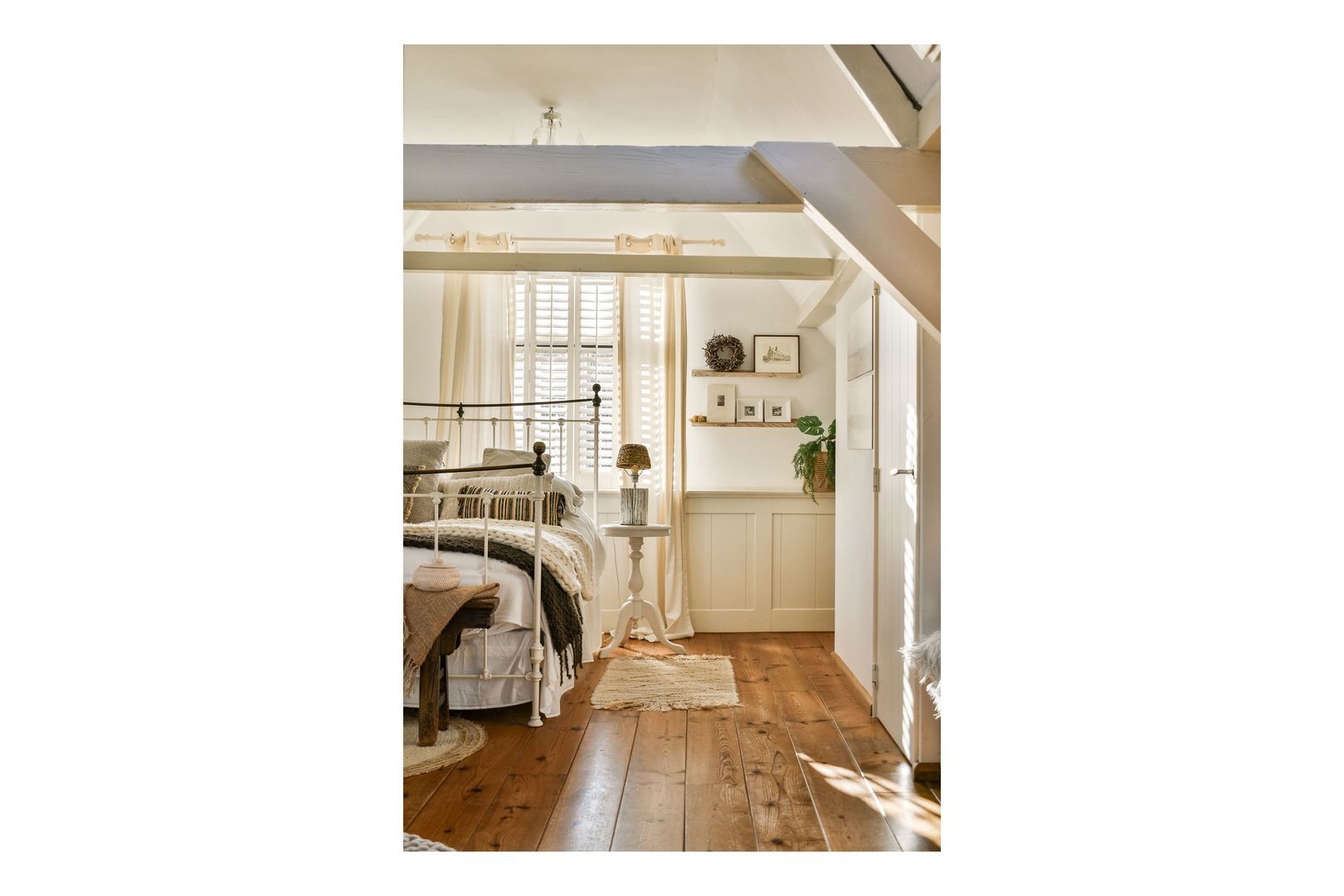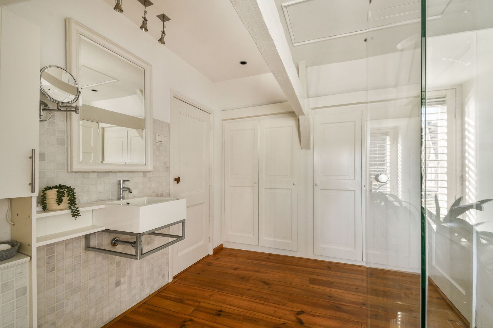 Vanuit deze slaapkamer is er toegang tot de sfeervolle, ruime en lichte badkamer met houten vloer, lichte charmante betegeling, halfvrijstaande douche met glaswanden, thermostaatkraan, regen- en handdouche, wastafel, toilet en veel kast- en bergruimte. Grote inbouwkasten met aansluiting voor wasmachine en droger, plus zijraam en dakraam. De badkamer is toegankelijk vanuit zowel de grote slaapkamer als de tussenkamer.