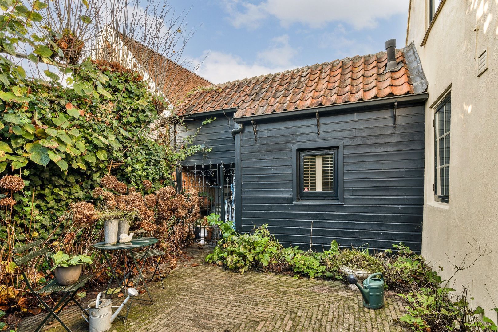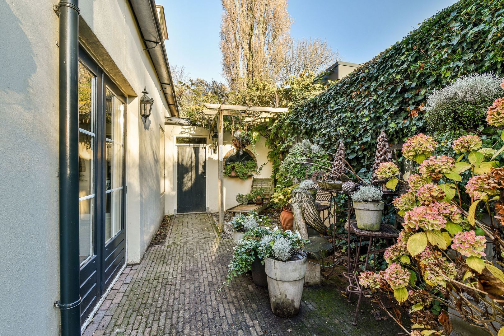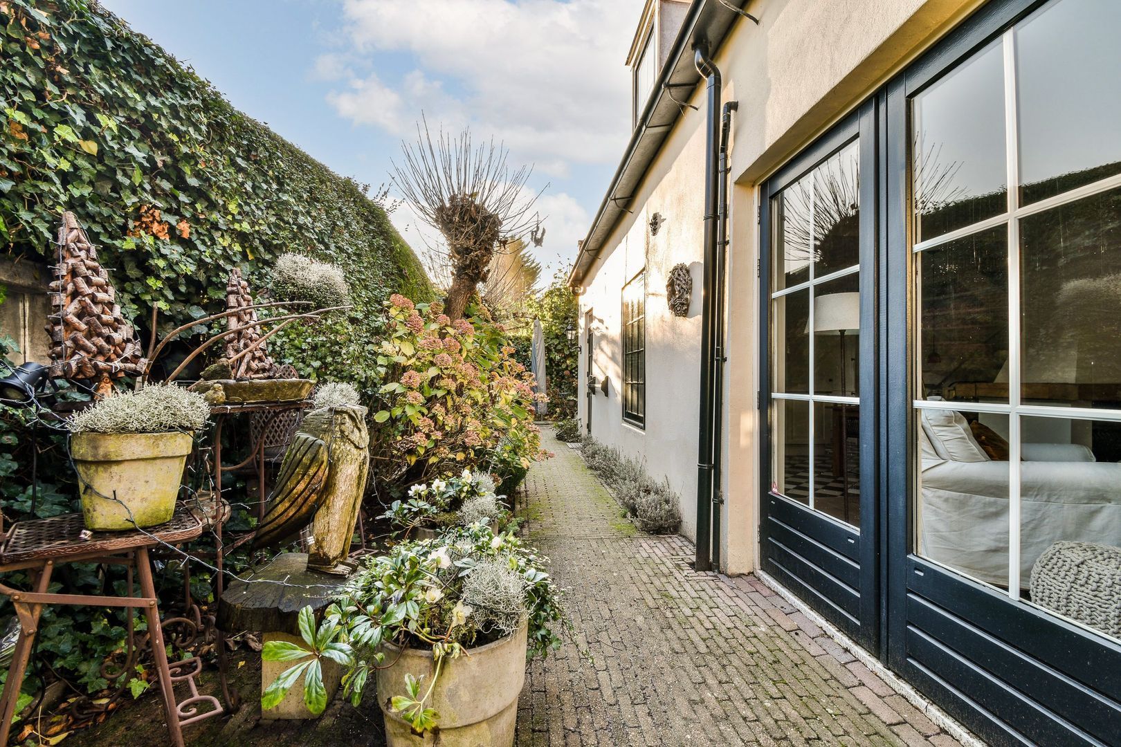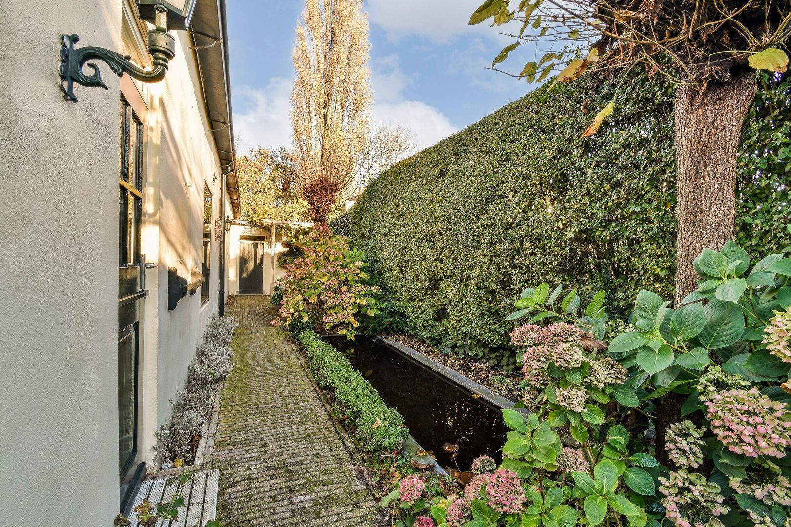Lange, sfeervolle zij- en achtertuin van in totaal ca. 62 m², heerlijk op het zonnige zuidwesten gelegen, met vijver, veel groen en diverse zithoeken.
