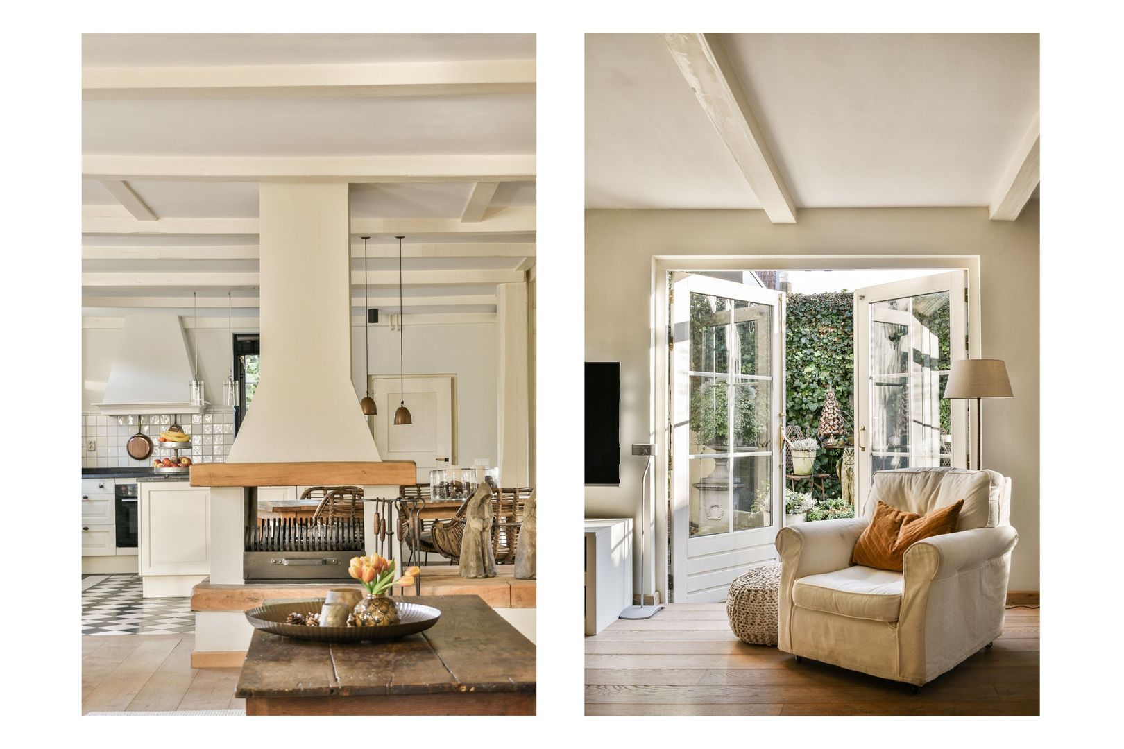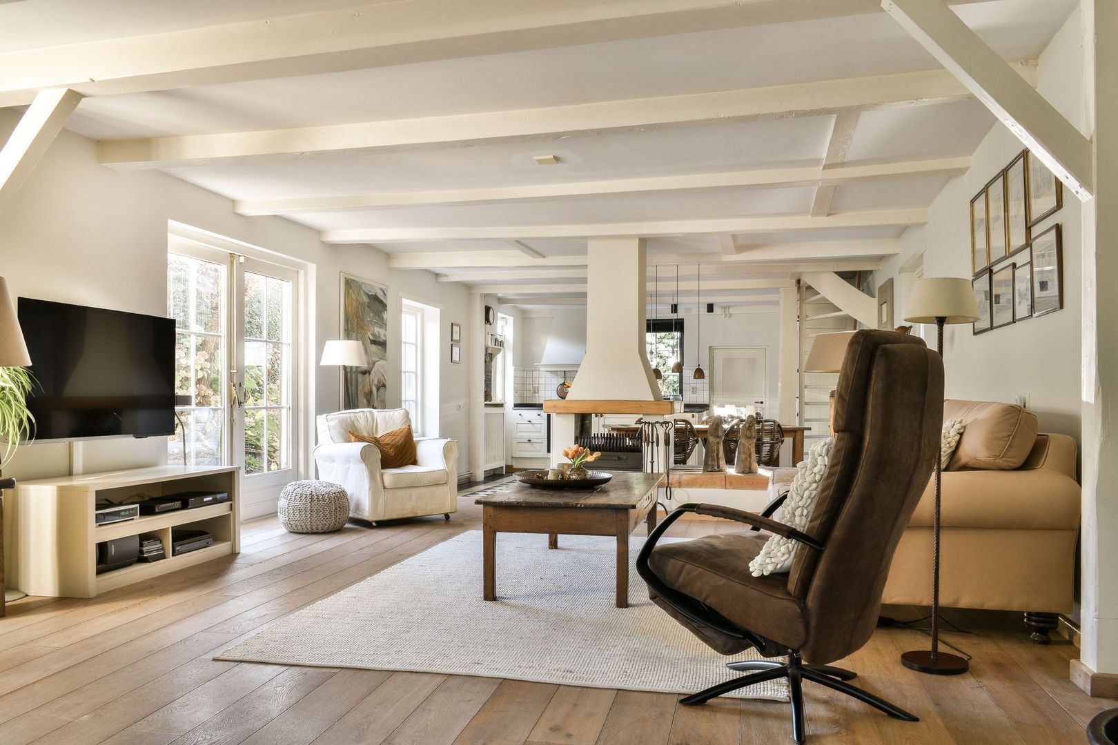 Zeer royale woonkamer van 74 m², bestaande uit meerdere in elkaar overlopende delen, met mooie eikenhouten vloerdelen, zichtbare balkenstructuur, vrijstaande schouw met tweezijdige open haard en dubbele openslaande deuren naar de tuin.