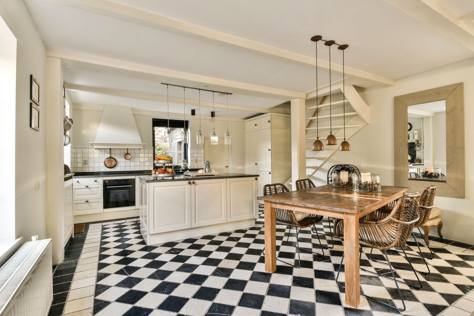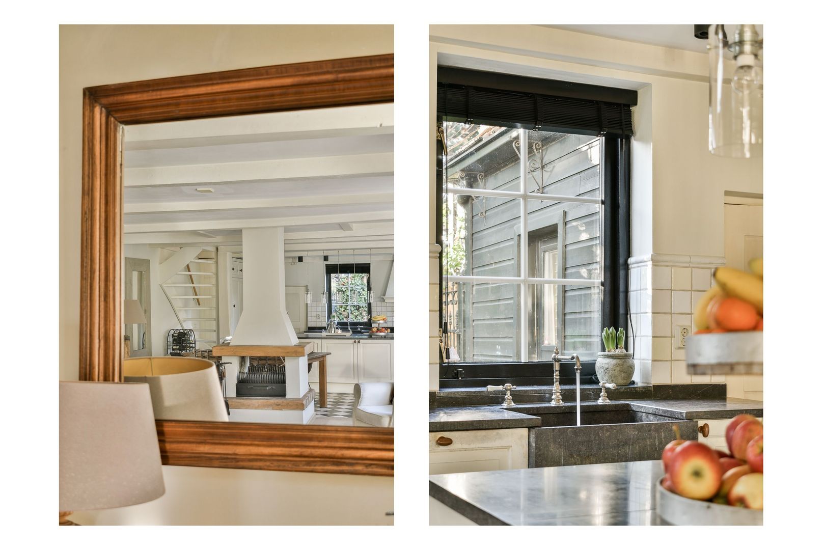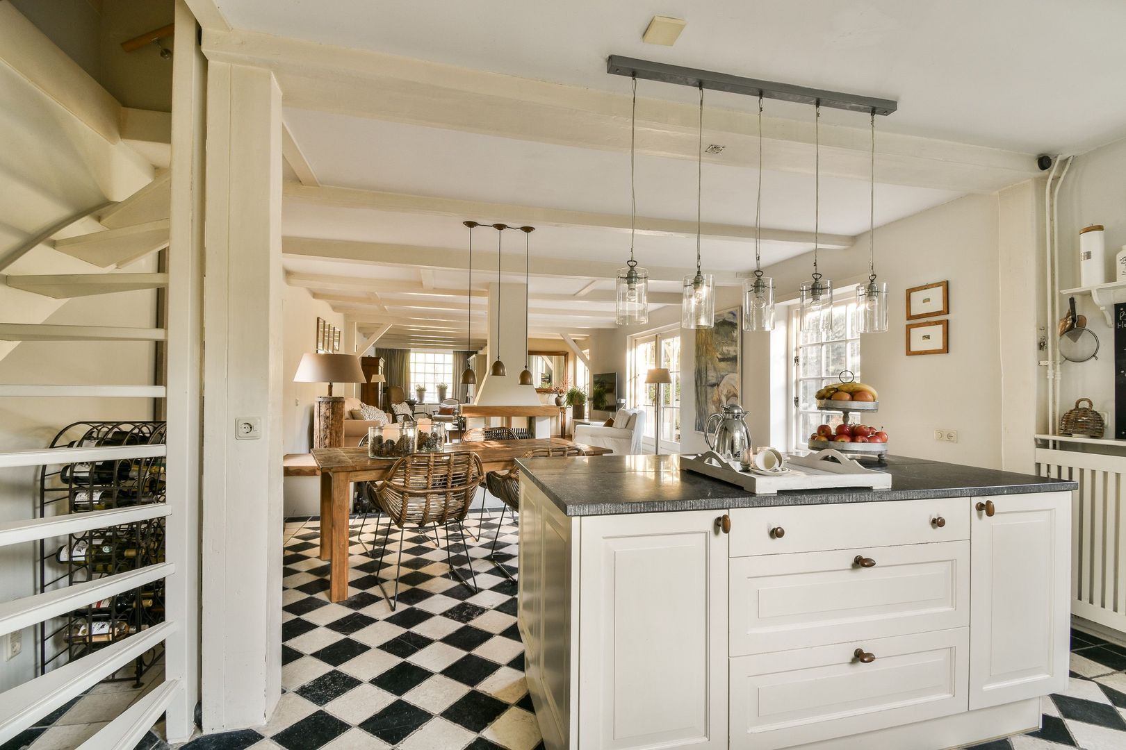 De aansluitende open keuken heeft dankzij ramen aan weerszijden veel lichtinval. De leef keuken is voorzien van een prachtige zwart-wit geblokte tegelvloer van getrommeld marmer, een Belgisch hardstenen aanrechtblad, betegelde achterwand, werkeiland, veel kastruimte en de volgende apparatuur: inductiekookplaat, heteluchtoven, vaatwasser, koelkast en 3-laden vriezer.