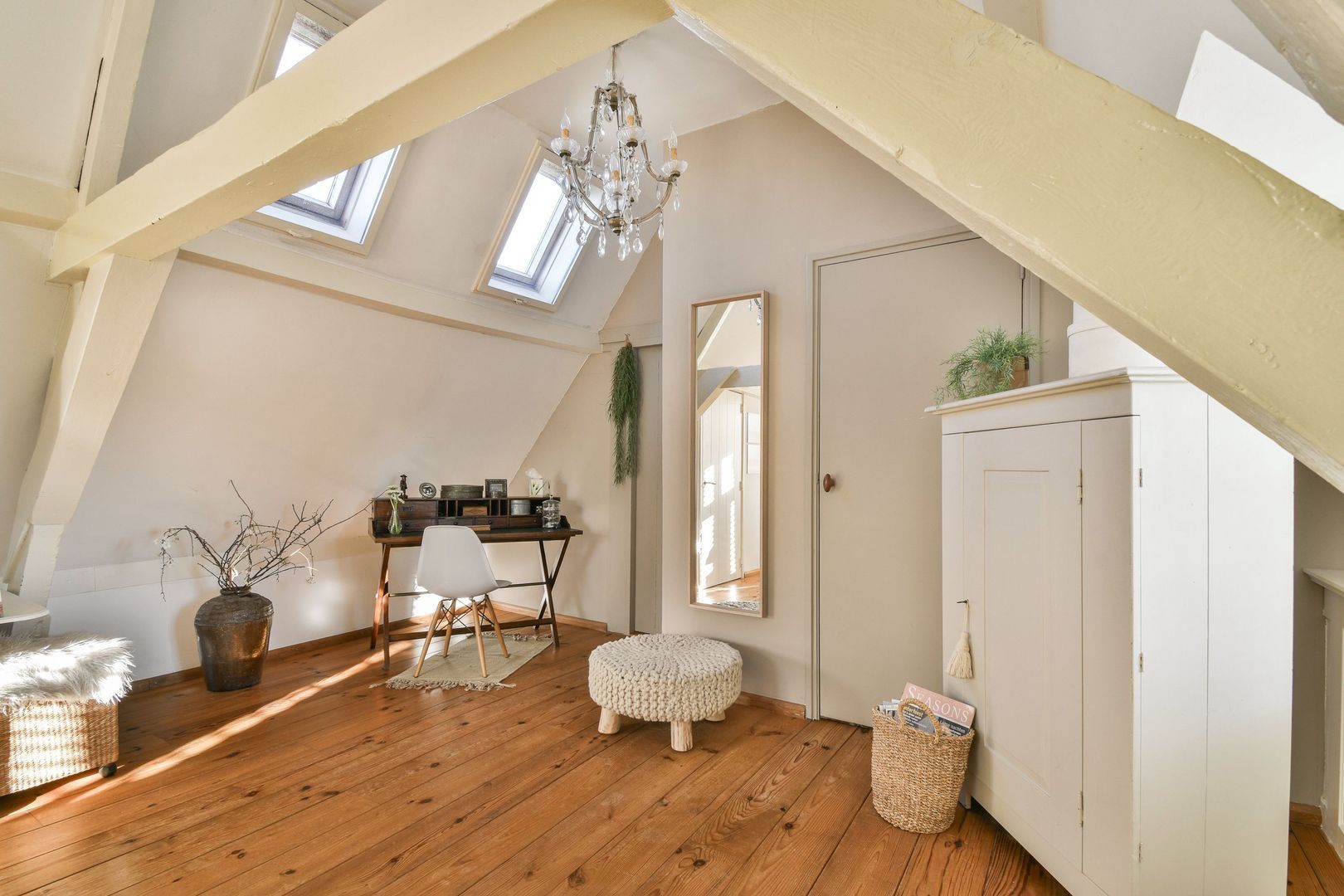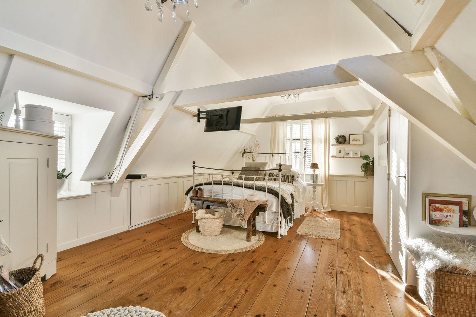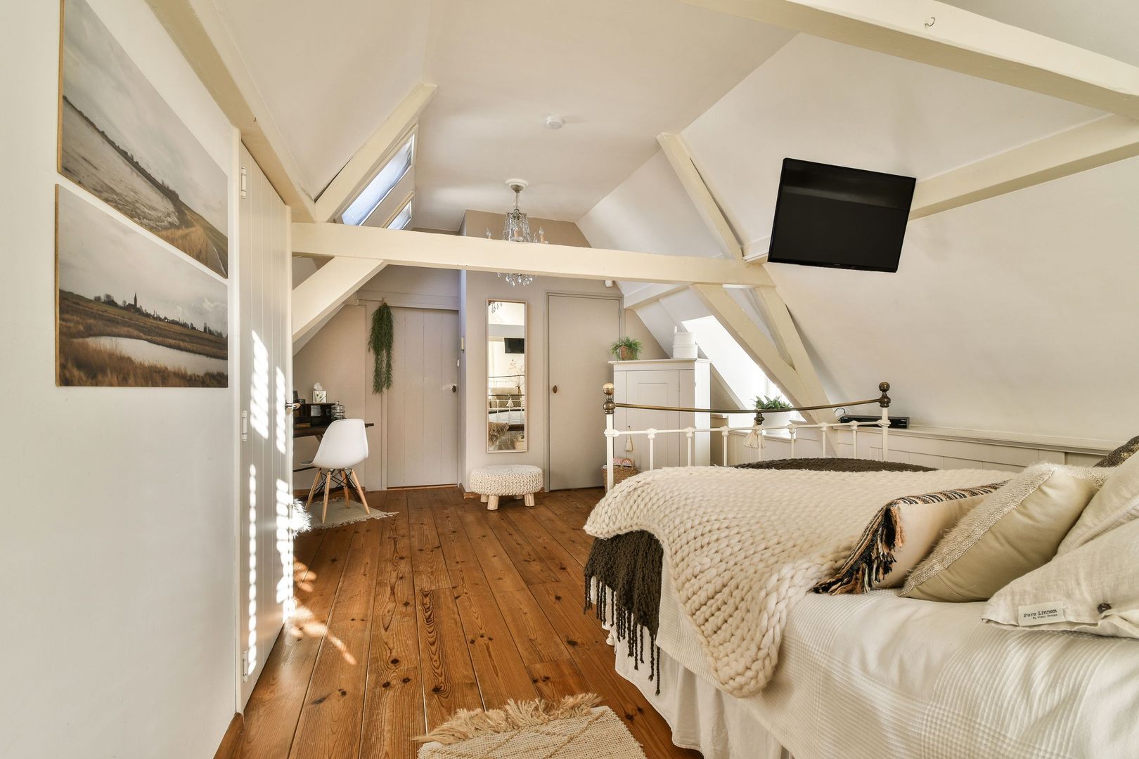 Ruime hoofdslaapkamer van 27 m² aan de achterzijde, bereikbaar zowel via de tussenkamer als via de trap vanuit de keuken. Voorzien van houten vloer, dakkapel aan de zijkant, extra raam aan de achterzijde, twee dakramen, mooie balkenstructuur en lambrisering. Grote vaste kast met opstelling van de cv-ketel.