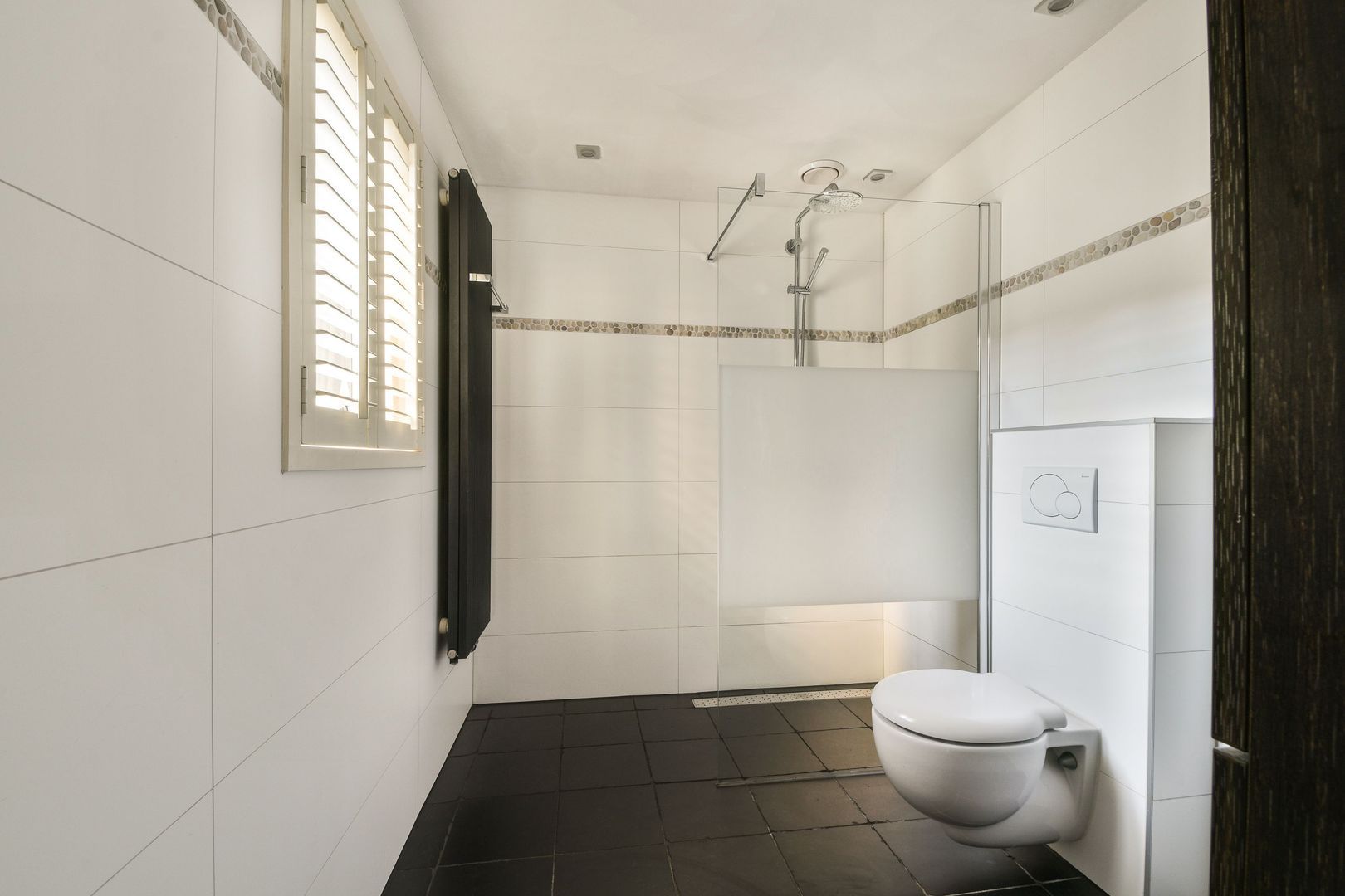 Aan de achterzijde van de woning, in de uitbouw, bevindt zich een moderne badkamer met zwarte tegelvloer, wit betegelde wanden met charmante accentstrip, daglicht via venster met houten shutters, inloopdouche met watergoot, glasscherm, thermostaatkraan, regen- en handdouche, vrij hangend toilet, wastafelmeubel en bergkast, verlichte spiegel en inbouwspots in het plafond.