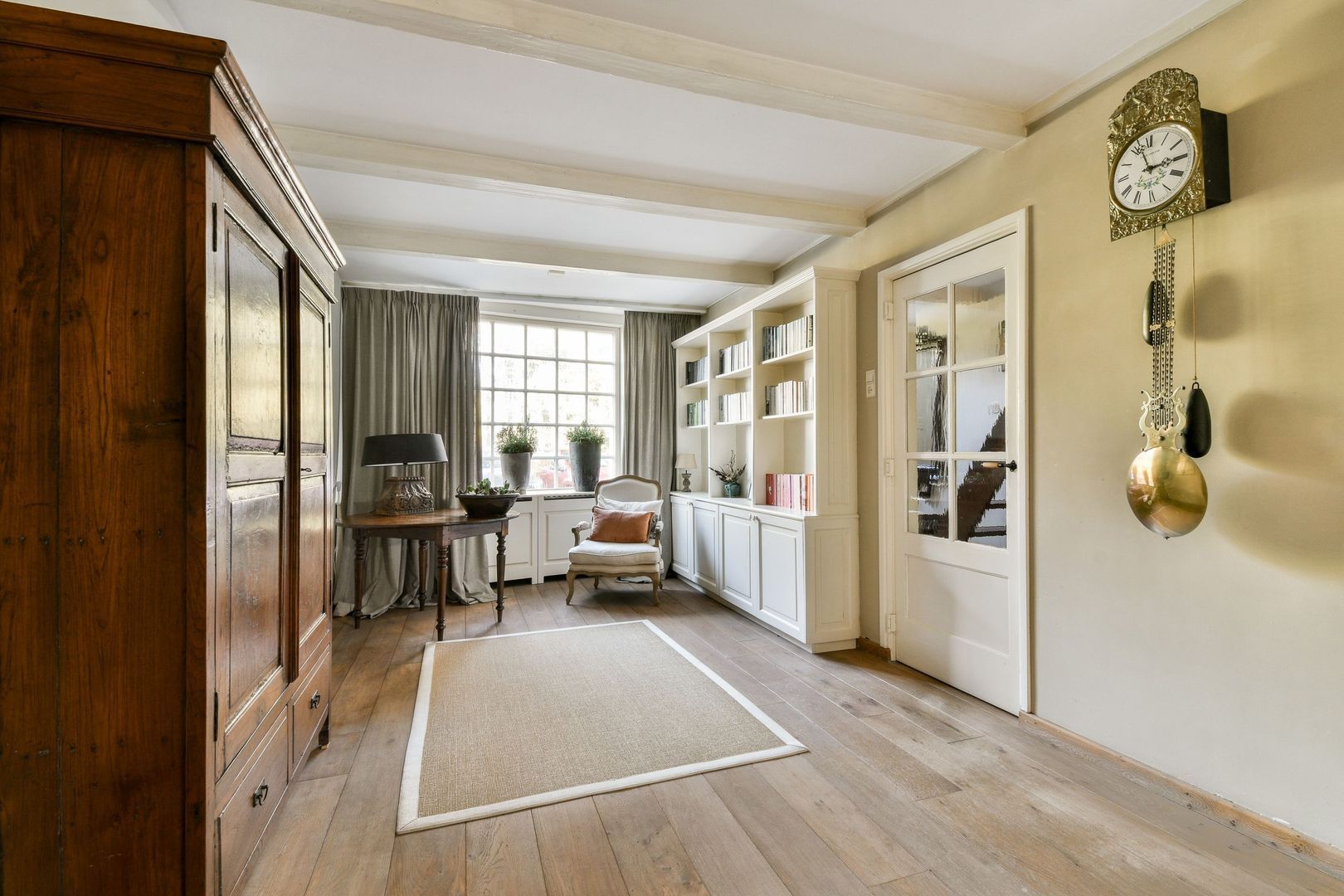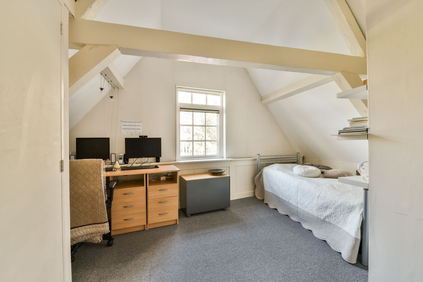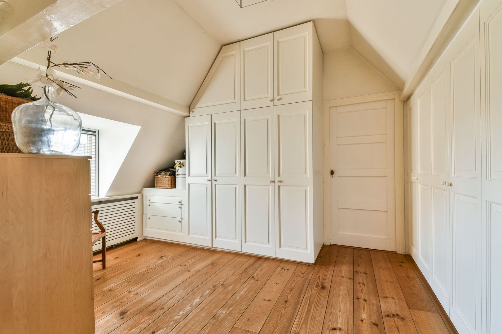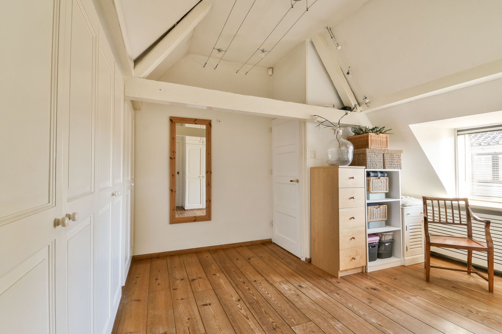 Tussenkamer van 19 m², te gebruiken als slaapkamer of als studeer- of zitkamer, met veel bergruimte in inbouwkasten, waaronder een kamerbrede kast. Houten vloer en dakkapel.