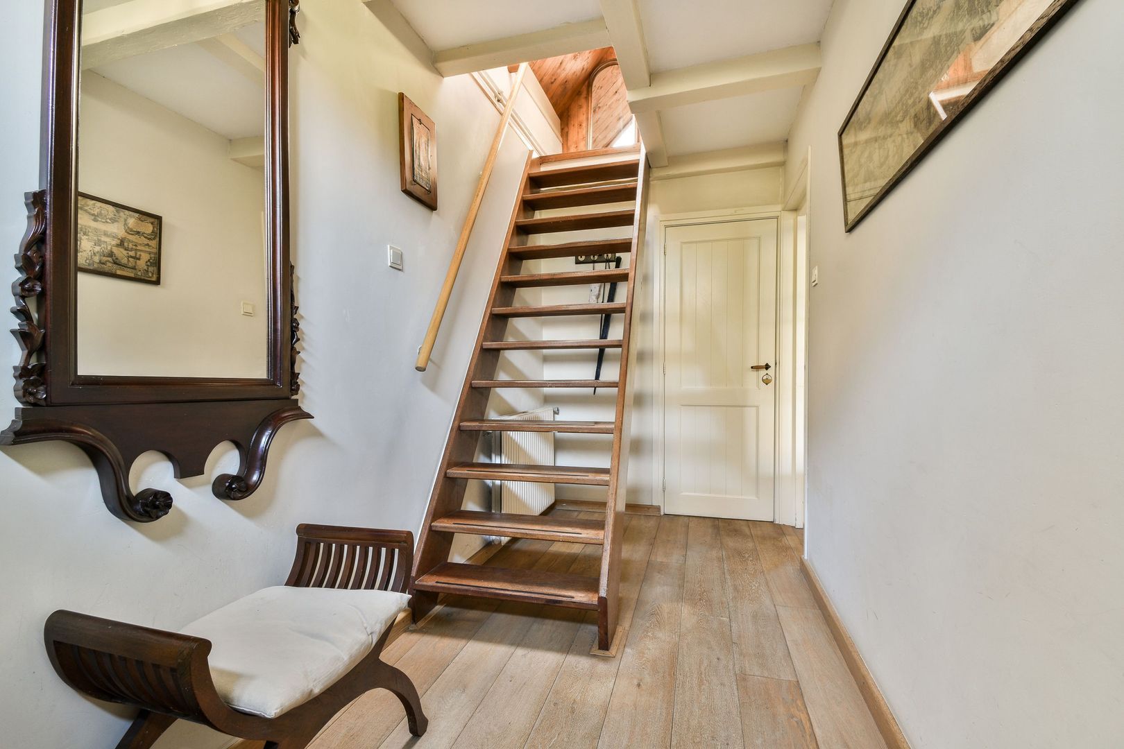 Entree met houten vloer en hardhouten trap naar de voorzijde van de eerste verdieping.