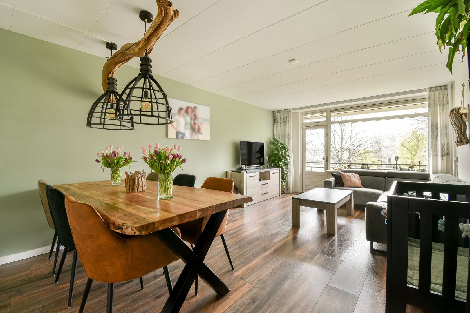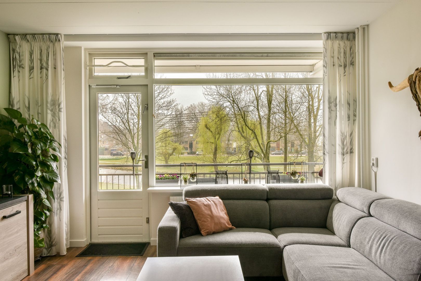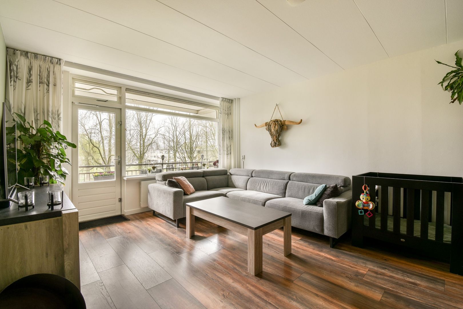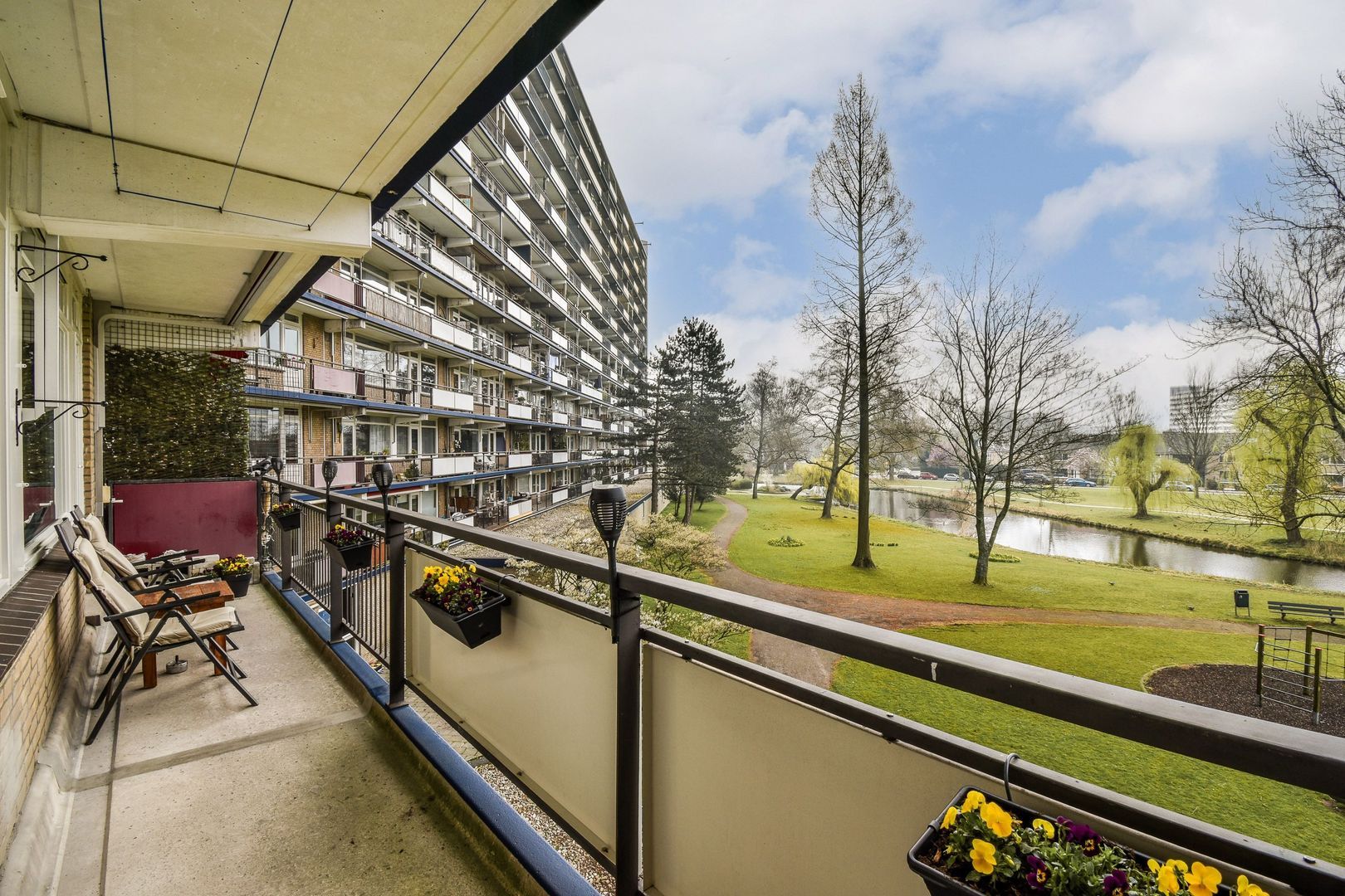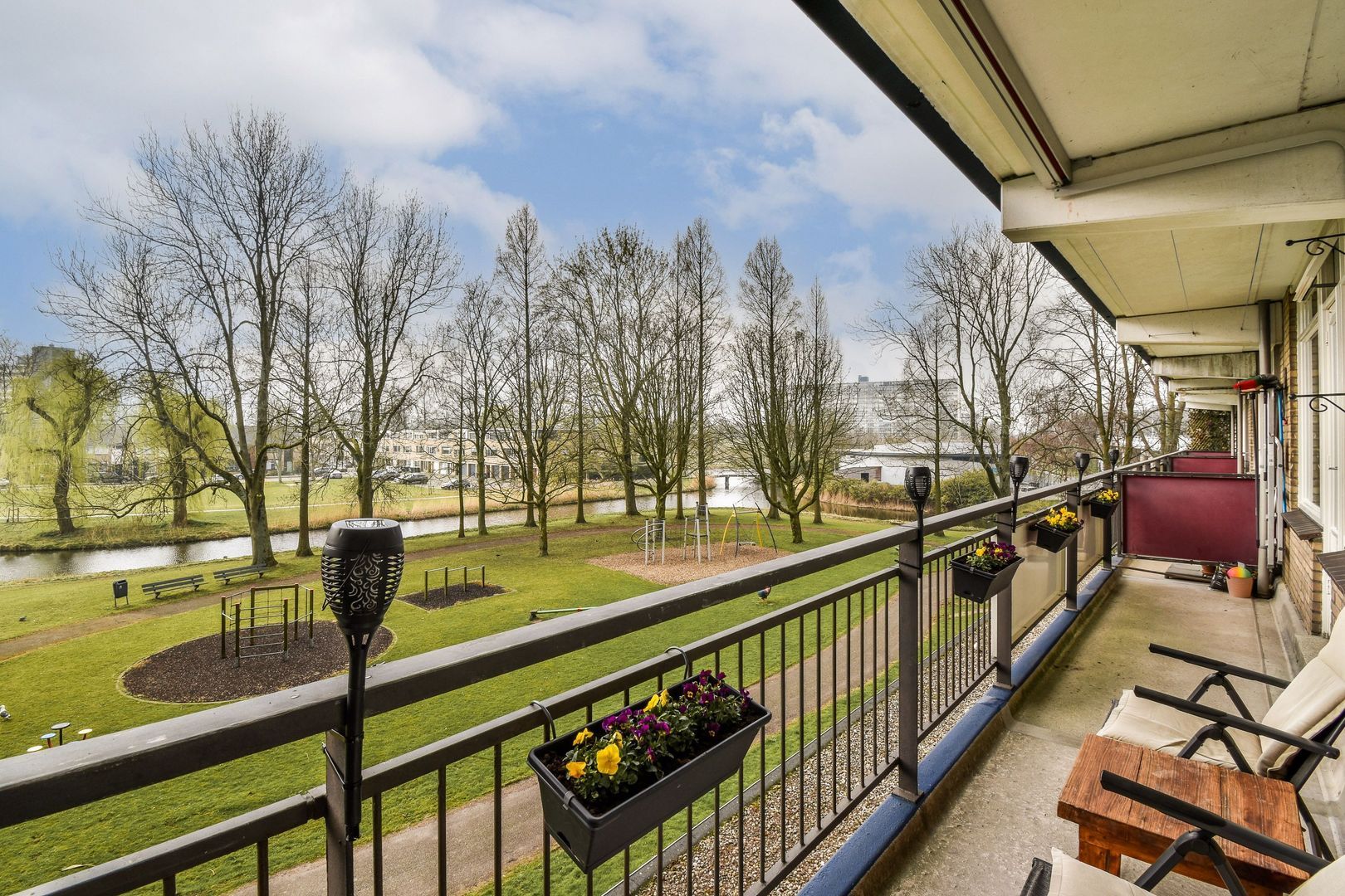 Via de woonkamer bereikt u het ruime, zonnige balkon met prachtig uitzicht op het groen en de speeltuin.