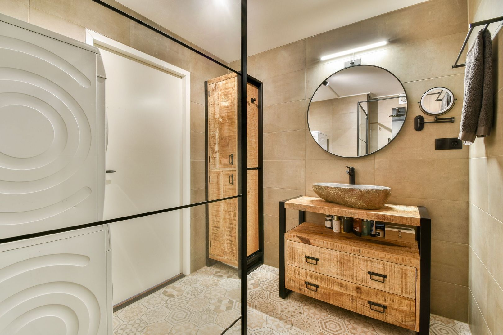 De badkamer is vergroot en telt nu ruim 5 m2 en is voorzien van een inloopdouche, luxe wastafel, wasmachine aansluiting, een kolomkast en fraaie betegeling.